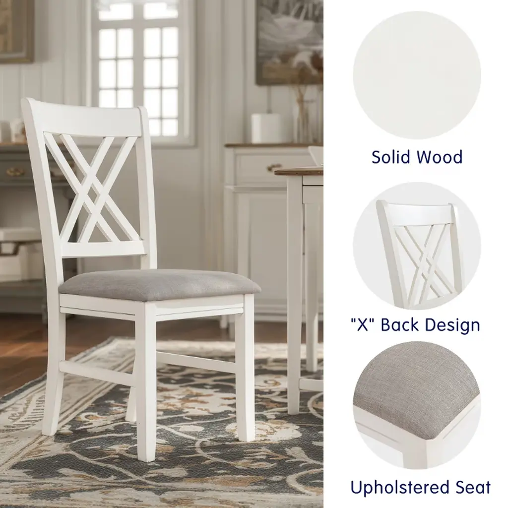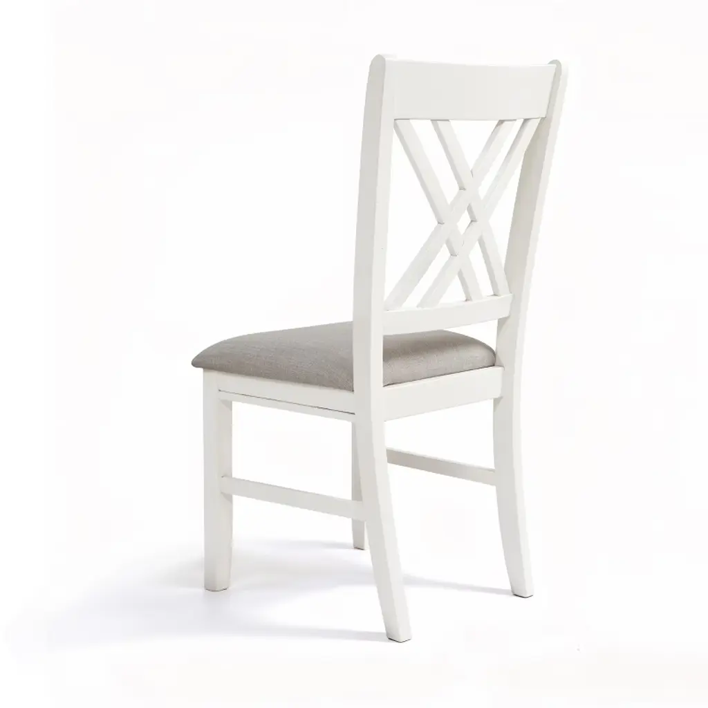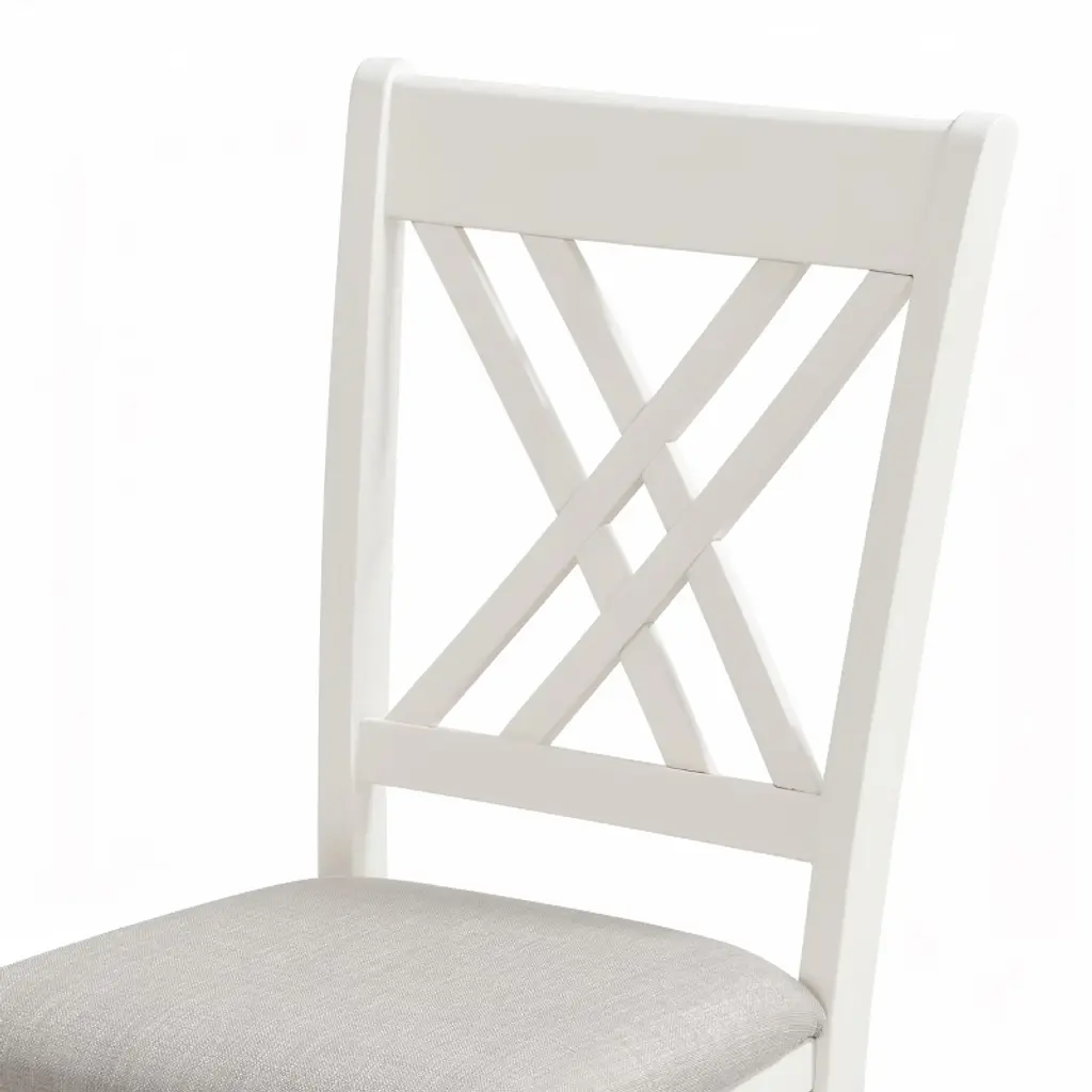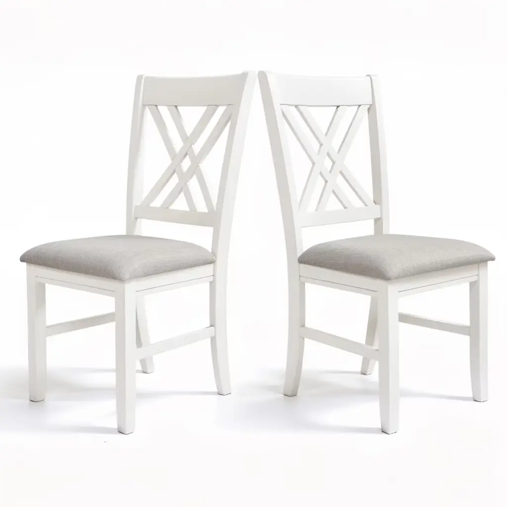 These versatile X-back side chairs feature a sturdy solid wood frame with four legs in a warm white finish, designed to complement both dining and living spaces. The generously padded foam cushion is upholstered in durable rustic crosshatch fabric, offering both comfort and style. With their coordinating painted finish, these chairs seamlessly match your existing dining set while maintaining easy-care practicality - simply spot clean with a damp cloth.