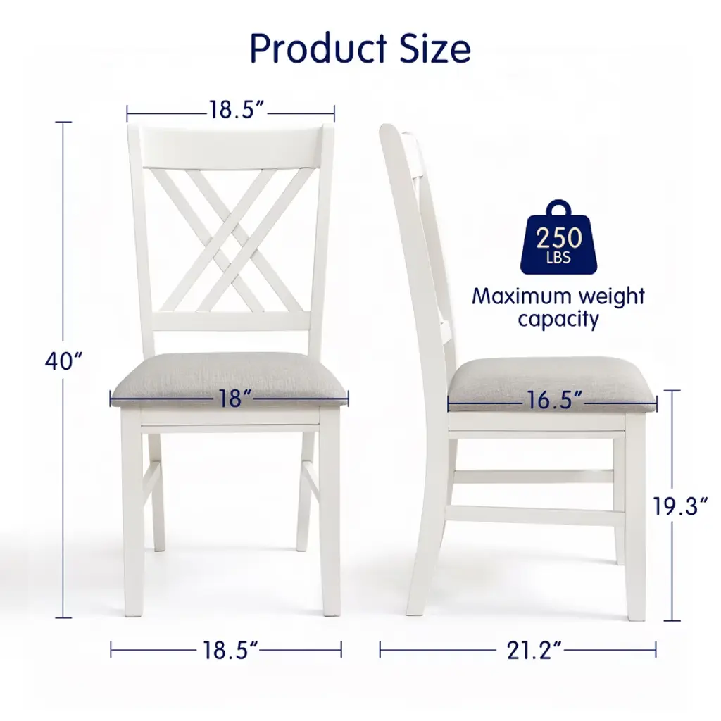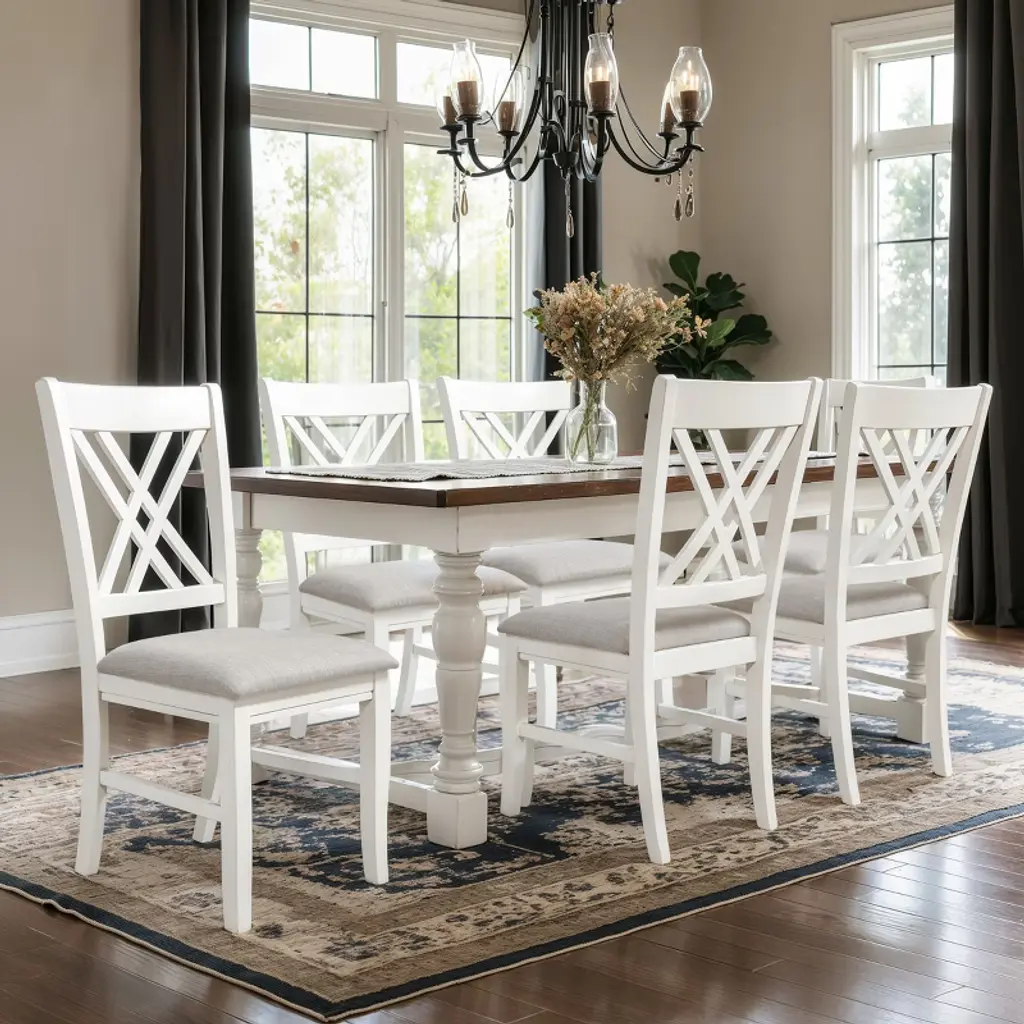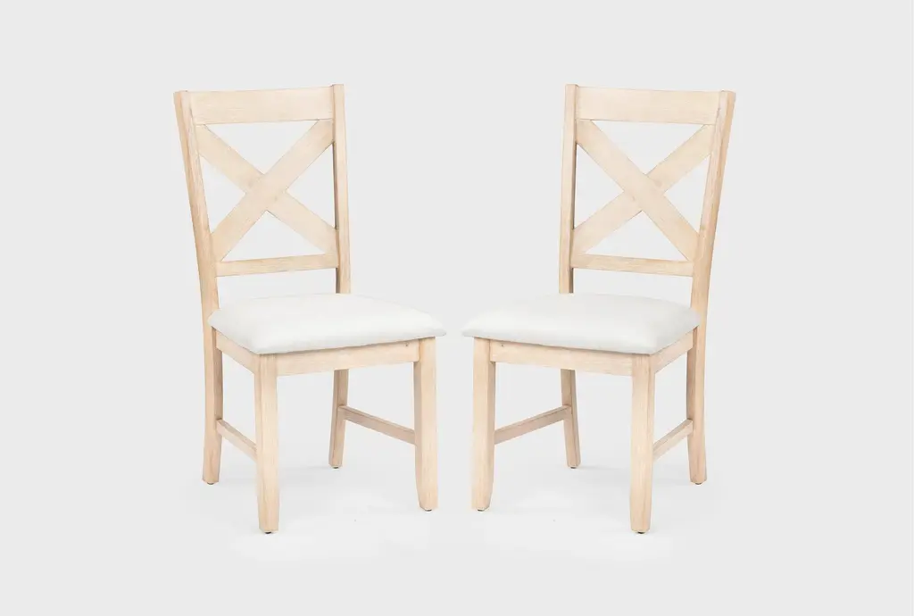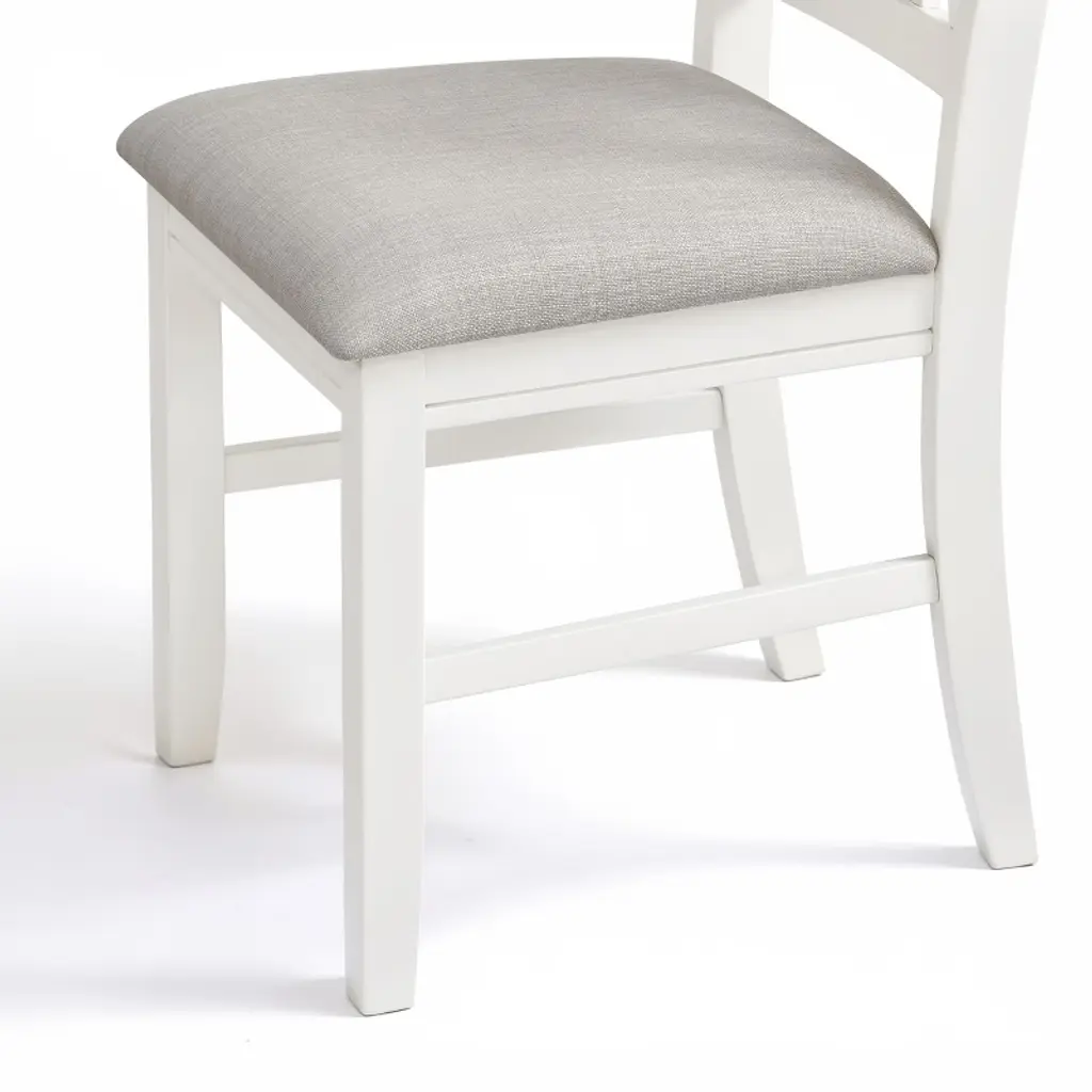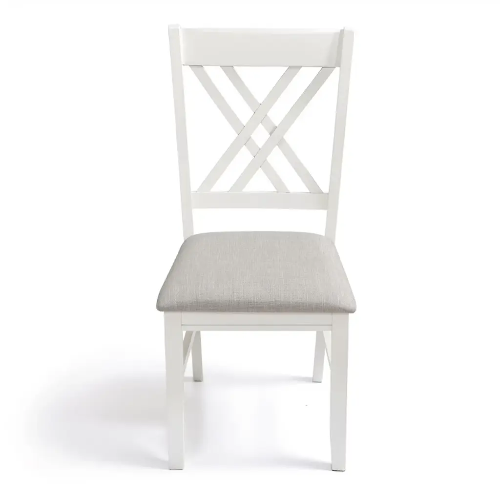 These versatile X-back side chairs feature a sturdy solid wood frame with four legs in a warm white finish, designed to complement both dining and living spaces. The generously padded foam cushion is upholstered in durable rustic crosshatch fabric, offering both comfort and style. With their coordinating painted finish, these chairs seamlessly match your existing dining set while maintaining easy-care practicality - simply spot clean with a damp cloth.