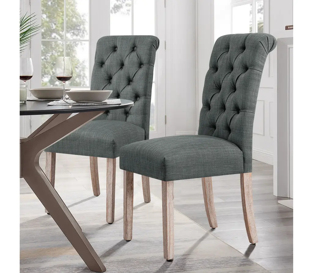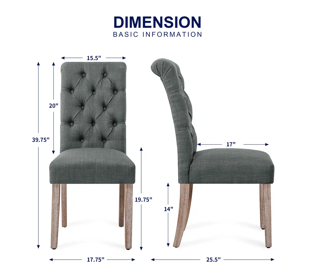 Add elegance and comfort to your dining space with this beautifully upholstered button-tufted dining chair. Enjoy the soft yet supportive foam cushion, perfect for lingering conversations or cozy meals. Available in versatile gray, deep gray, and rich navy, this chair complements any decor style. Enhance your dining area with style and comfort—elevate your home’s ambiance today.