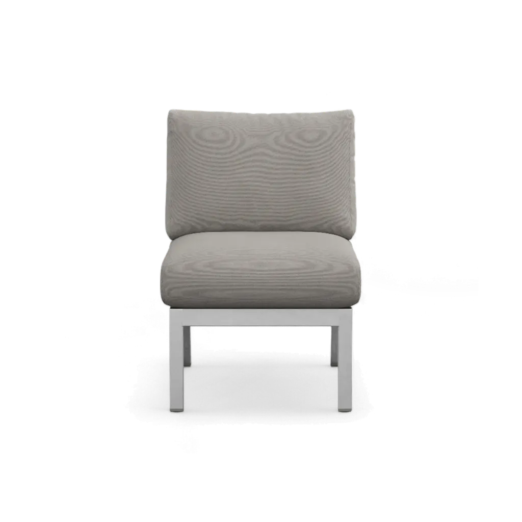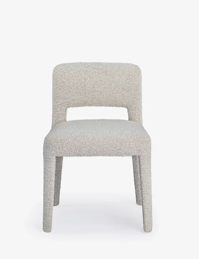 Et Voila! You have discovered the perfect side chair for any room. Its square back is fully upholstered in Pumice Performance Suede. The cushion and base are dressed in in a handsome light, Mottled Grey tweed. The legs have a wooden base in Dark Chocolate. The legs are positioned in such a way that they are able to nestle the Et Voila Ottoman under the chair.