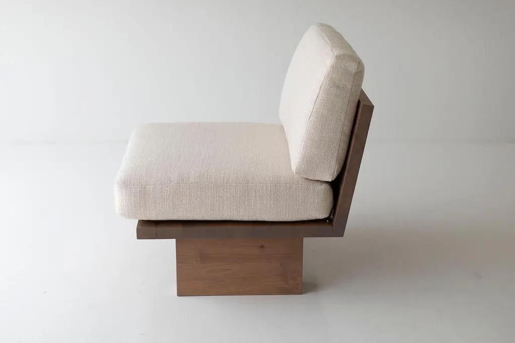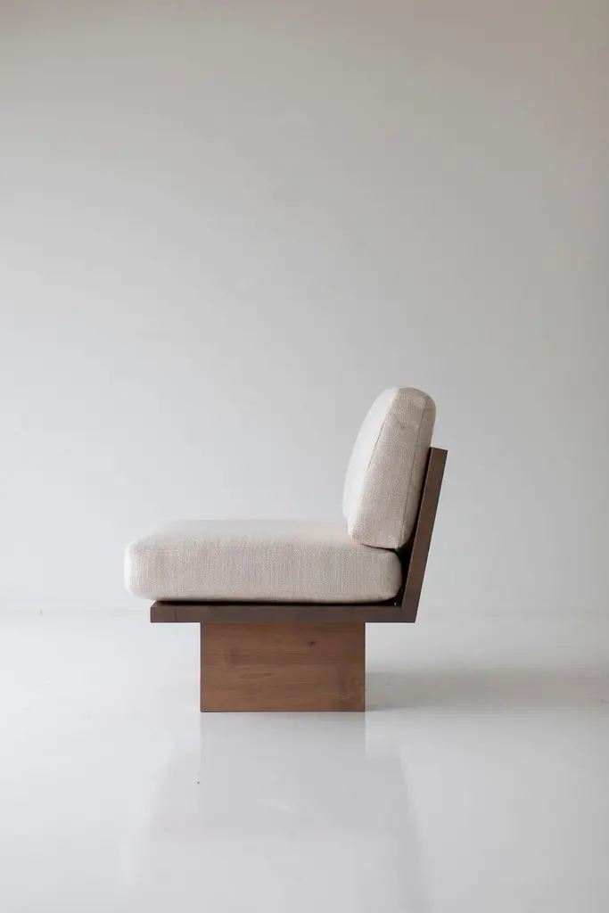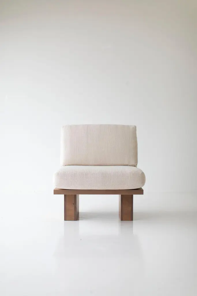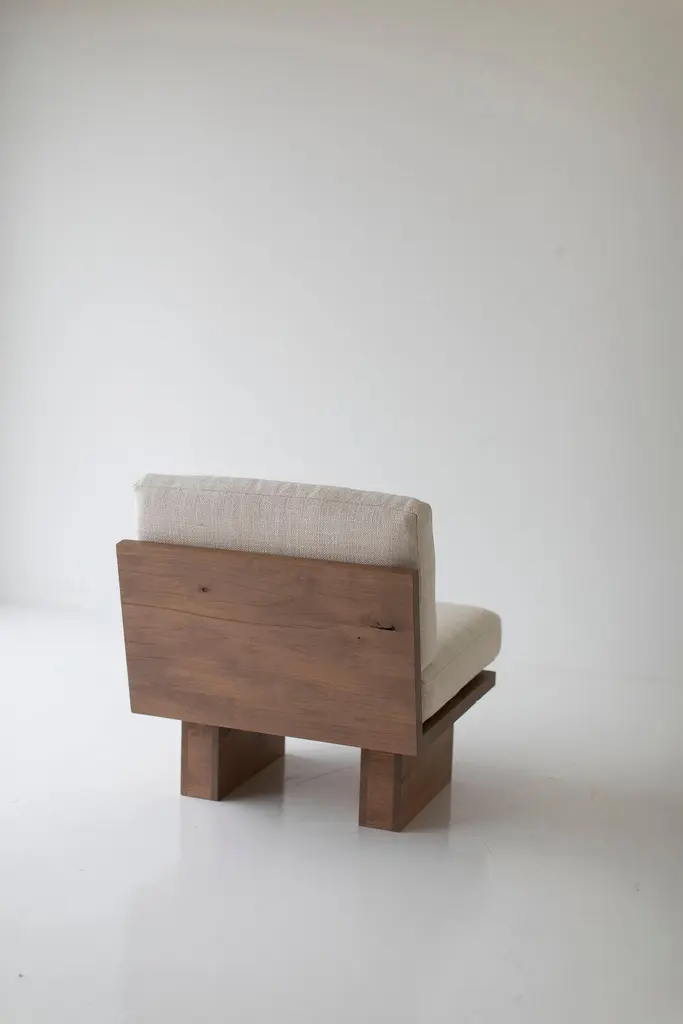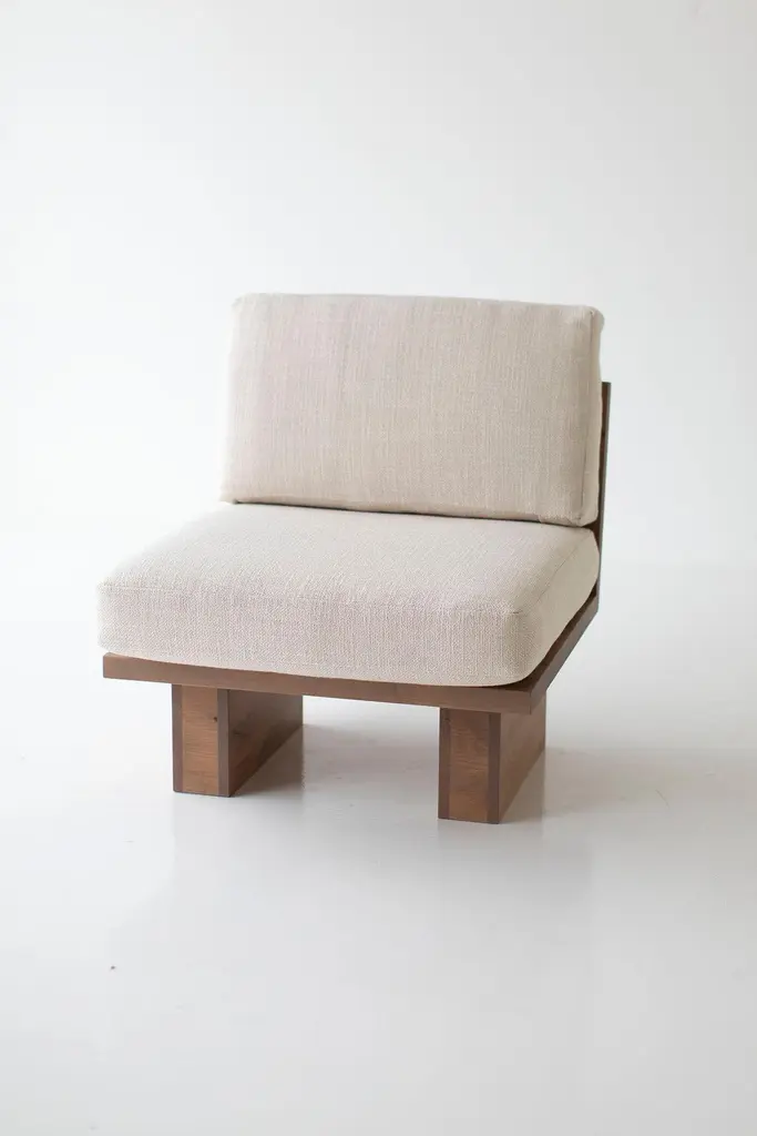 This Suelo® modern side chair is beautifully constructed from solid wood in Ohio, USA. The lounge chair's silhouette is simple, modern, and sleek with comfortable back and seat cushions. This is the perfect chair for any space, indoor or outdoor. The Suelo® Collection consists of an arm chair, side chair, bench, daybed, loveseat, ottoman, dining chairs - both arm and side, and multiple orientations of sofas/sectionals for indoor or outdoor use. You can get any Suelo® piece in a solid or slatted version. This specific wood species is for indoor only; please contact for outdoor options. Price includes thick weave fabric and finish of your choice - natural, grey-wash, walnut, and black. Multiple fabric colors available.This chair is for indoor use! Please contact us or find our other Suelo® listings for the outdoor version.Designer inspiration: "The Suelo® Collection was inspired by my love for travel. So many places that inspire me have very minimal furniture, often built-in sofas with big comfy cushions, hammocks, raw natural wood, etc. The feel is low-key, simple, and comfortable. The wood isn't refined, it just IS. Functionality always plays into my designs as well, represented here by lower seating for a more intimate talking or lounging environment, and the platform wood extension detail on the sofa, which makes a great little table for your drink or cell phone. I envision this furniture used for indoor/outdoor spaces or any room that needs some comfort or relief. The Suelo® line reminds me of your own getaway - it has a natural, cool vibe and doesn't take itself too seriously. I imagine the sofa loaded up with pillows and some music playing in the background, of course." -Gretta JonesspecsPeriod/Model: New; ModernSpecs: Solid knotty alder, grey wash commercial grade finishCustomizable: Yes! It's what we do :)DimensionsH 31.5" W 28.5" D 31"Seat H 16"Seat W 28.5" Seat D 21" with back cushion, 27" withoutFrom the time of purchase, please allow 3-4 weeks for production. Shipping time varies dependent on location.