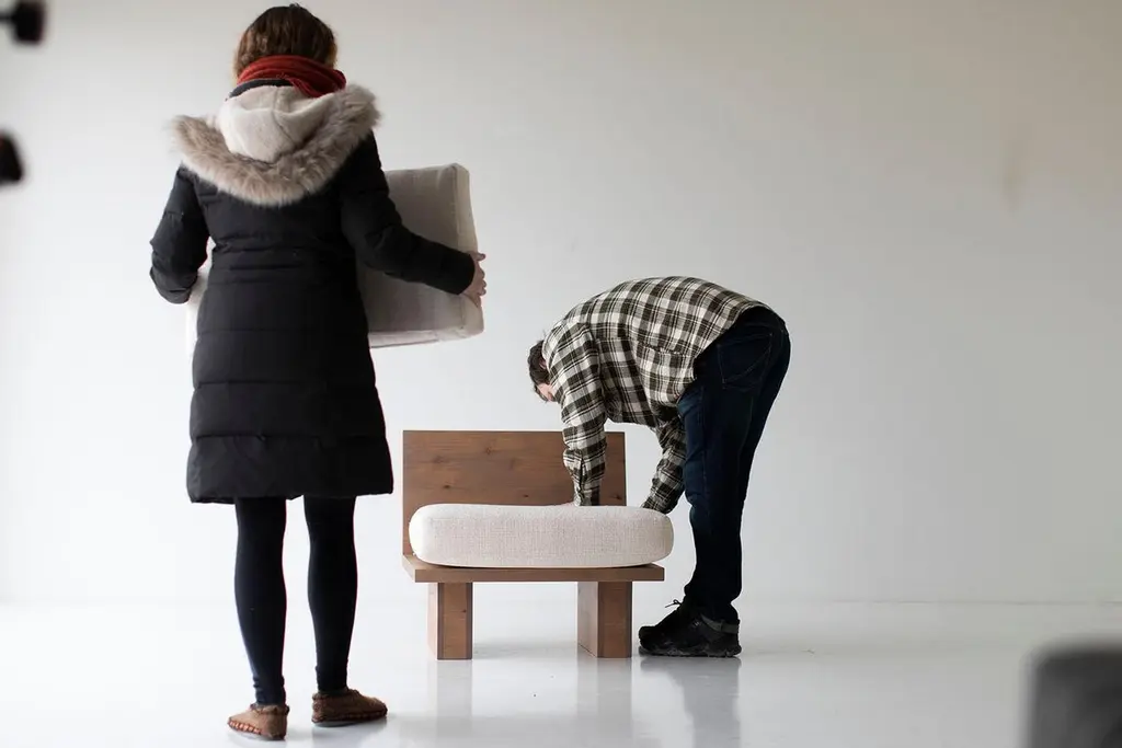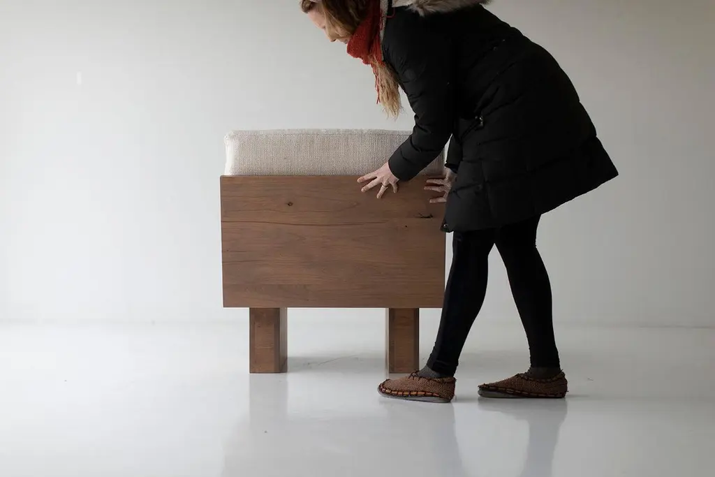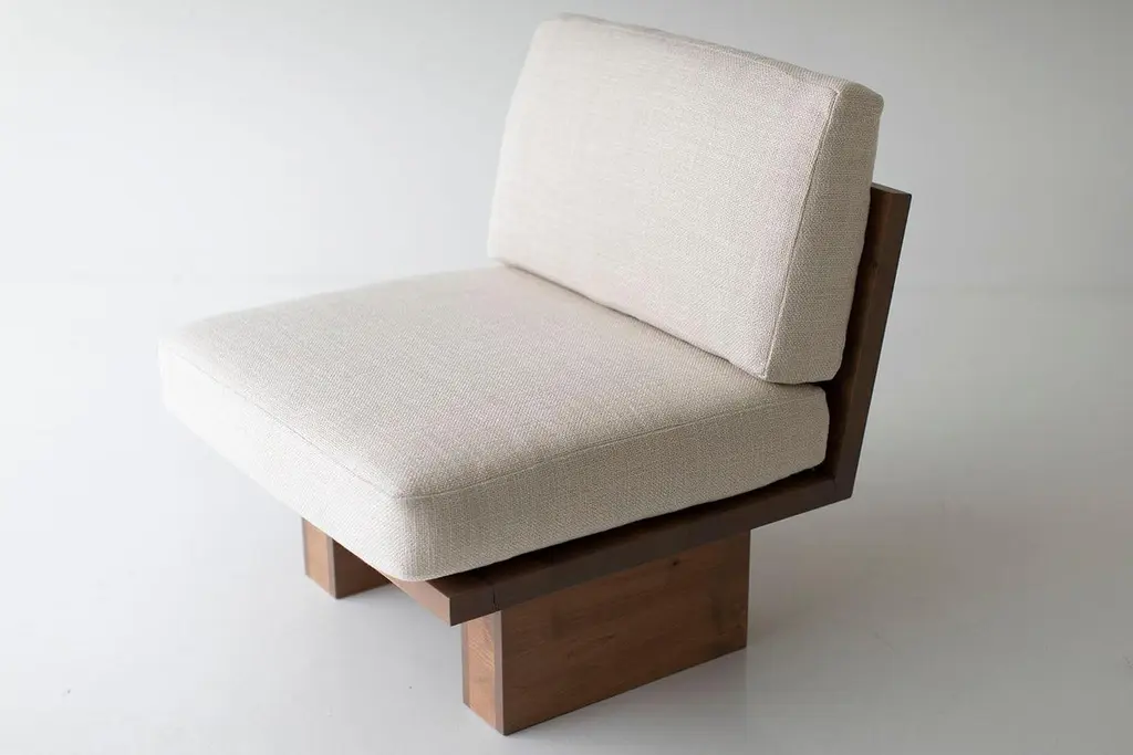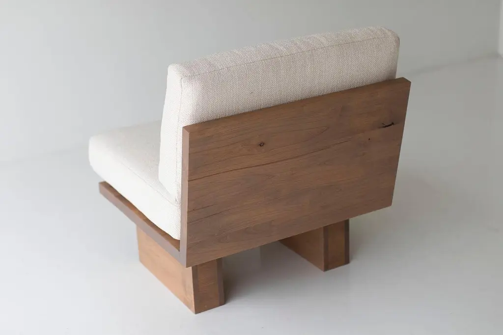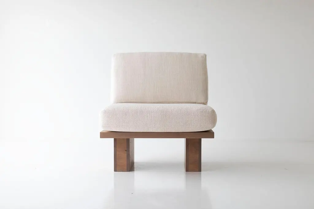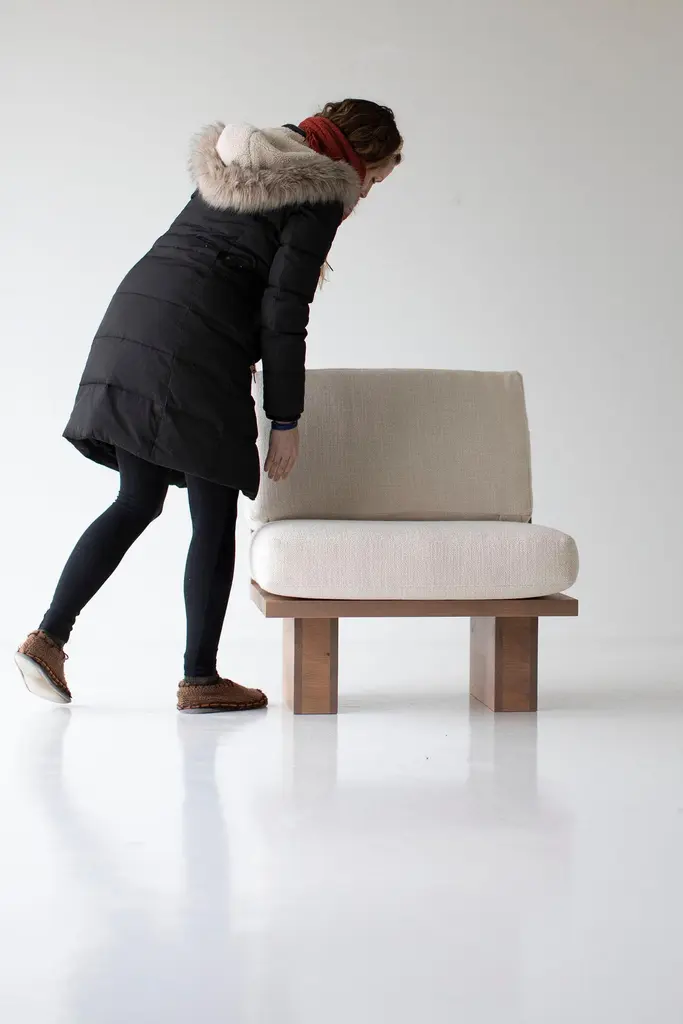 This Suelo® modern side chair is beautifully constructed from solid wood in Ohio, USA. The lounge chair's silhouette is simple, modern, and sleek with comfortable back and seat cushions. This is the perfect chair for any space, indoor or outdoor. The Suelo® Collection consists of an arm chair, side chair, bench, daybed, loveseat, ottoman, dining chairs - both arm and side, and multiple orientations of sofas/sectionals for indoor or outdoor use. You can get any Suelo® piece in a solid or slatted version. This specific wood species is for indoor only; please contact for outdoor options. Price includes thick weave fabric and finish of your choice - natural, grey-wash, walnut, and black. Multiple fabric colors available.This chair is for indoor use! Please contact us or find our other Suelo® listings for the outdoor version.Designer inspiration: "The Suelo® Collection was inspired by my love for travel. So many places that inspire me have very minimal furniture, often built-in sofas with big comfy cushions, hammocks, raw natural wood, etc. The feel is low-key, simple, and comfortable. The wood isn't refined, it just IS. Functionality always plays into my designs as well, represented here by lower seating for a more intimate talking or lounging environment, and the platform wood extension detail on the sofa, which makes a great little table for your drink or cell phone. I envision this furniture used for indoor/outdoor spaces or any room that needs some comfort or relief. The Suelo® line reminds me of your own getaway - it has a natural, cool vibe and doesn't take itself too seriously. I imagine the sofa loaded up with pillows and some music playing in the background, of course." -Gretta JonesspecsPeriod/Model: New; ModernSpecs: Solid knotty alder, grey wash commercial grade finishCustomizable: Yes! It's what we do :)DimensionsH 31.5" W 28.5" D 31"Seat H 16"Seat W 28.5" Seat D 21" with back cushion, 27" withoutFrom the time of purchase, please allow 3-4 weeks for production. Shipping time varies dependent on location.