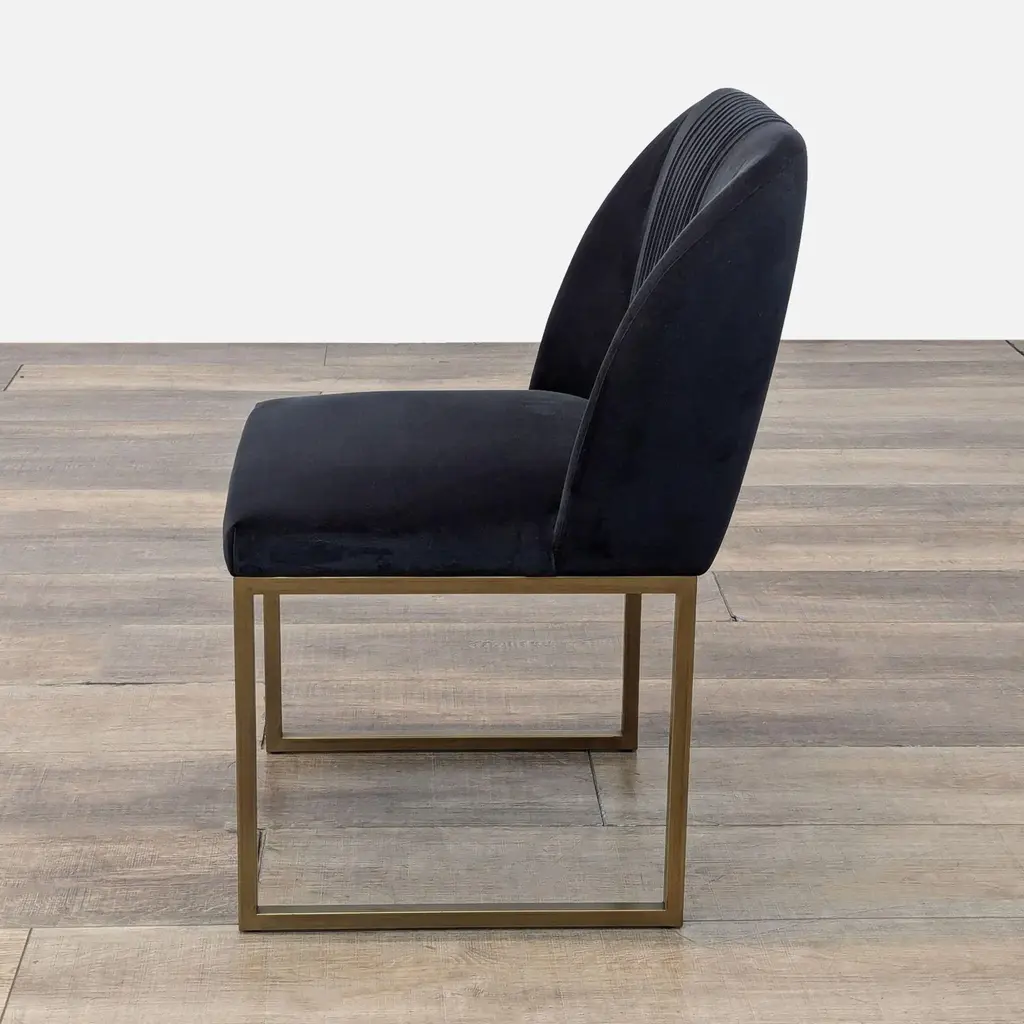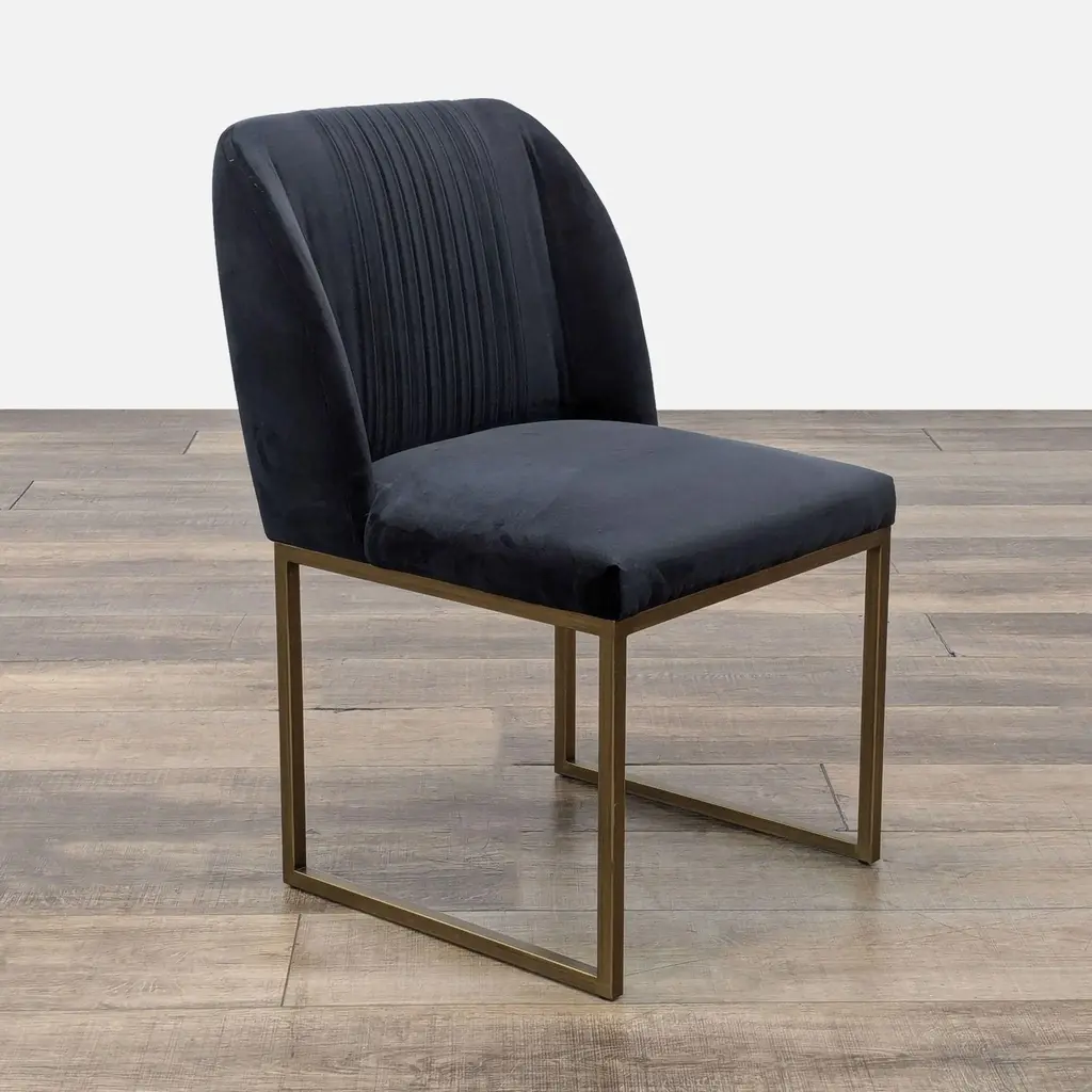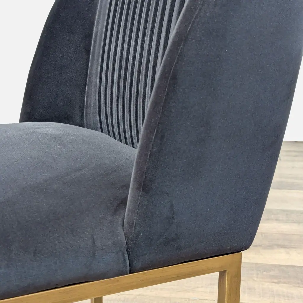 A transitional dining chair, featuring delicate ruching on the rounded seatback and exposed antique brass legs. Brand: Sunpan. Color: Shadow Grey. Original Price: $853. Dimensions (in): 21W x 20D x 33H.