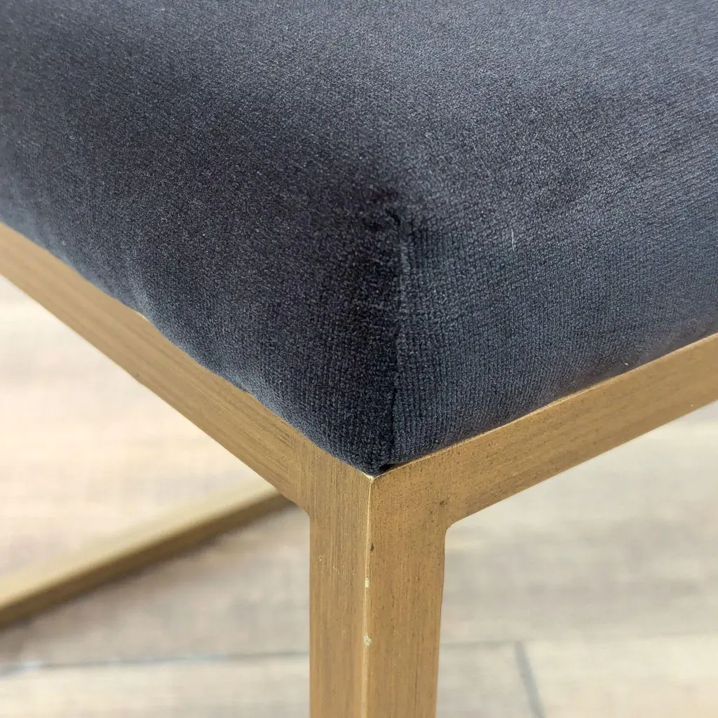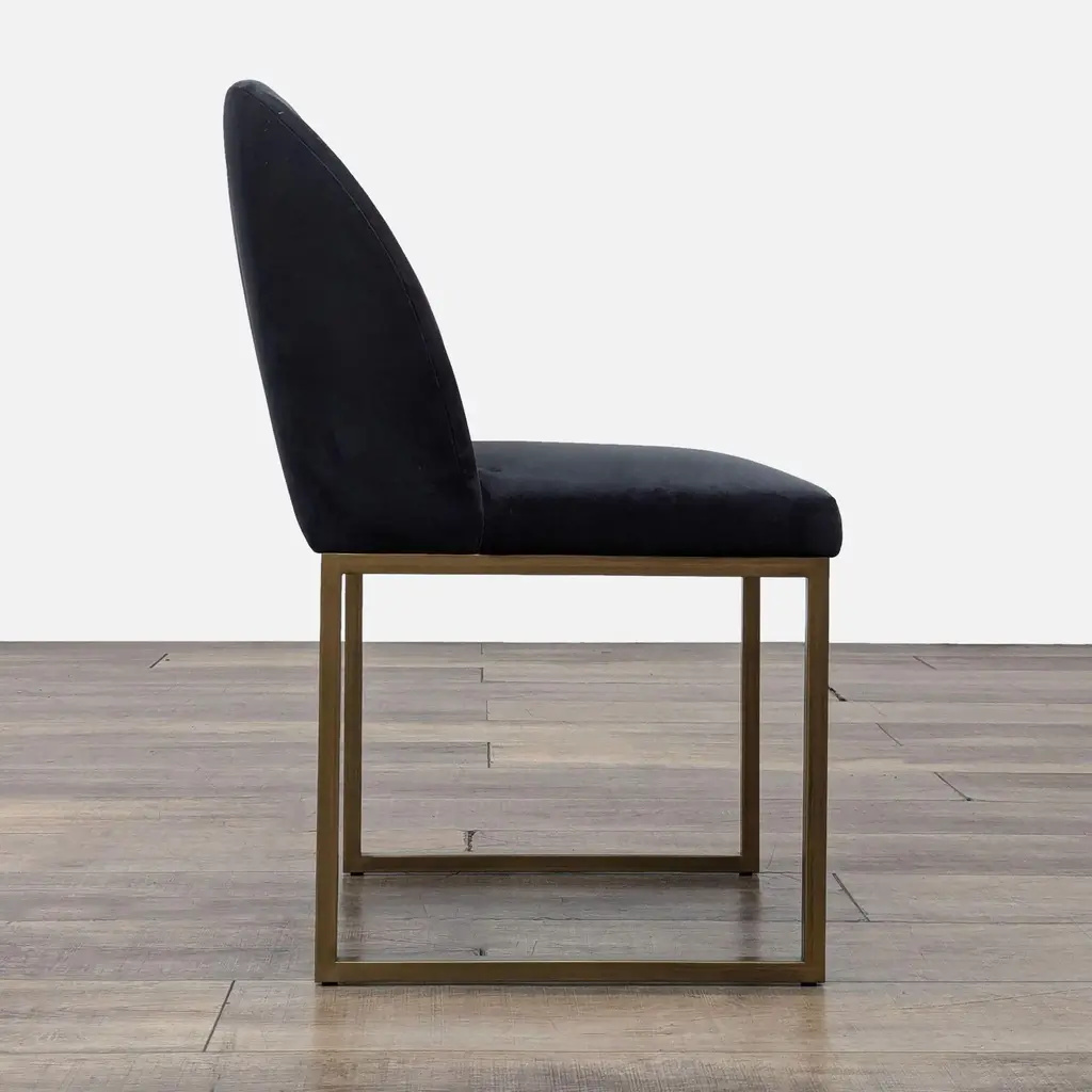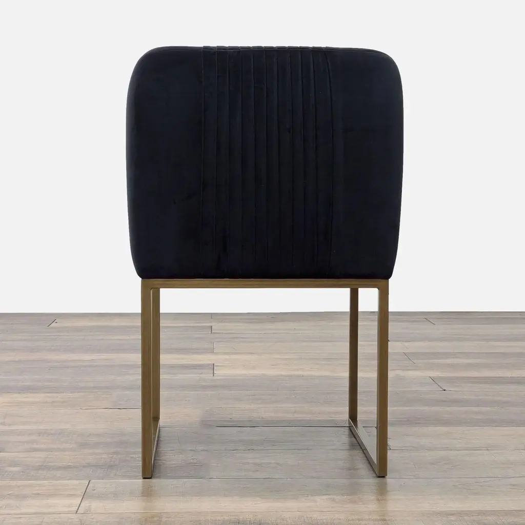 A transitional dining chair, featuring delicate ruching on the rounded seatback and exposed antique brass legs. Brand: Sunpan. Color: Shadow Grey. Original Price: $853. Dimensions (in): 21W x 20D x 33H.