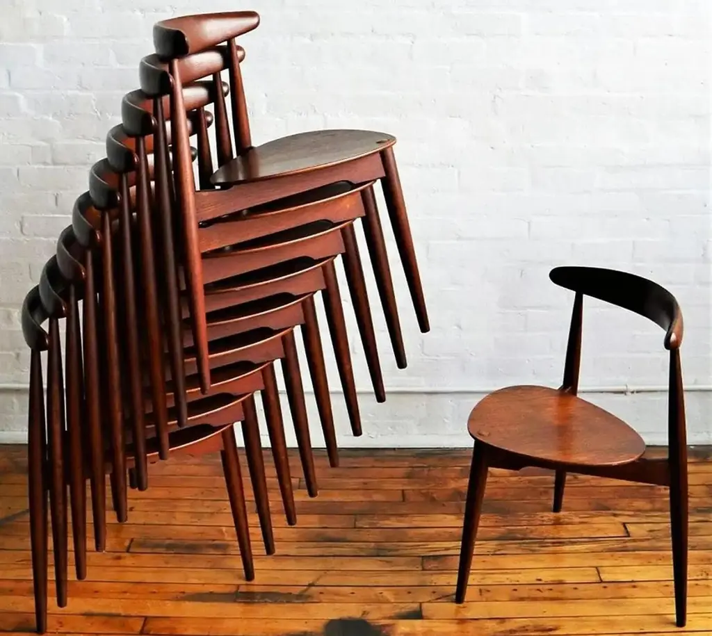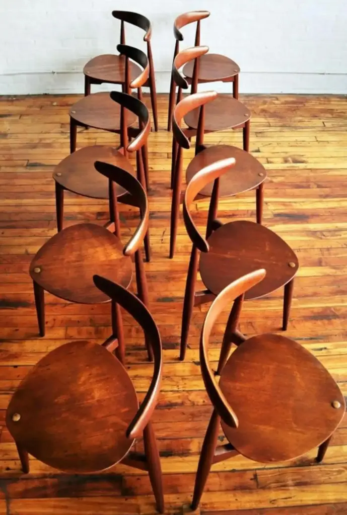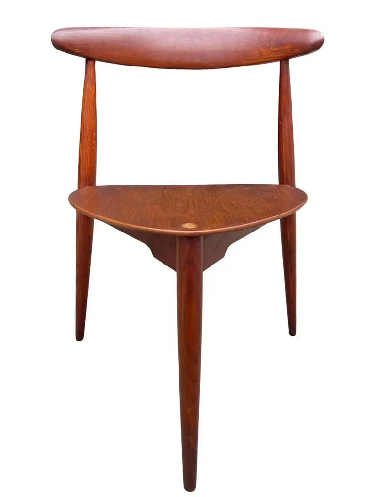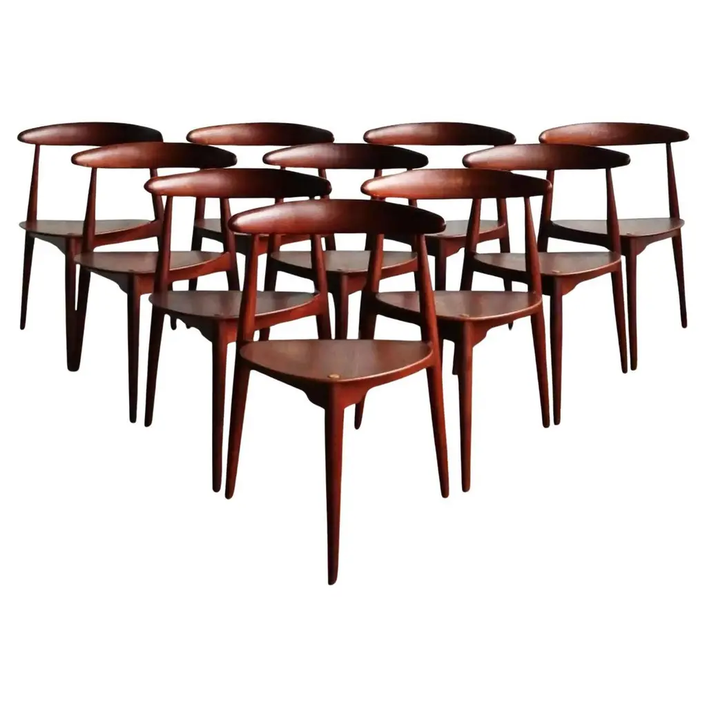 For your consideration are these beautiful dining chairs designed by Hans Wegner. Having gorgeous original patina with splendid craftsmanship while utilizing a space saving design. Unusual and rare that these chairs are all teak as opposed to a mix of oak and teak. Lovingly cared for and ready for use. Amazing vintage condition!Model FH4103 "Heart" stacking chairs produced by Fritz Hansen, Denmark.A rare opportunity to own this amazing set or buy up to ten.price per chair