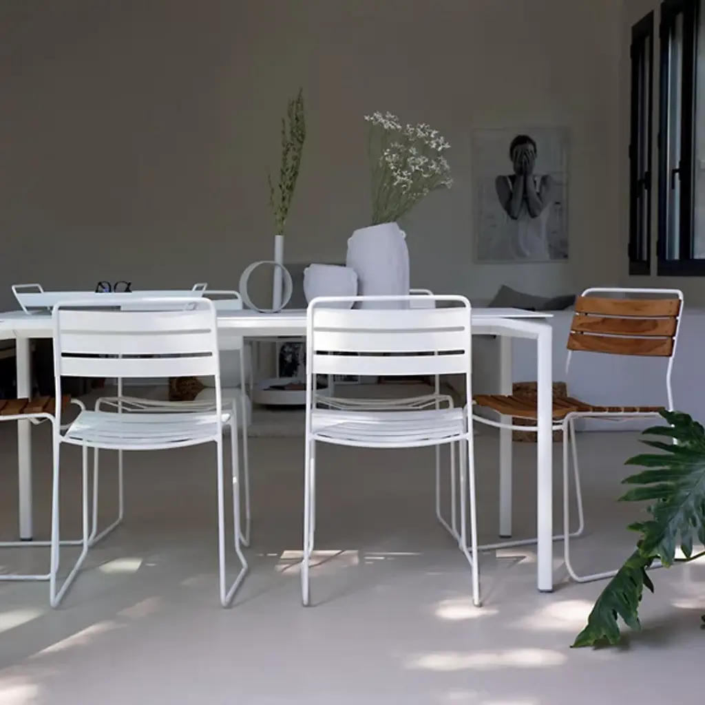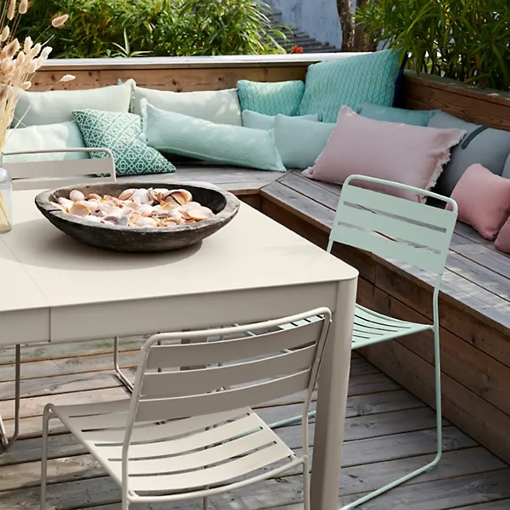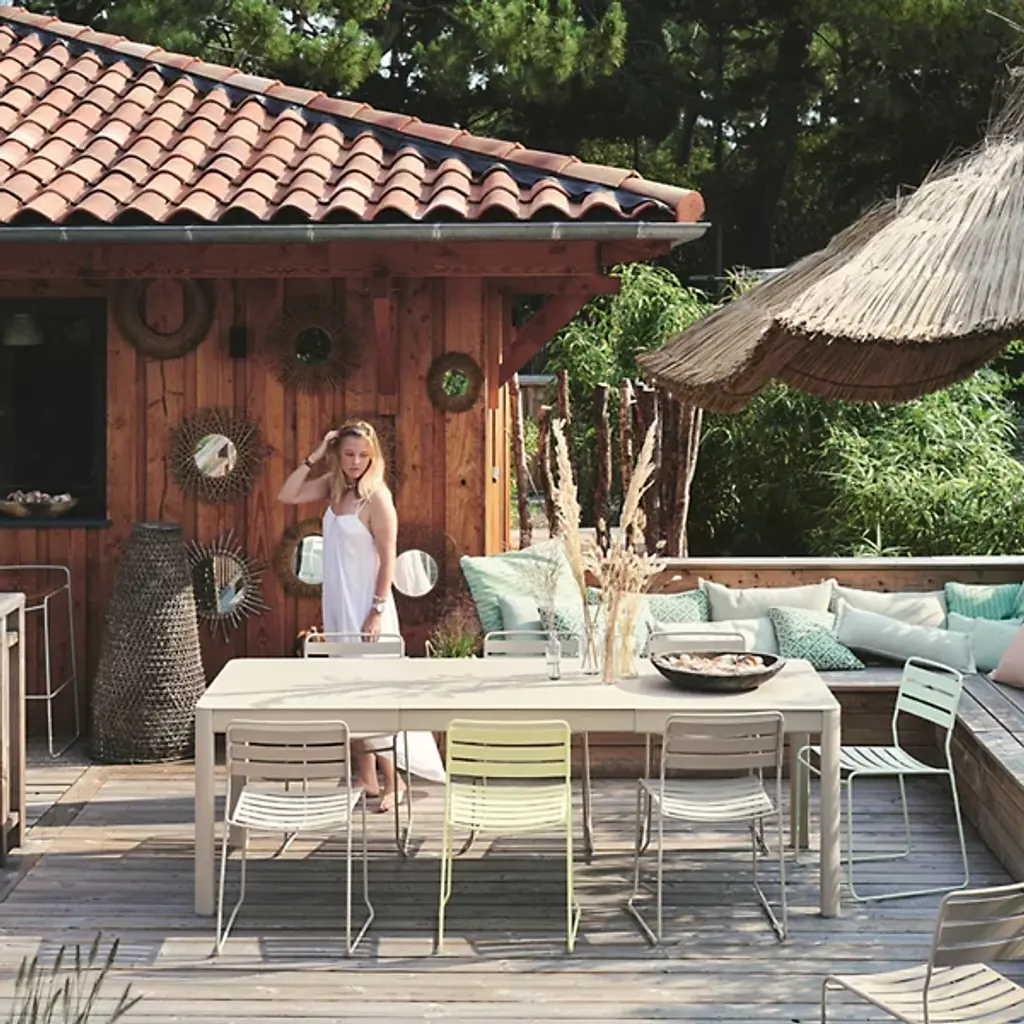 Made entirely out of steel, the comfort of the Fermob Surprising Chair, Set of 2 in outdoor dining settings is a pleasant surprise, indeed. The frame is solid steel rod, while the seat and back are made out of curved lasercut slats of sheet steel. Each chair is also conveniently lightweight and stackable up to 10 high when not in use.