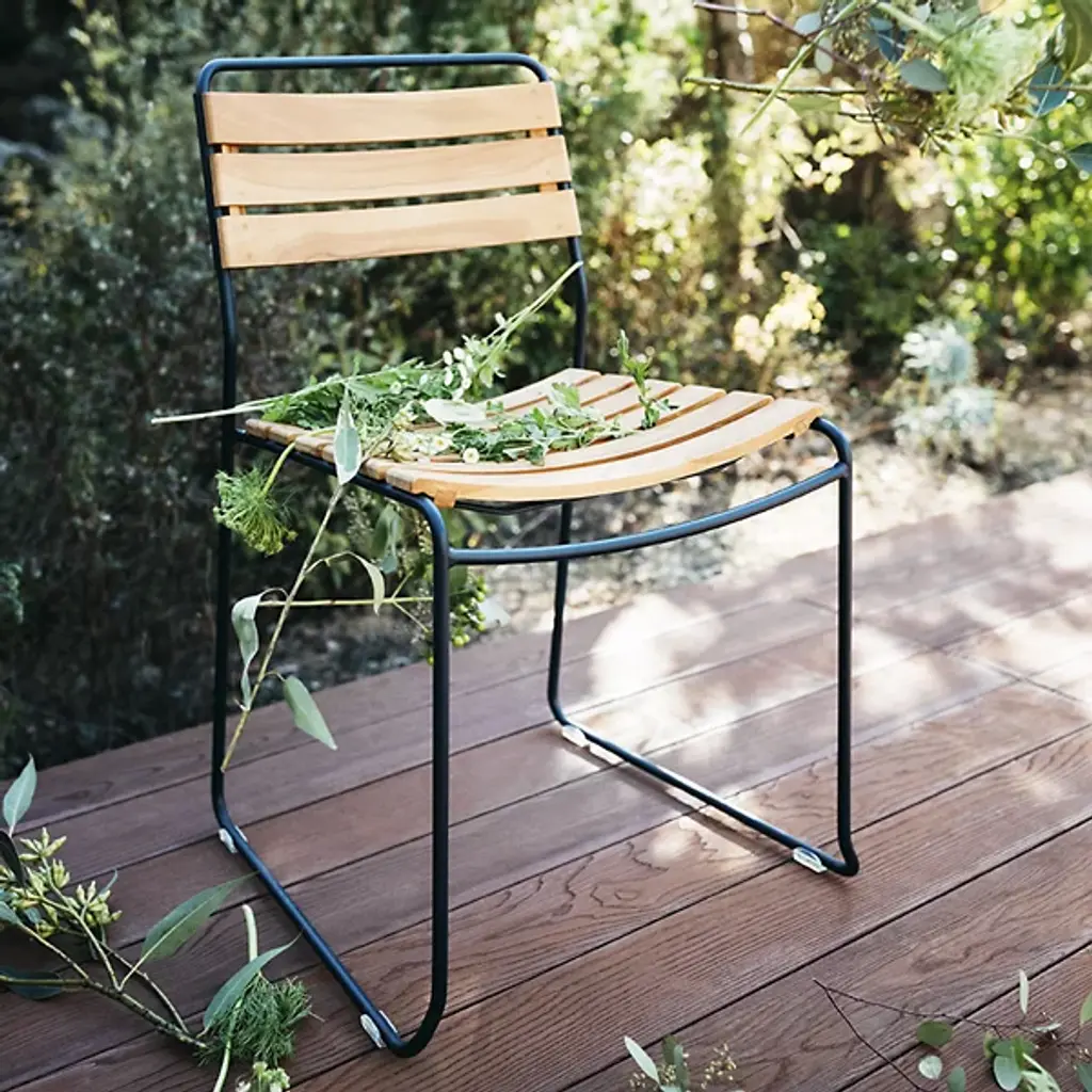 Surprisingly versatile. Fermob's Surprising Teak Chair, Set of 2 is a Harald Guggenbichler design that introduces the warmth of wood for a new dimension that gives this chair its universal appeal. A harmonious balance of Metal and Wood, the design features a strong Steel rod frame with a Teak slatted seat and backrest. Ergonomics and practicality are part of the equation, with an angular back rest and curved seat for comfort and heavy duty plastic foot glides for floor protection. Steel gets a weather and UV protective powder coating and Teak is naturally weather-resistant, making this dining chair a solid choice for outdoor grilling with friends and family. With a design that could grace a cruise liner or complete a '60's inspired kitchen, this stackable chair is full of surprises.