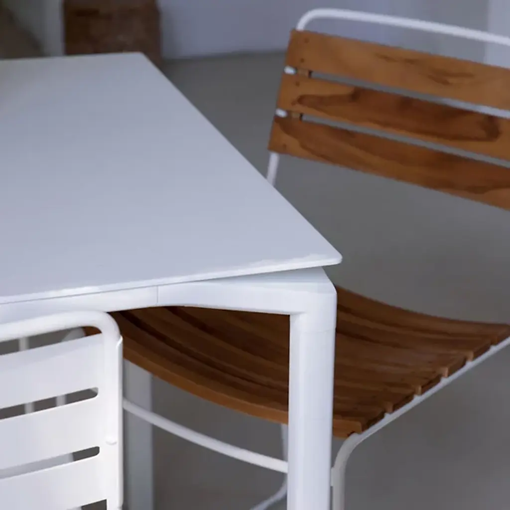 Surprisingly versatile. Fermob's Surprising Teak Chair, Set of 2 is a Harald Guggenbichler design that introduces the warmth of wood for a new dimension that gives this chair its universal appeal. A harmonious balance of Metal and Wood, the design features a strong Steel rod frame with a Teak slatted seat and backrest. Ergonomics and practicality are part of the equation, with an angular back rest and curved seat for comfort and heavy duty plastic foot glides for floor protection. Steel gets a weather and UV protective powder coating and Teak is naturally weather-resistant, making this dining chair a solid choice for outdoor grilling with friends and family. With a design that could grace a cruise liner or complete a '60's inspired kitchen, this stackable chair is full of surprises.