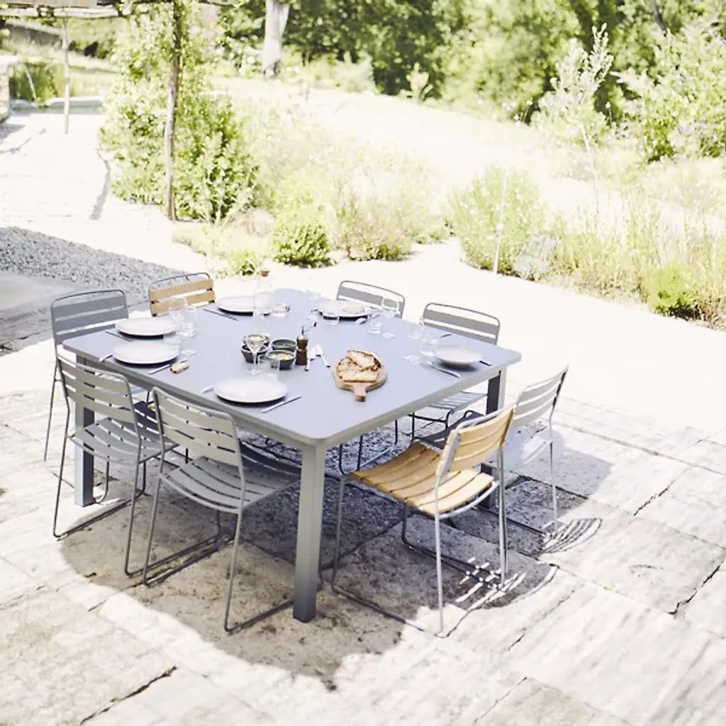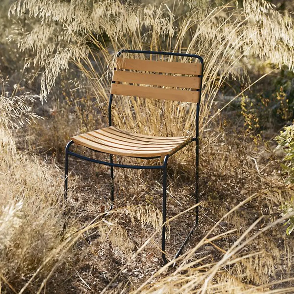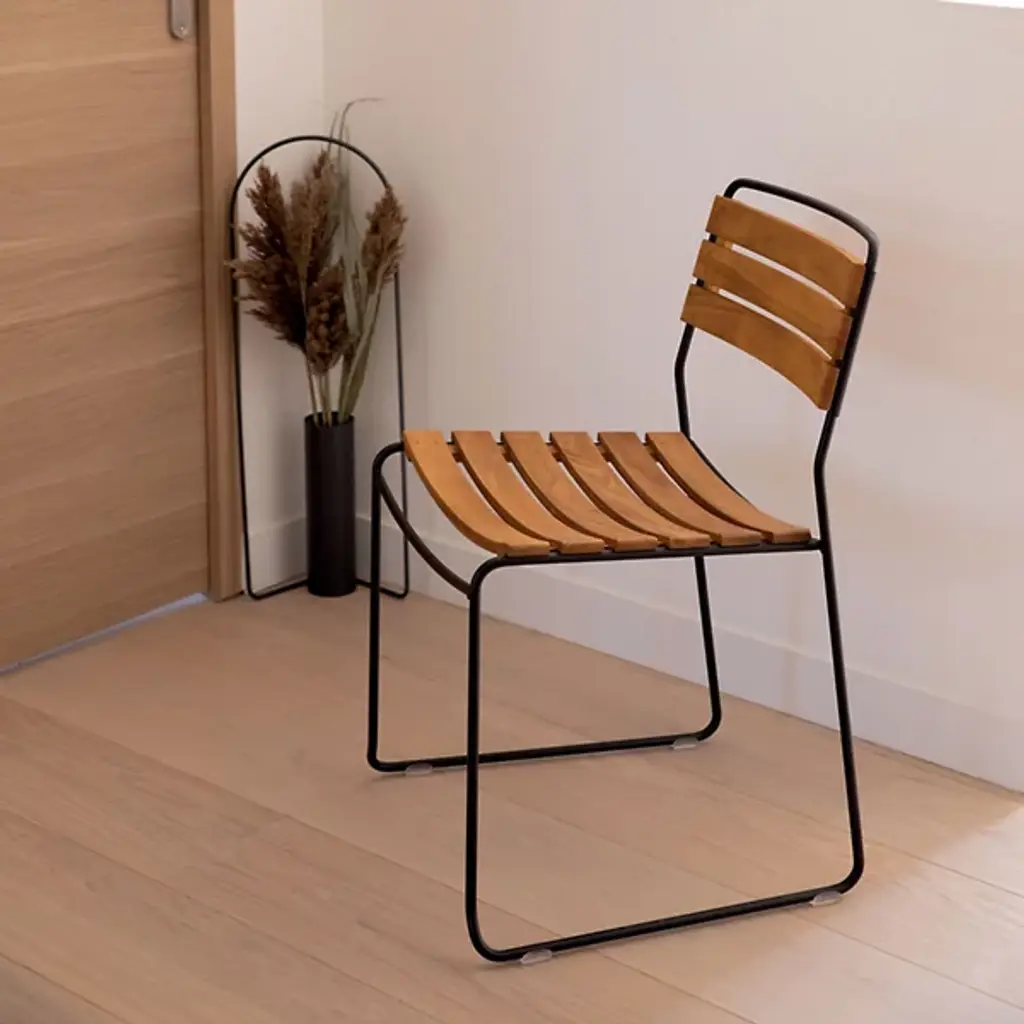 Surprisingly versatile. Fermob's Surprising Teak Chair, Set of 2 is a Harald Guggenbichler design that introduces the warmth of wood for a new dimension that gives this chair its universal appeal. A harmonious balance of Metal and Wood, the design features a strong Steel rod frame with a Teak slatted seat and backrest. Ergonomics and practicality are part of the equation, with an angular back rest and curved seat for comfort and heavy duty plastic foot glides for floor protection. Steel gets a weather and UV protective powder coating and Teak is naturally weather-resistant, making this dining chair a solid choice for outdoor grilling with friends and family. With a design that could grace a cruise liner or complete a '60's inspired kitchen, this stackable chair is full of surprises.