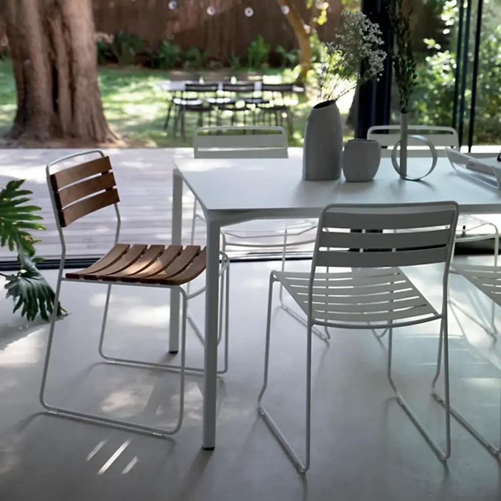 Surprisingly versatile. Fermob's Surprising Teak Chair, Set of 2 is a Harald Guggenbichler design that introduces the warmth of wood for a new dimension that gives this chair its universal appeal. A harmonious balance of Metal and Wood, the design features a strong Steel rod frame with a Teak slatted seat and backrest. Ergonomics and practicality are part of the equation, with an angular back rest and curved seat for comfort and heavy duty plastic foot glides for floor protection. Steel gets a weather and UV protective powder coating and Teak is naturally weather-resistant, making this dining chair a solid choice for outdoor grilling with friends and family. With a design that could grace a cruise liner or complete a '60's inspired kitchen, this stackable chair is full of surprises.
