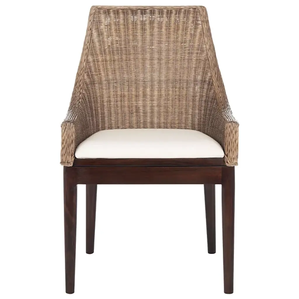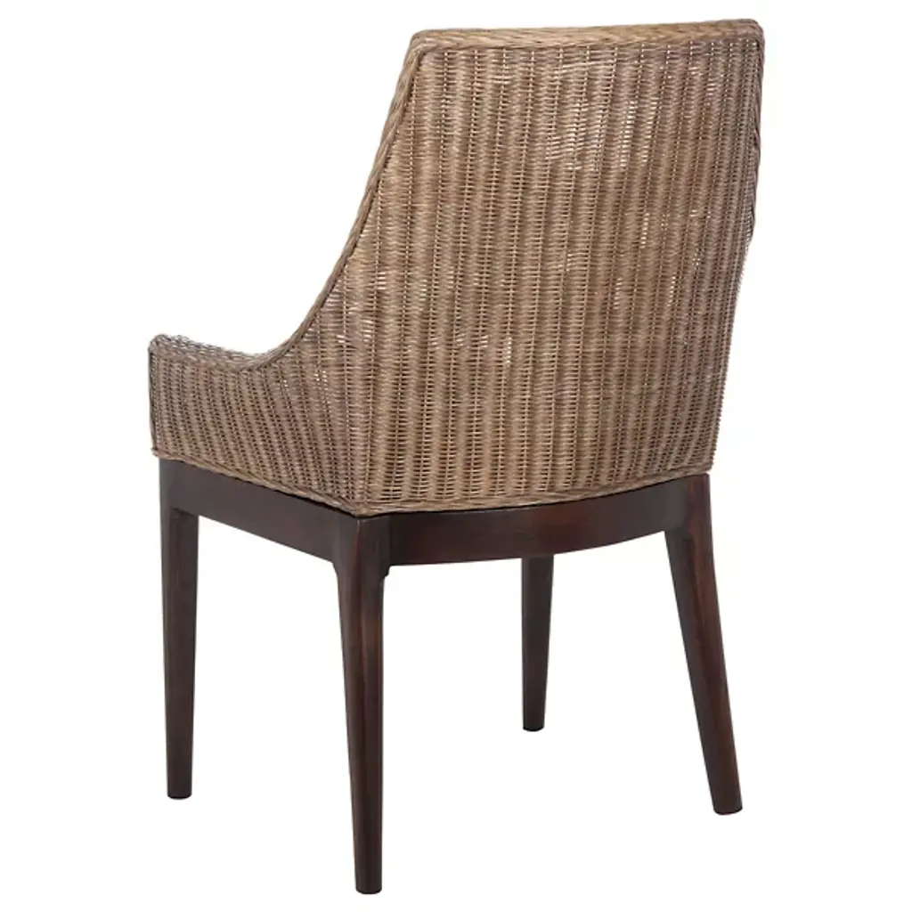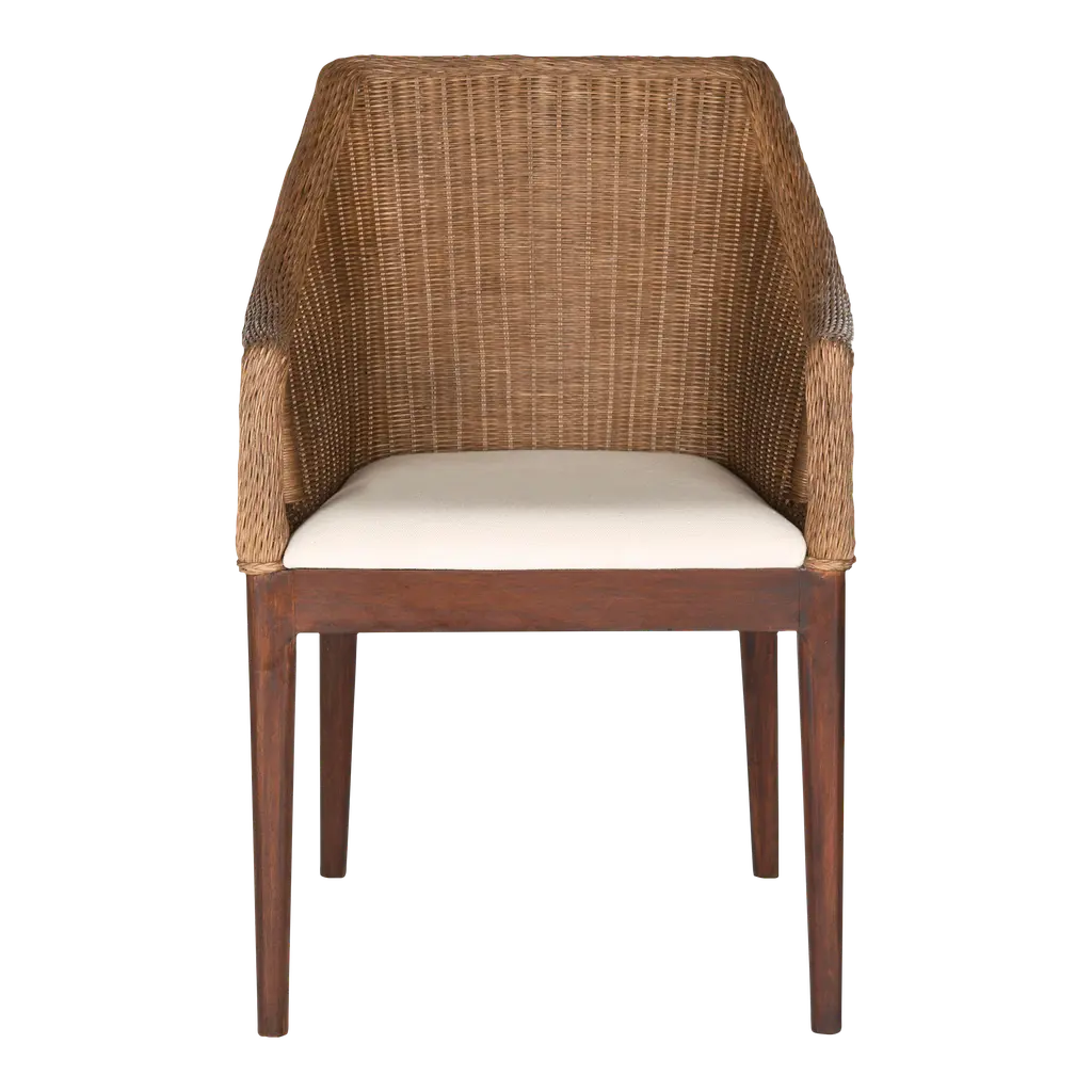 The Talita Sloping Dining Armchair from Alder & Ore embodies modern coastal chic and design fusion. Its classic sloping frame is beautifully transformed with finely woven rattan, creating an emblem of stylish comfort. The chair features slender mahogany wood legs, striking the perfect balance between classic and contemporary design. The soft white cushion, upholstered in cotton fabric and filled with foam, ensures elegance and comfort around your dining table. Crafted with a combination of rattan weave on the seat, the fabric and mahogany frame contrast nicely, elevating your space’s unique charm.