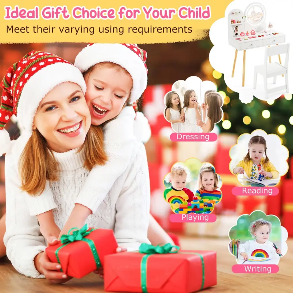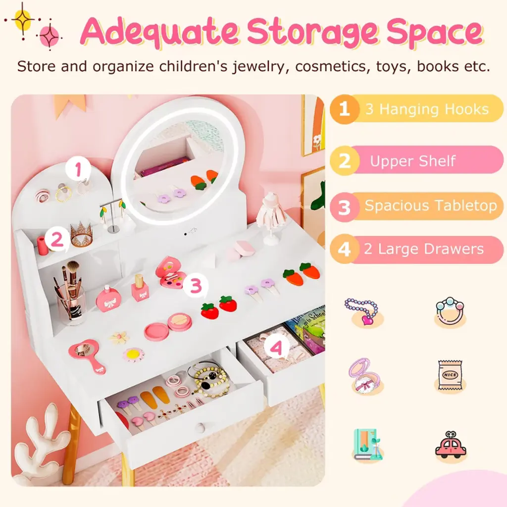Elevate your child's playtime with this lighted kids dressing table. The lighted makeup mirror features 2 color modes. With child-safe features like a shatterproof PVC mirror and rounded corners, safety is ensured. The princess vanity set comes with ample storage including shelf, hooks and drawers for organization. Stability is a priority with an anti-toppling device and sturdy wood legs. This versatile desk and chair set makes a perfect gift for any occasion, providing a safe and enjoyable space for your child to dress up, read, write, draw, and more.FeaturesLighted mirror with 2 adjustable colors Ample storage space with an open shelf, hooks and drawers Enhanced safety with shatterproof PVC mirror Can be attached to the wall with included anti-toppling deviceSpecifications:Color: White Material: MDF, Pine Wood, PVC Mirror Table Dimension: 27.5" x 13.5" x 40" (W x D x H) Chair Dimension: 14" x 12" x 25.5" (L x W x H) Seat Dimension: 11" x 11" x 12.5" (L x W x H) Mirror Diameter: 9.5" Weight Capacity of Tabletop: 110 lbs Weight Capacity of Chair: 165 lbs Suitable Age: 3+ years old Net Weight: 30 lbs Package includes: 1 x Vanity Table 1 x Chair 1 x User Guide