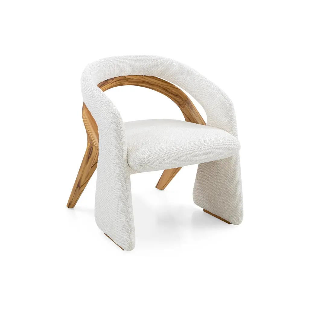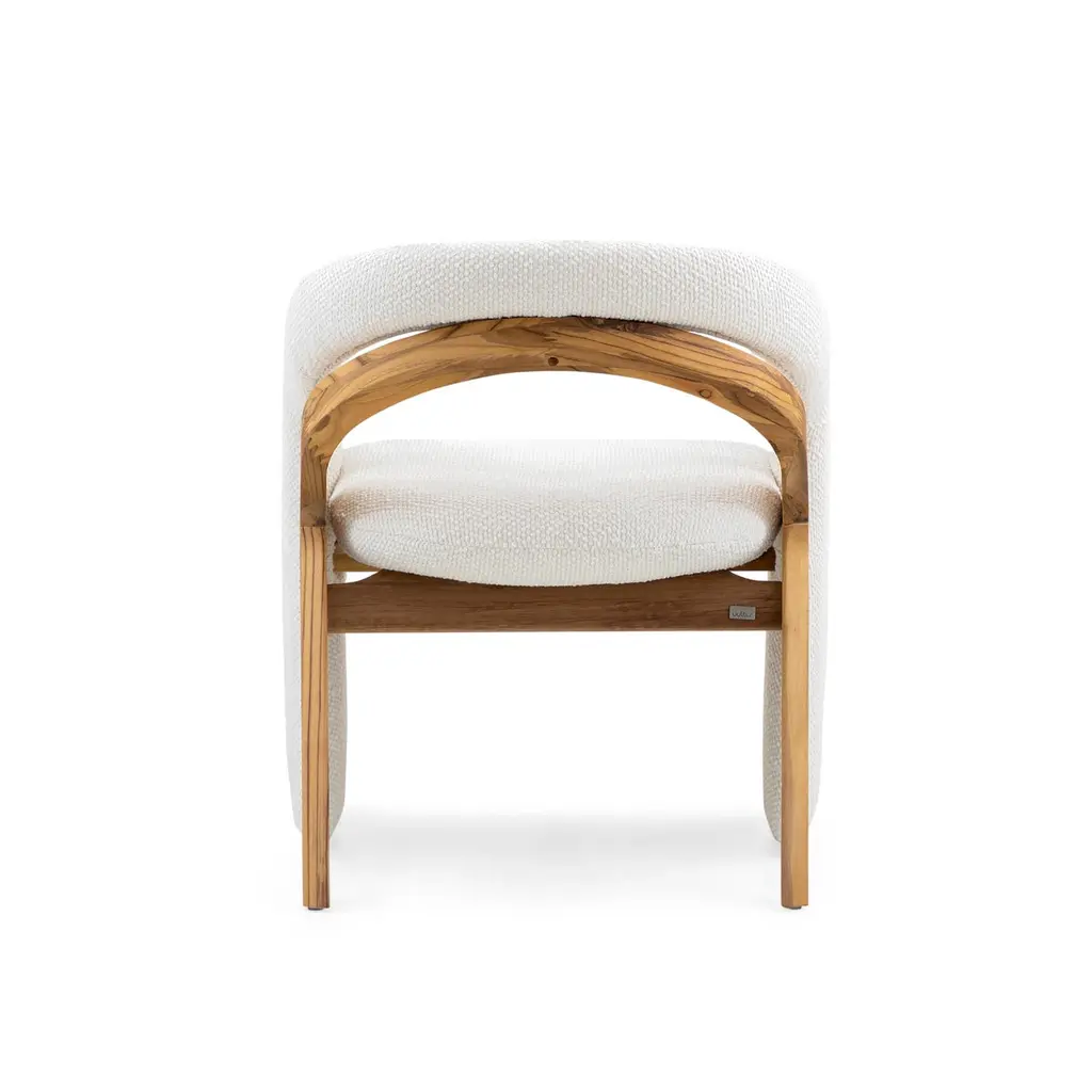 An Olga dining room chair in teak wood with white bouclé fabric. Introducing the Olga dining room chair, designed by Aciole Félix for Uultis, this stunning chair embodies modern design and sustainable craftsmanship. Crafted from solid teak wood and upholstered in soft, luxurious white bouclé fabric, the Olga chair is perfect for adding a contemporary touch to any dining room or stylish office. The chair’s clean lines and unique, curvaceous silhouette create an elegant and welcoming aesthetic, ideal for bold and innovative interior projects. With an open-back design, the Olga chair showcases a perfect balance between comfort and style, making it both a functional and artistic addition to your home.The solid teak wood frame features a matte, velvety teak touch finish, providing a natural wood feel that brings warmth and organic beauty to the piece. Each chair is unique, thanks to the natural variations in the wood, enhancing its charm and individuality. Uultis is committed to sustainability, ensuring that this piece is made with environmentally friendly materials and responsible manufacturing practices.Whether paired with a minimalist dining table for a sleek modern look or mixed with more eclectic elements, the Olga dining chair seamlessly fits into any design scheme. It arrives fully assembled, ready to elevate your dining experience with its contemporary flair and eco-conscious construction.