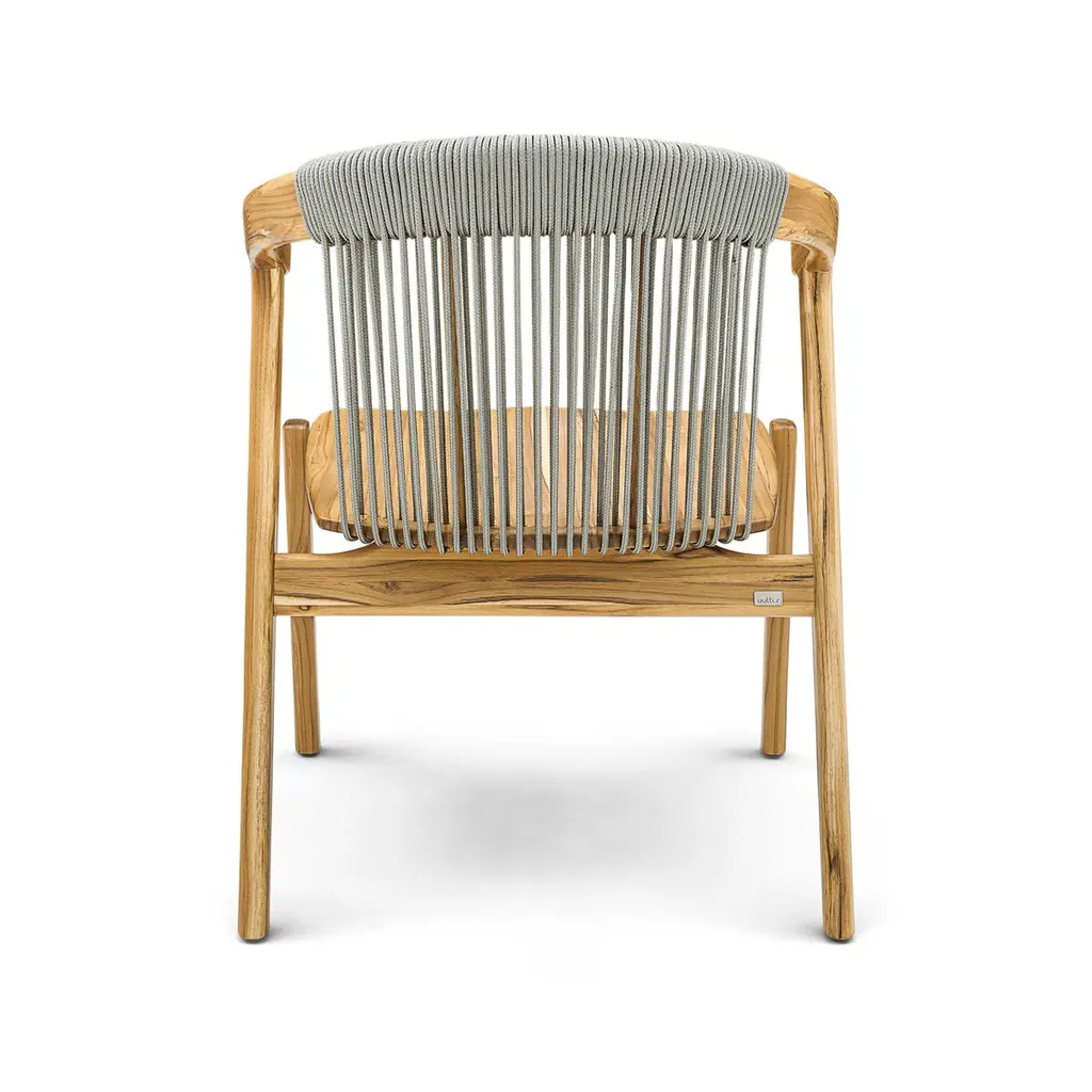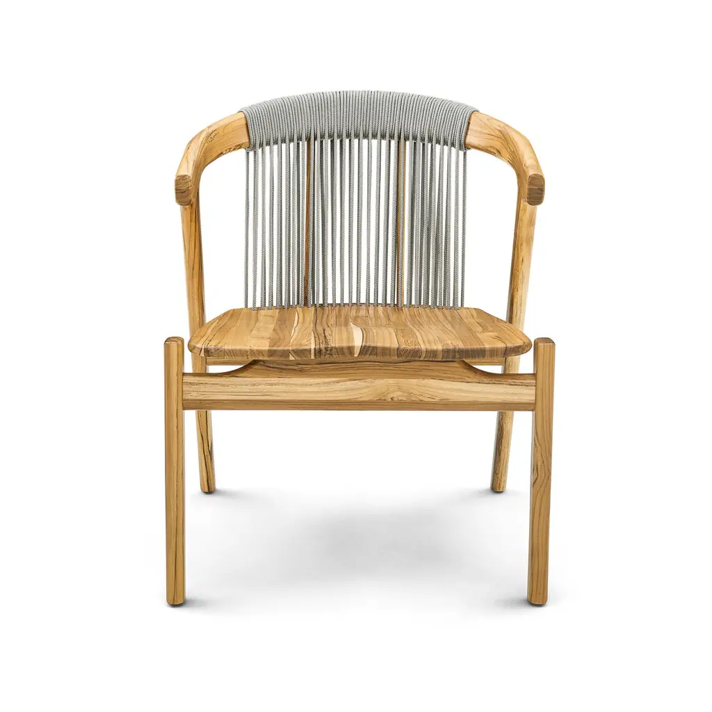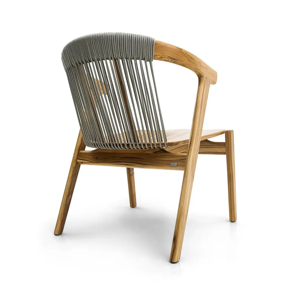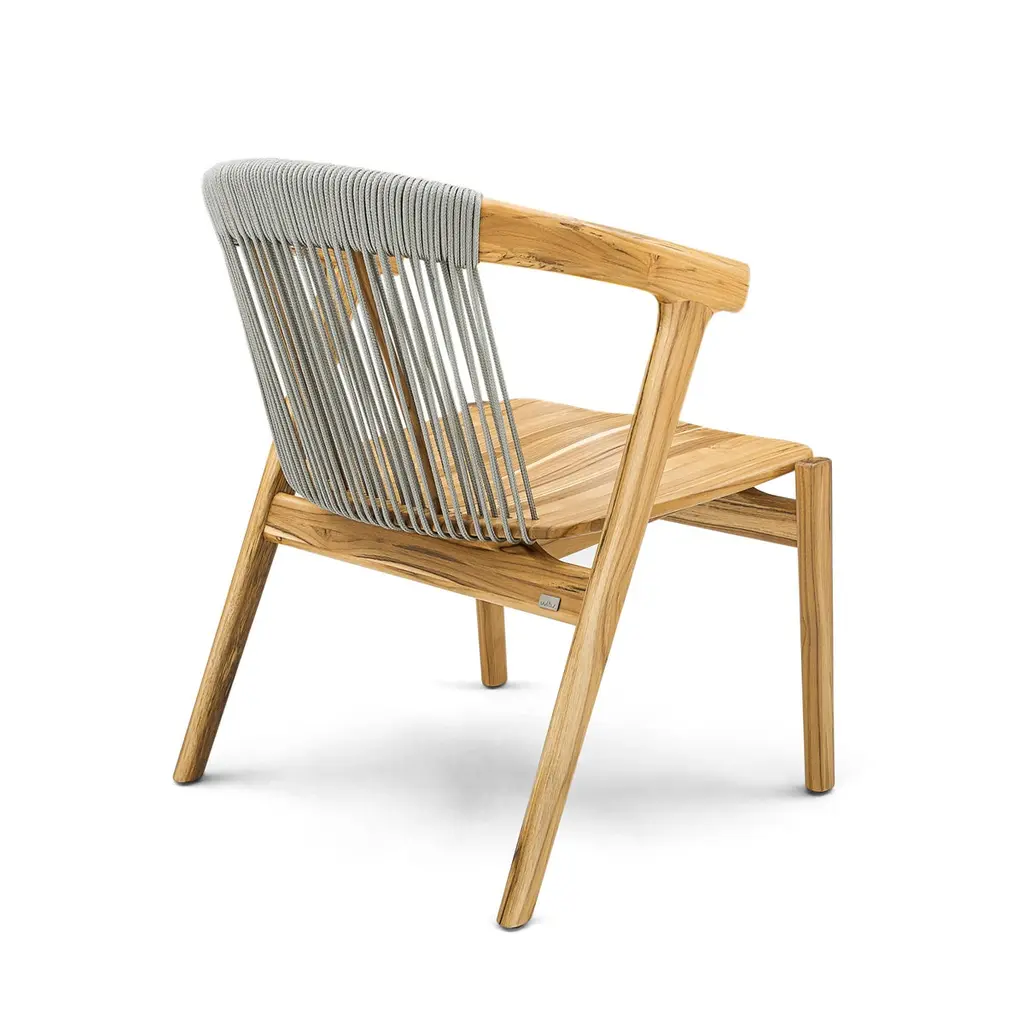 The Vine outdoor dining chair showcases the natural beauty of solid teak wood, paired with a striking silver rope back that adds texture and movement to its design. Please check availability prior to purchase.Inspired by organic forms, this chair balances sculptural elegance with functionality, making it a versatile addition to outdoor dining areas, patios, or indoor spaces seeking a modern yet natural touch. The teak wood frame highlights its rich, warm grain, while the handwoven rope detail offers flexibility and comfort.Designed for durability, the Vine chair withstands the elements, allowing for effortless styling in both open-air and covered spaces. Around a dining table, it creates an inviting setting for leisurely outdoor meals, while as an accent chair, it introduces an artisanal quality to sunrooms, balconies, or even contemporary living areas. The contoured seat and open-frame structure ensure a light, airy presence, perfect for modern interiors or nature-inspired retreats.Each piece is uniquely defined by the natural variations of teak, with a matte finish enhancing its organic appeal. Ready to use upon arrival, the Vine chair brings refined craftsmanship and easy elegance to any home.