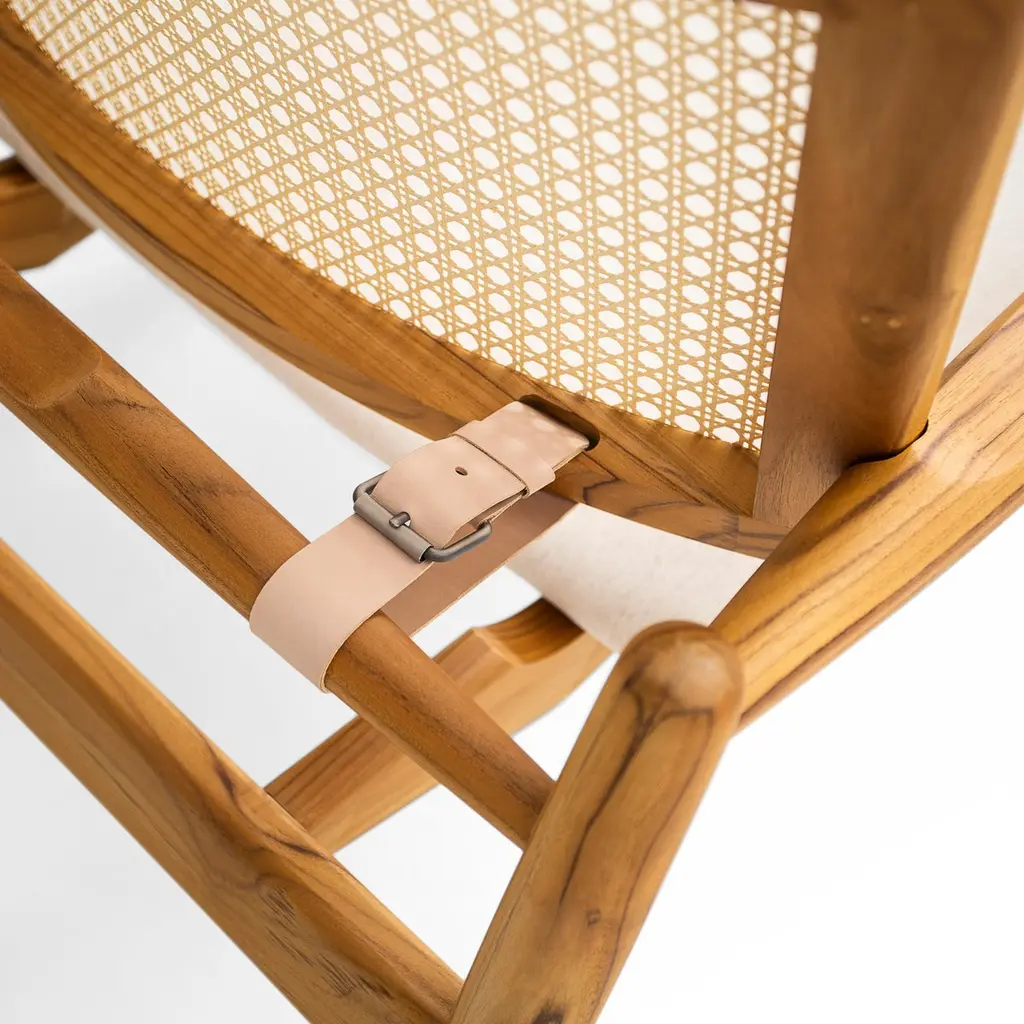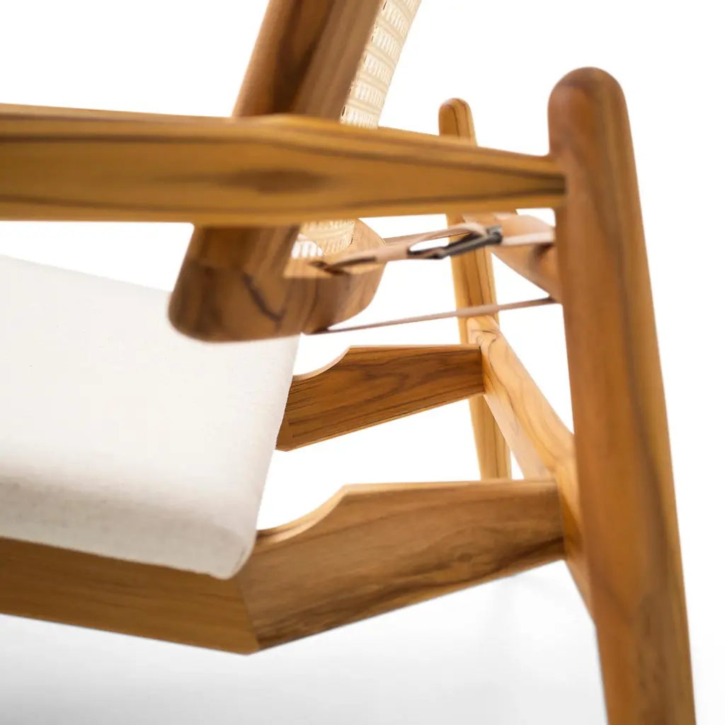 A Soho teak wood armchair designed by Sérgio Batista for Uultis, with oatmeal fabric. Please check availability prior to purchase.The Soho armchair crafted in teak wood and designed by Sérgio Batista, offers a perfect blend of vintage-inspired elegance and modern functionality. Its striking features include a curved cane backrest with hand-woven natural color cane and a solid teak frame finished with a matte, velvety texture. The light oatmeal fabric seat cushion, in Faded White Plain Weave, adds a firm level of comfort while complementing the chair's minimalist design. The natural variations in the teak wood make each piece unique, adding charm to any space. The eco-friendly materials ensure sustainability without sacrificing aesthetics. The armchair’s versatile look makes it an ideal addition to a variety of rooms—whether enhancing a bedroom, living room, or home office. It can serve as a stylish accent chair or a comfortable seating option for reading, relaxing, or working. Its clean lines and cane detailing evoke a mid-century modern aesthetic while integrating seamlessly with contemporary decor. The Soho armchair arrives fully assembled, ensuring ease of setup and immediate enjoyment. This chair not only adds visual appeal but also provides excellent comfort, making it a perfect choice for those who value both beauty and functionality. The leather belt support at the back adds subtle elegance, inspired by fashion trends.