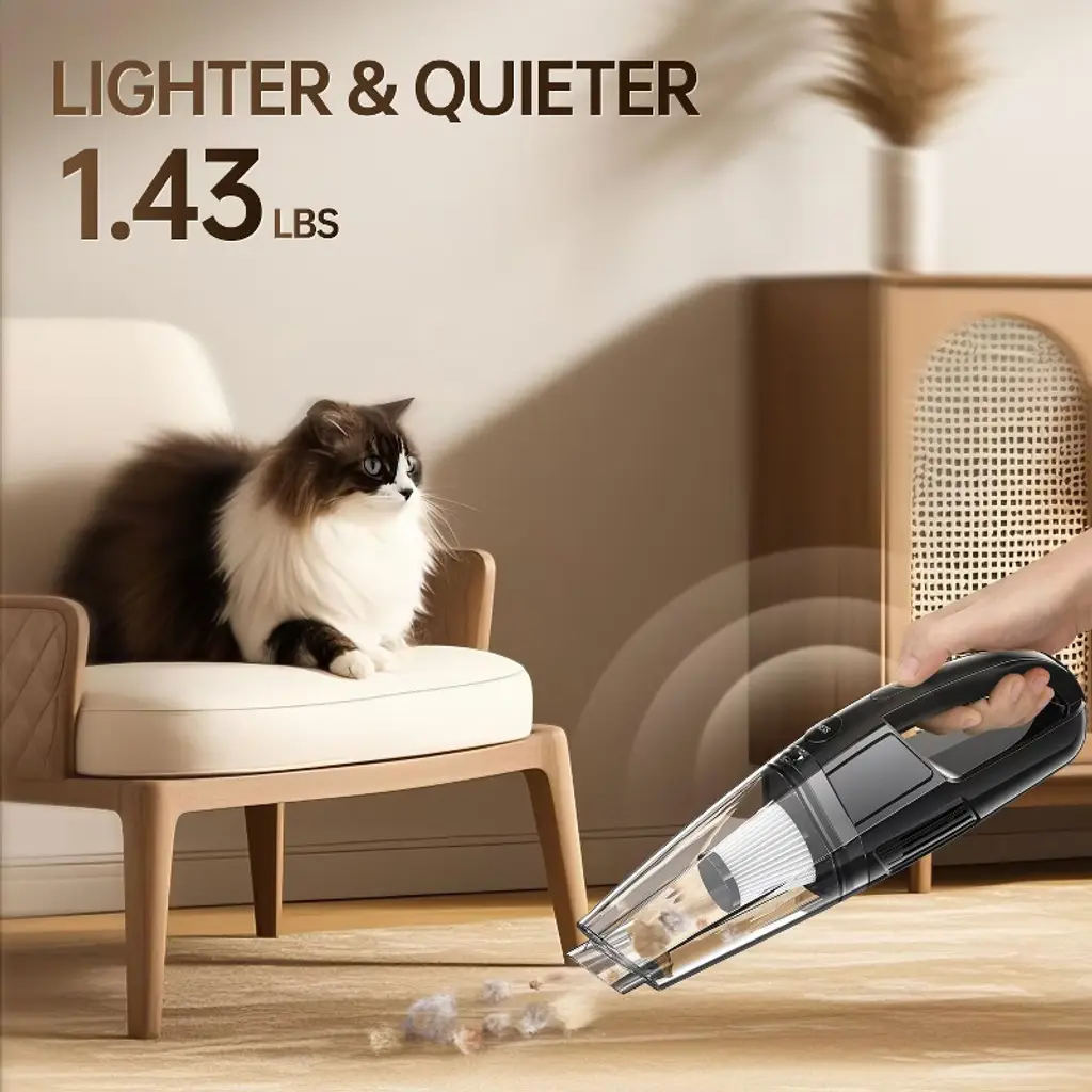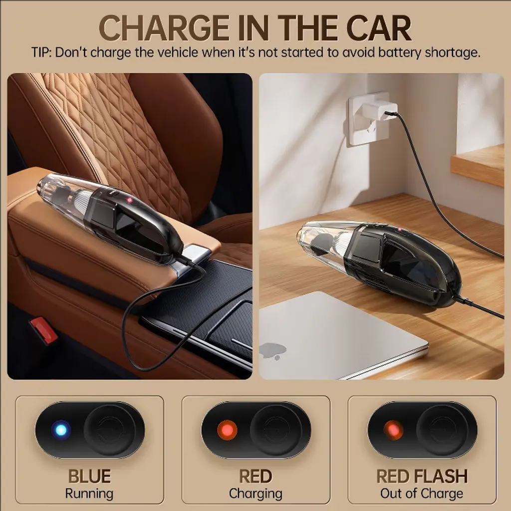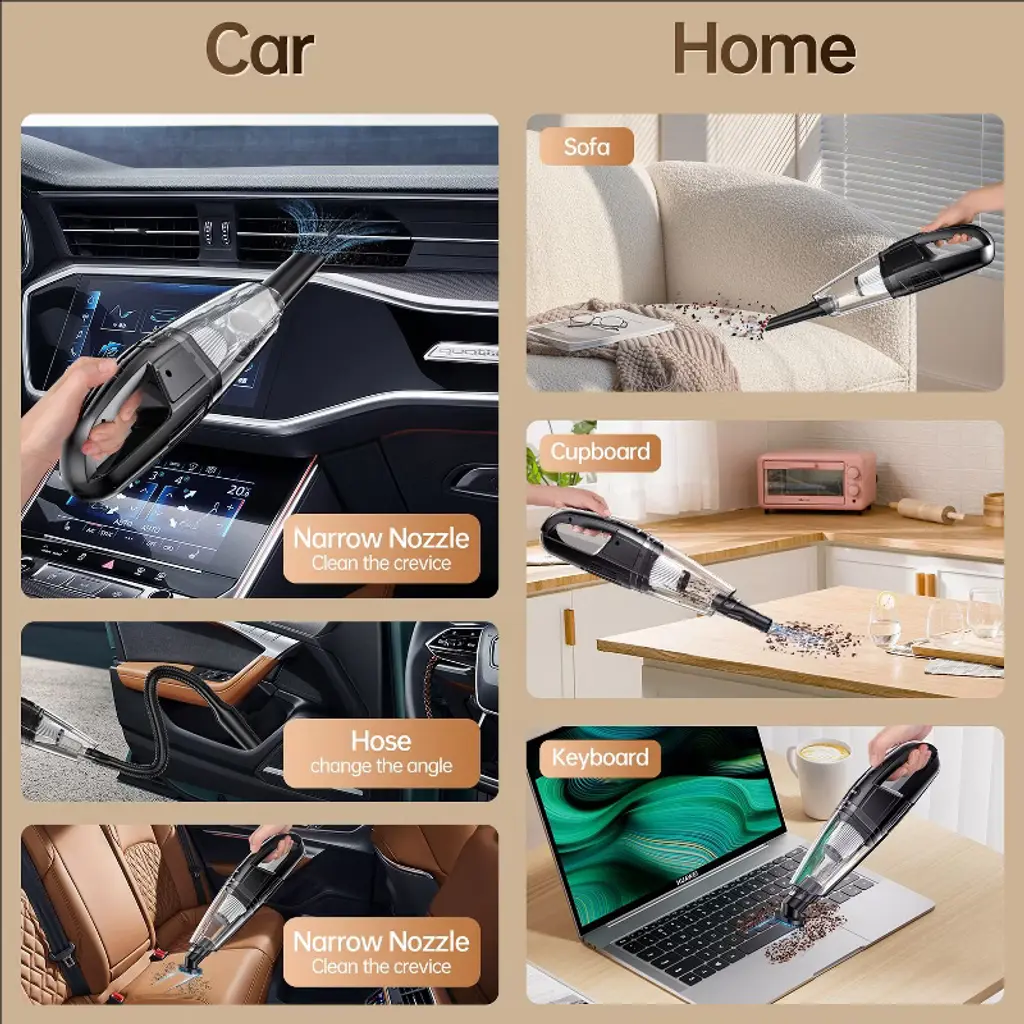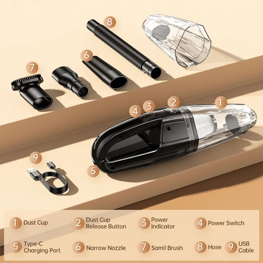 This portable cordless handheld vacuum cleaner brings a whole new experience to your cleaning work with its excellent performance and user-friendly design. It comes with a variety of attachments that can easily tackle hard-to-reach areas such as sofa crevices and stair steps for all-around cleaning. The strong suction power of up to 6000pa makes it capable of deep dust cleaning. The built-in 2000mAh high-capacity lithium-ion battery can support up to 30 minutes of continuous work, and with the removable dust collection cup of 650ml capacity, it can easily meet the cleaning needs of small spaces, such as homes and cars. The cordless portable design makes the vacuum cleaner more flexible and convenient for you to clean anytime and anywhere, whether it's cleaning your living room, bedroom or car.