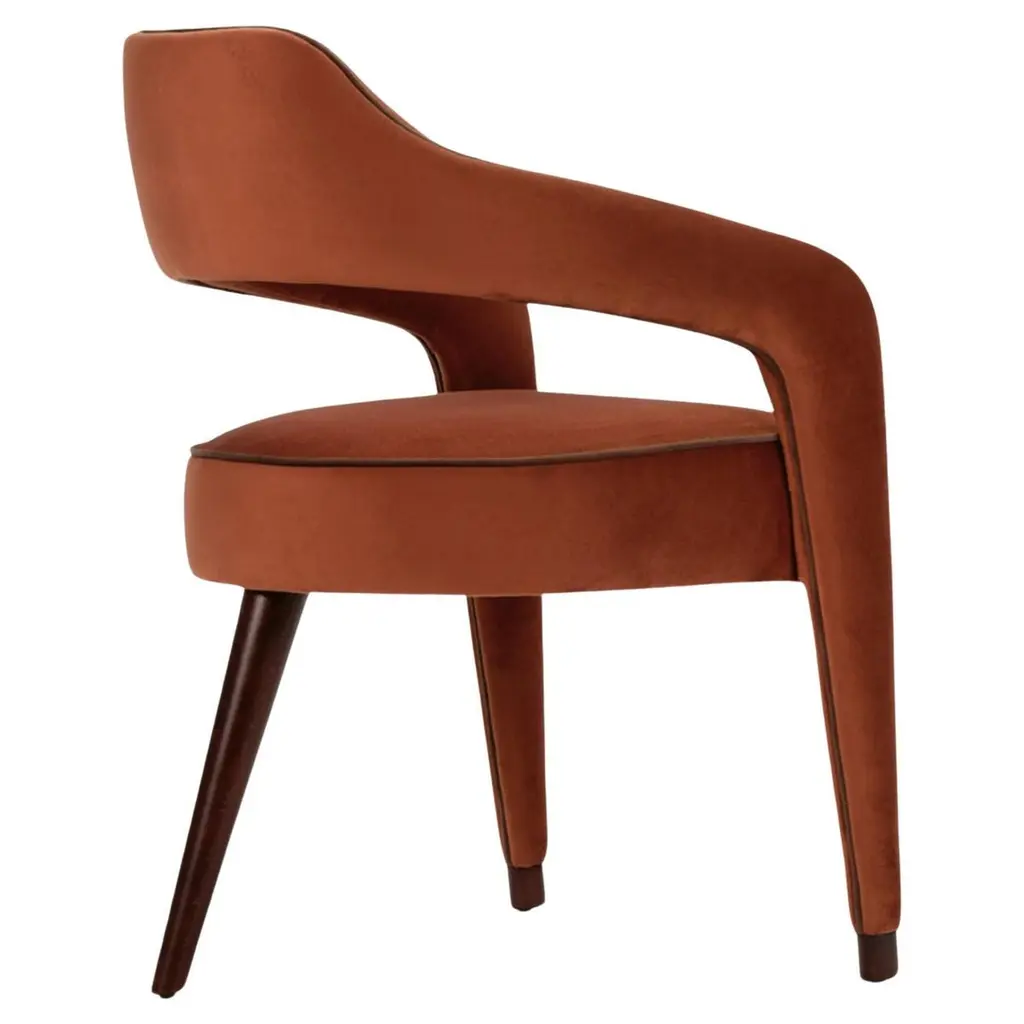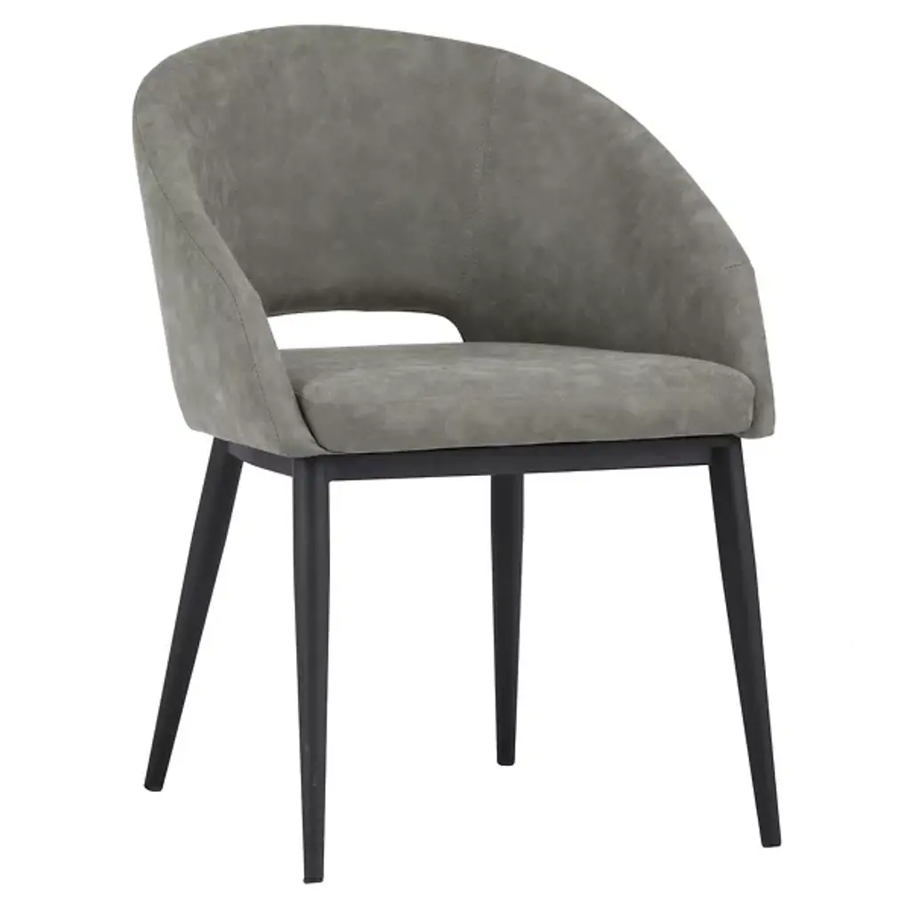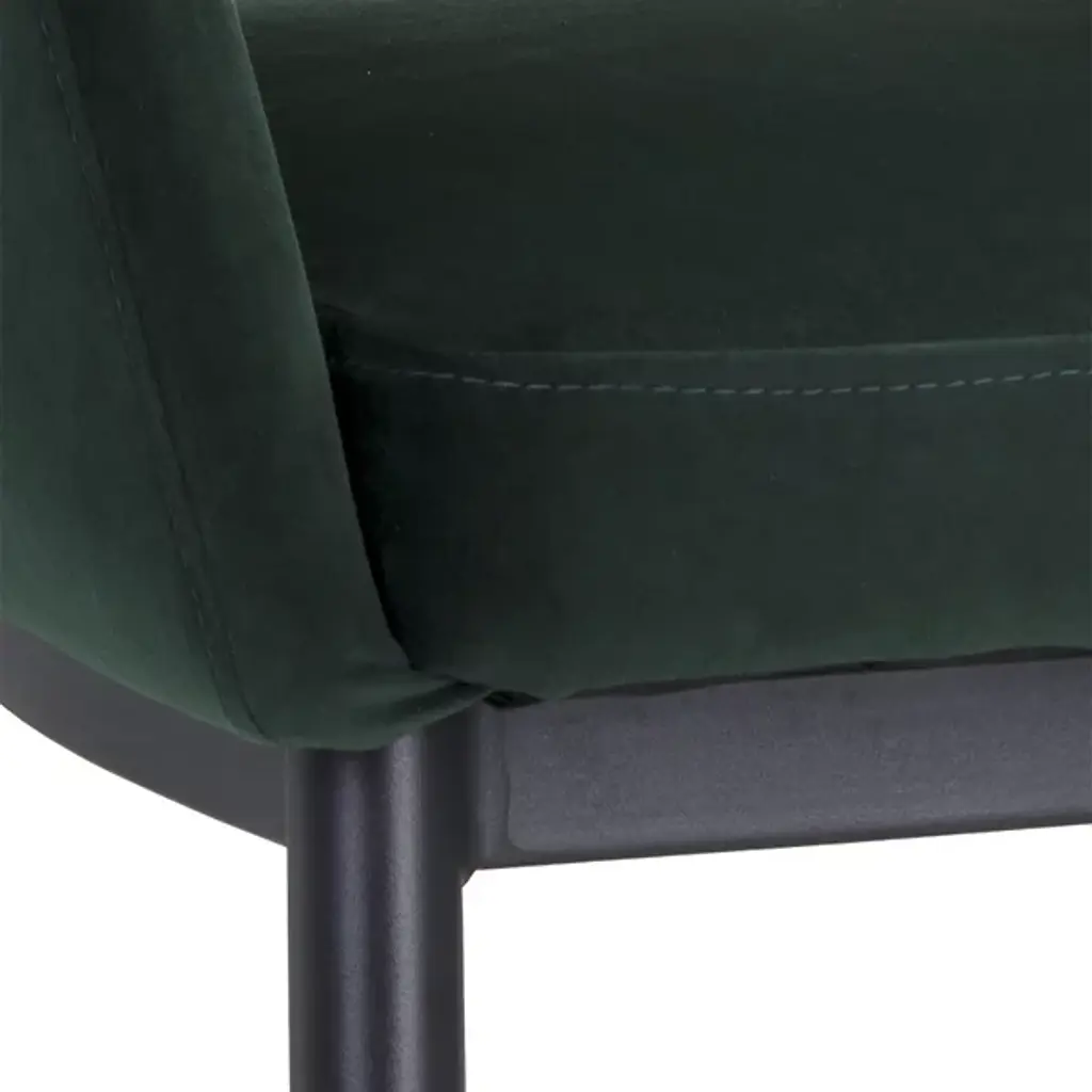 The Thatcher Dining Armchair from Sunpan offers a restrained, retro-modern refinement to inside gathering spaces. Ascending from an angular assembly of four telescoping legs, its powder-coated steel base adds both direct, robust strength and an airy refinement. A compact design with a curving barrel-style back arc around the plush seat, each upholstered in soft fabric, while a small relief cut just below the seat back adds airflow and a touch of sculptural refinement.