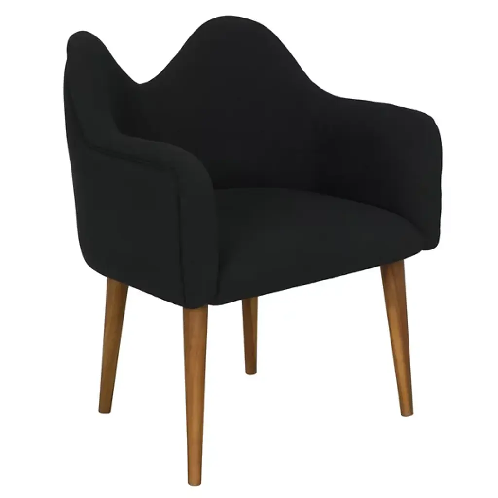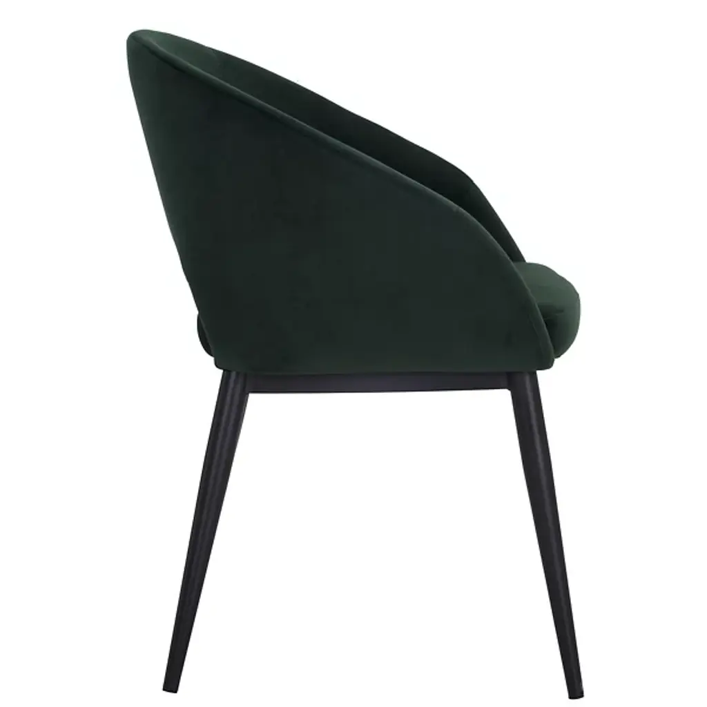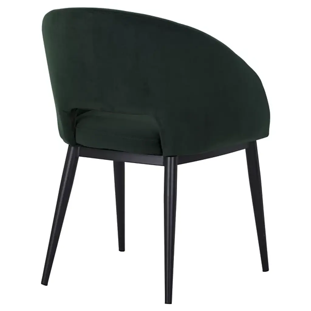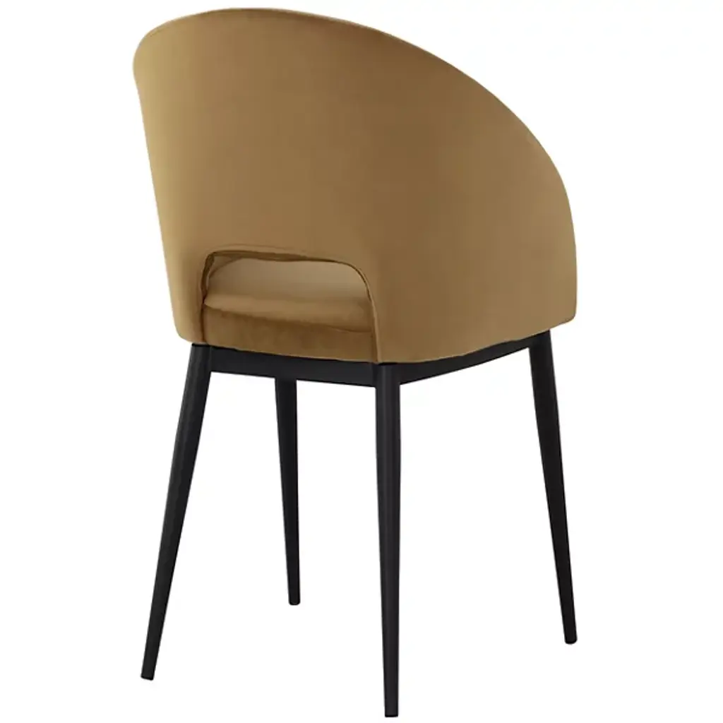 The Thatcher Dining Armchair from Sunpan offers a restrained, retro-modern refinement to inside gathering spaces. Ascending from an angular assembly of four telescoping legs, its powder-coated steel base adds both direct, robust strength and an airy refinement. A compact design with a curving barrel-style back arc around the plush seat, each upholstered in soft fabric, while a small relief cut just below the seat back adds airflow and a touch of sculptural refinement.