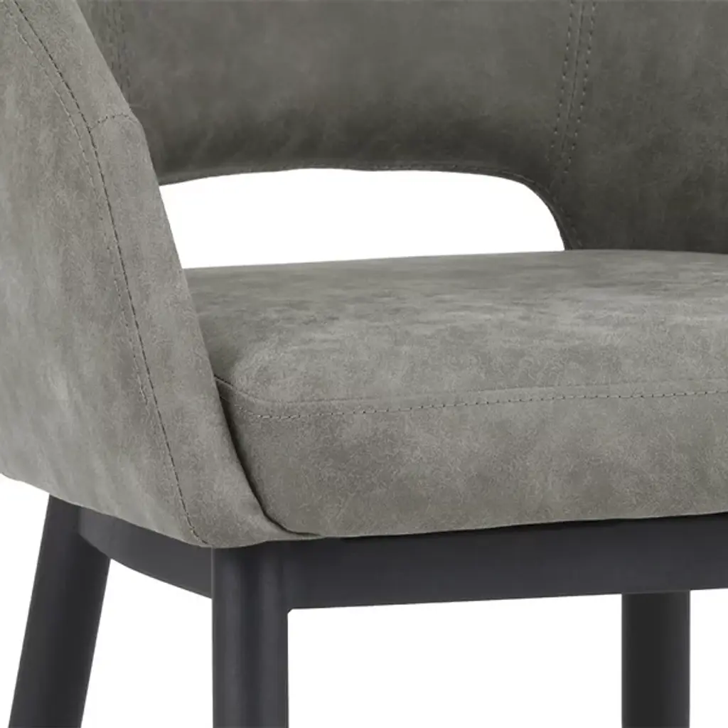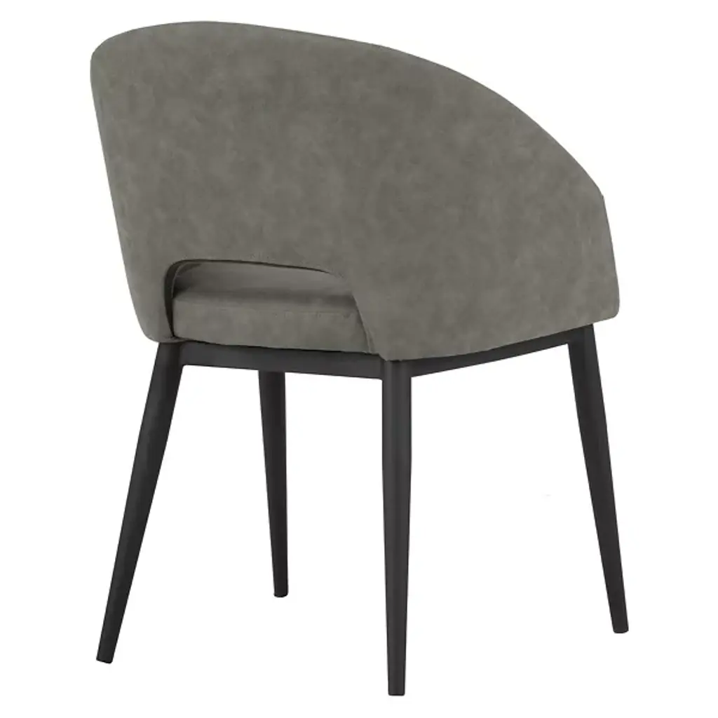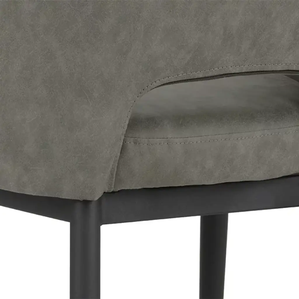 The Thatcher Dining Armchair from Sunpan offers a restrained, retro-modern refinement to inside gathering spaces. Ascending from an angular assembly of four telescoping legs, its powder-coated steel base adds both direct, robust strength and an airy refinement. A compact design with a curving barrel-style back arc around the plush seat, each upholstered in soft fabric, while a small relief cut just below the seat back adds airflow and a touch of sculptural refinement.
