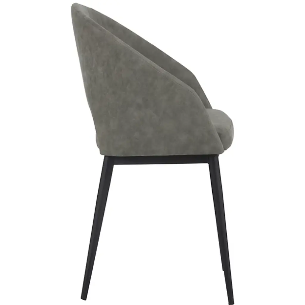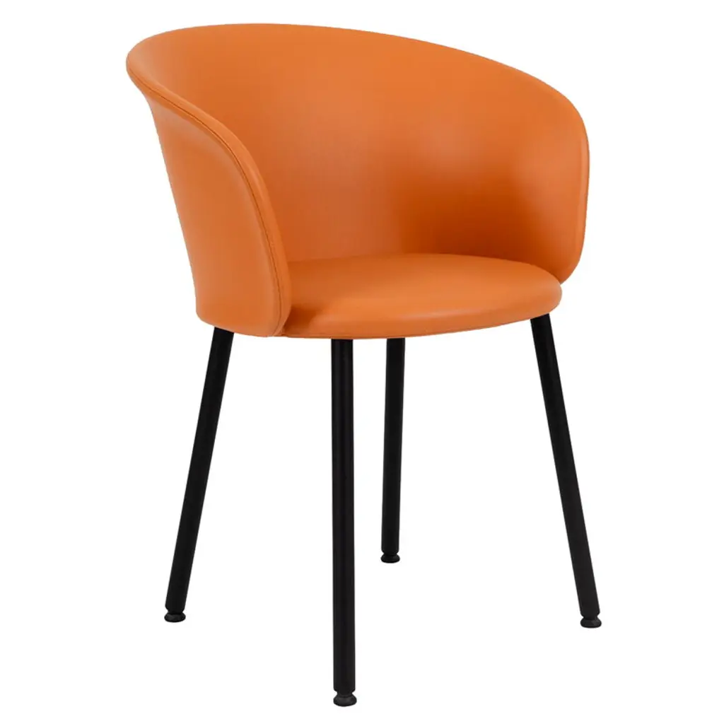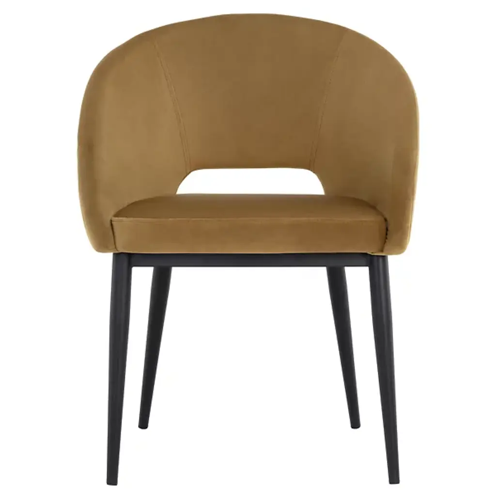 The Thatcher Dining Armchair from Sunpan offers a restrained, retro-modern refinement to inside gathering spaces. Ascending from an angular assembly of four telescoping legs, its powder-coated steel base adds both direct, robust strength and an airy refinement. A compact design with a curving barrel-style back arc around the plush seat, each upholstered in soft fabric, while a small relief cut just below the seat back adds airflow and a touch of sculptural refinement.