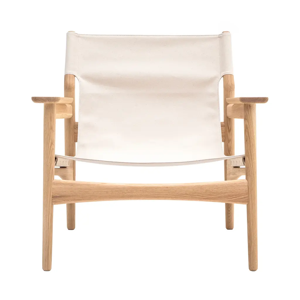 The Canvas 21 Chair, designed by Børge Mogensen for Fredericia Furniture in 1968, blends timeless elegance with relaxed simplicity. Crafted from FSC-certified solid wood and tactile canvas, it features refined brass details that age gracefully. With its clean lines and honest construction, this versatile chair adds a sophisticated touch to any interior while offering enduring comfort and style. Highlights