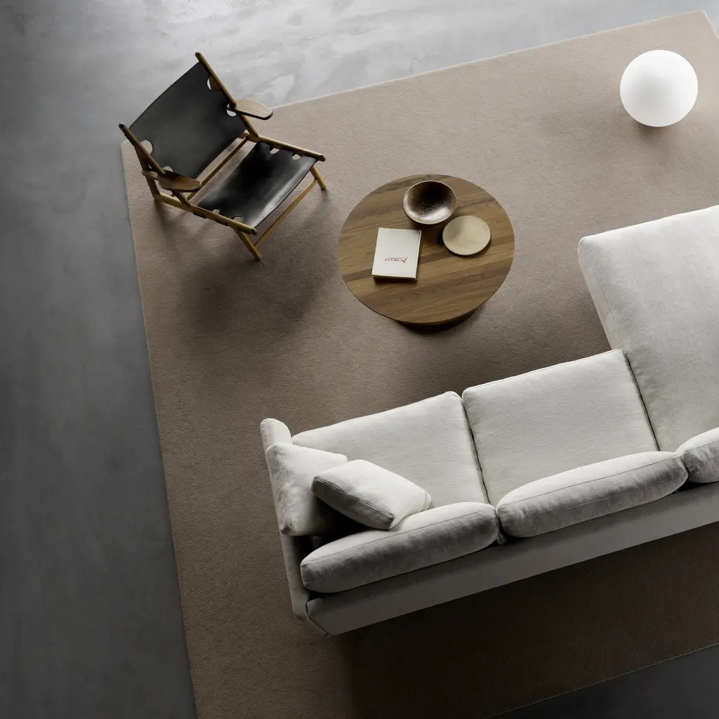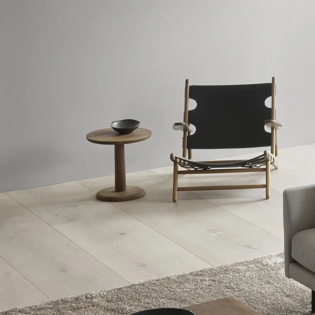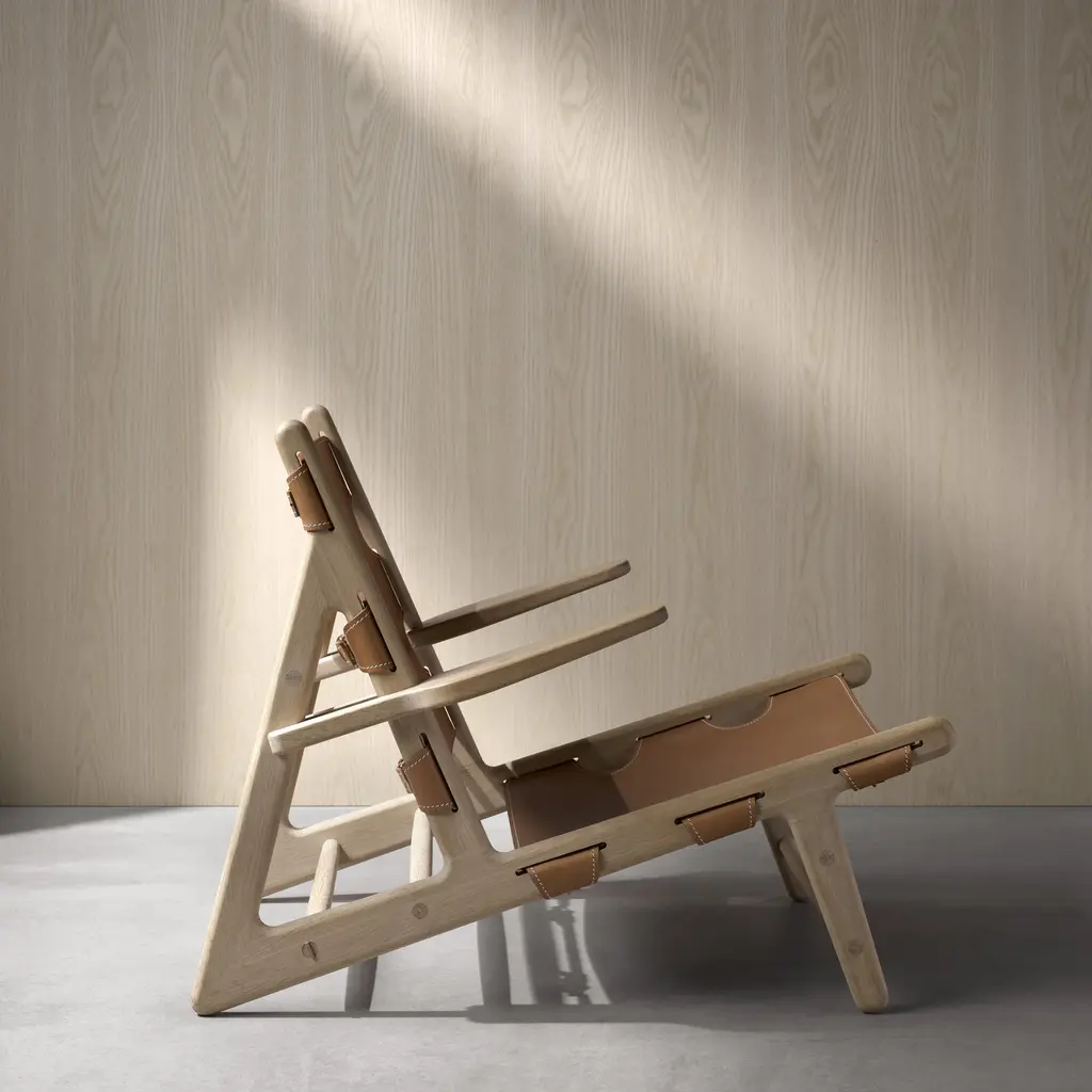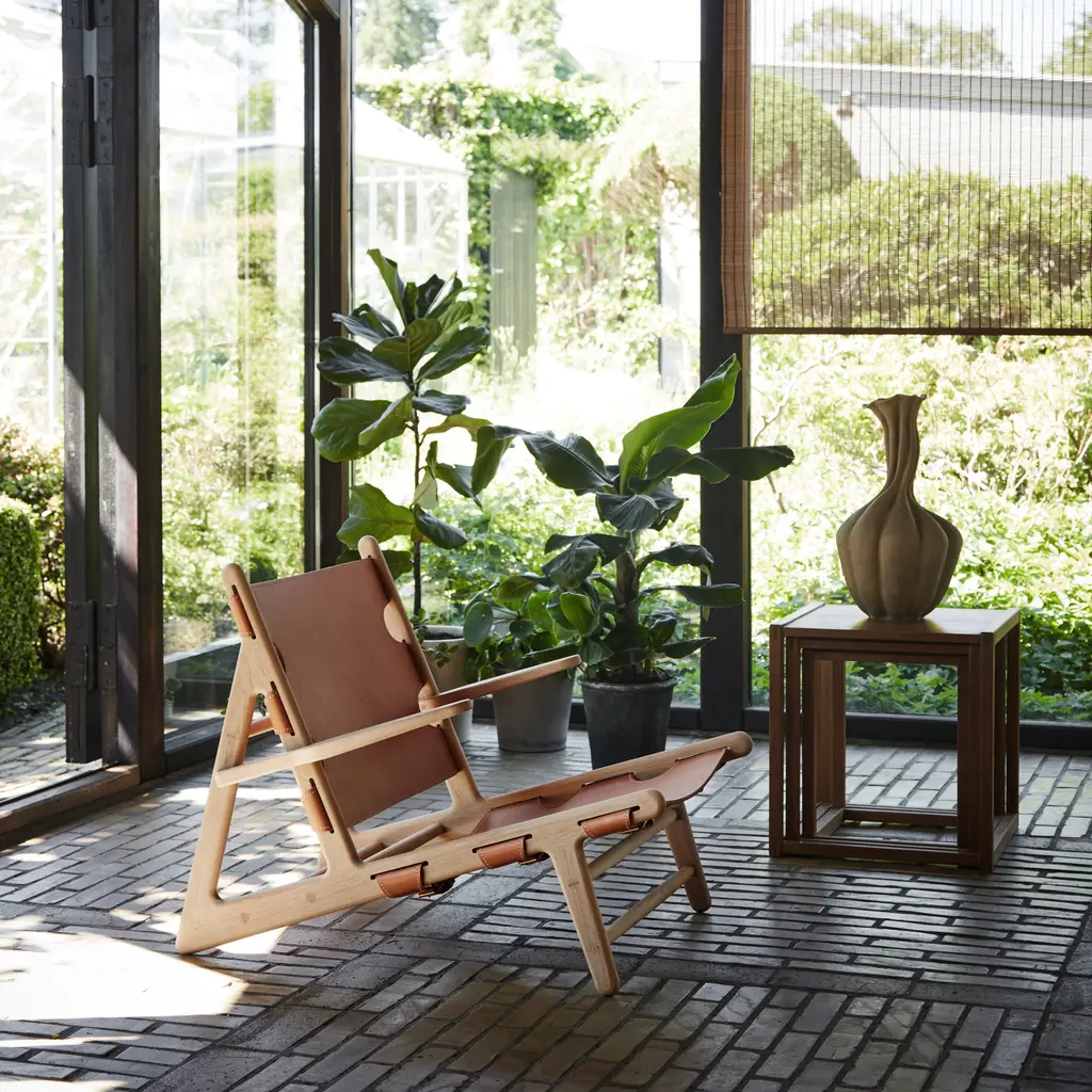 A Midcentury design known around the world, Børge Mogensen's now-classic seating draws on other simplified furniture like Shaker chairs. The Hunting Chair, part of Fredericia's Spanish collection, also follows that country's tradition of using sturdy leather to construct the seat as part of a wooden structure. Seen from the side, what’s most notable about the chair is the inviting casualness of its sharp diagonal slope from the edge of the front seat measuring only about a foot above the floor.