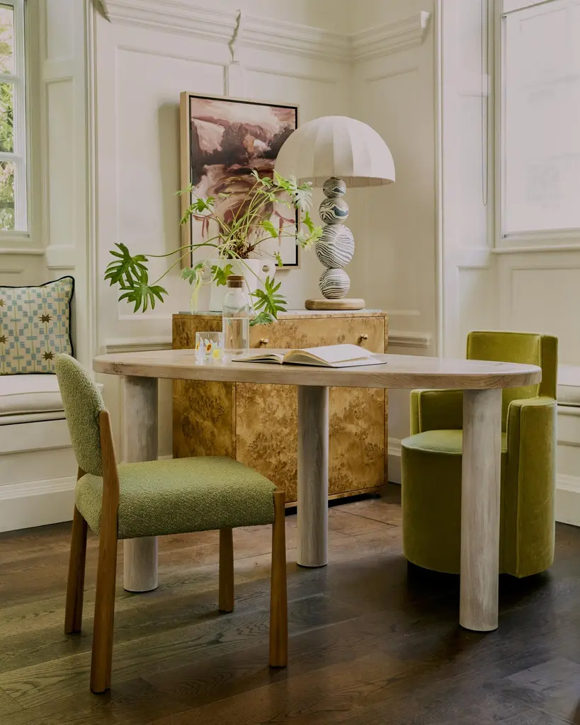 The Kudu Dining Chair borrows its poise and geometry from the king of antelopes. The legs are shaped from solid beech, then finished with a rustic oil and unique detailed carving at the feet, mimicking the hooves of this gracious beast. Upholstered here in Ismay Boucle, Elodea, and available in any of our fabrics.Materials: Solid oak frame with tapered leg, and carved foot detail. Upholstered in Ismay Boucle in Elodea but can be priced in Customers Own Material which requires 2 metres. Production lead time is 12-18 weeks from receipt of payment or arrival of COM fabric.Sister by Studio Ashby was founded in 2020 as a part shop, part playground. A playful manifestation of Studio Ashby’s aesthetic. Our collection of future heirlooms, bespoke furniture, vintage treasures, art and accessories, are all curated and designed in-house by Studio Ashby and our founder Sophie Ashby. Each and every piece has a story to tell, drawing on a myriad of references and Sophie’s continual foraging.