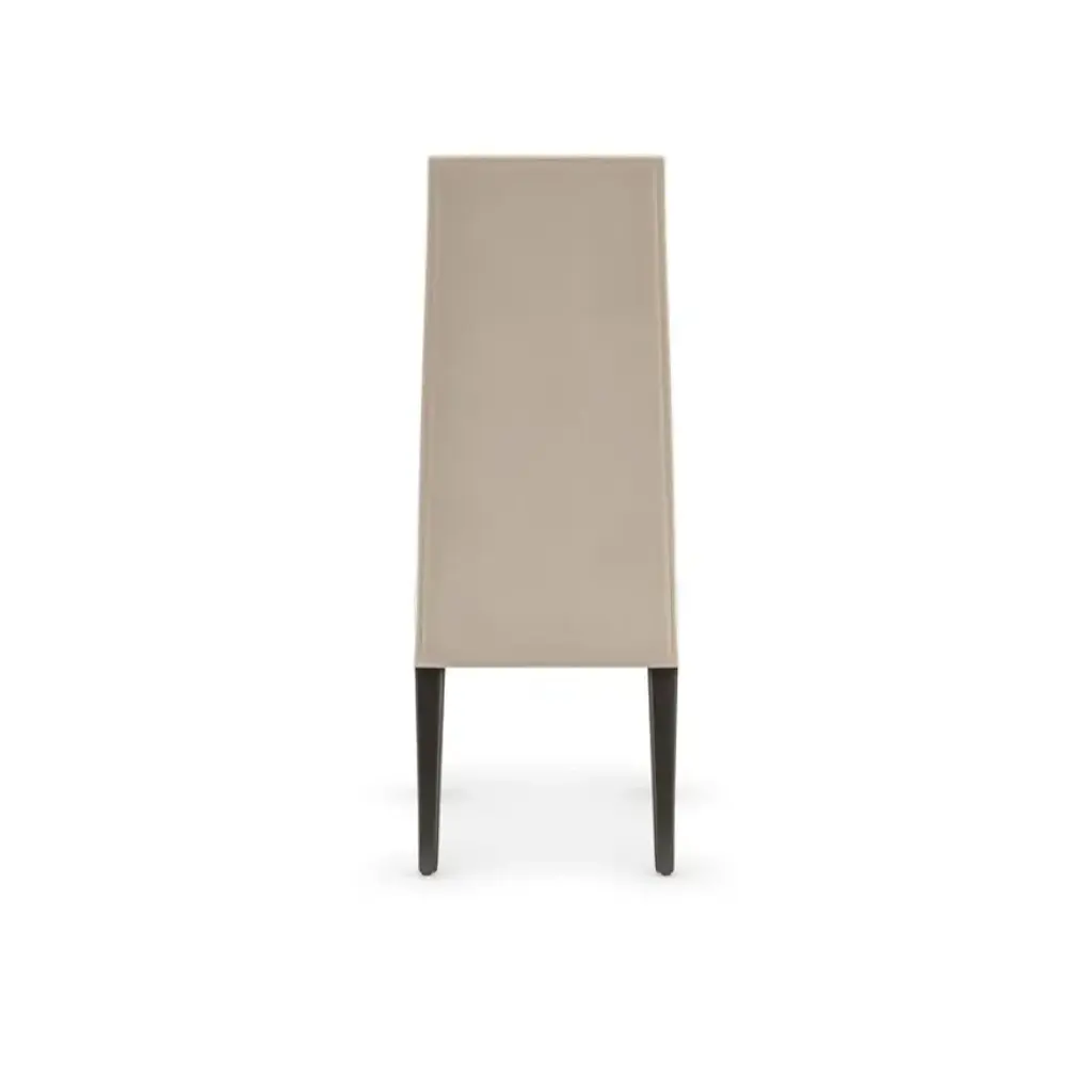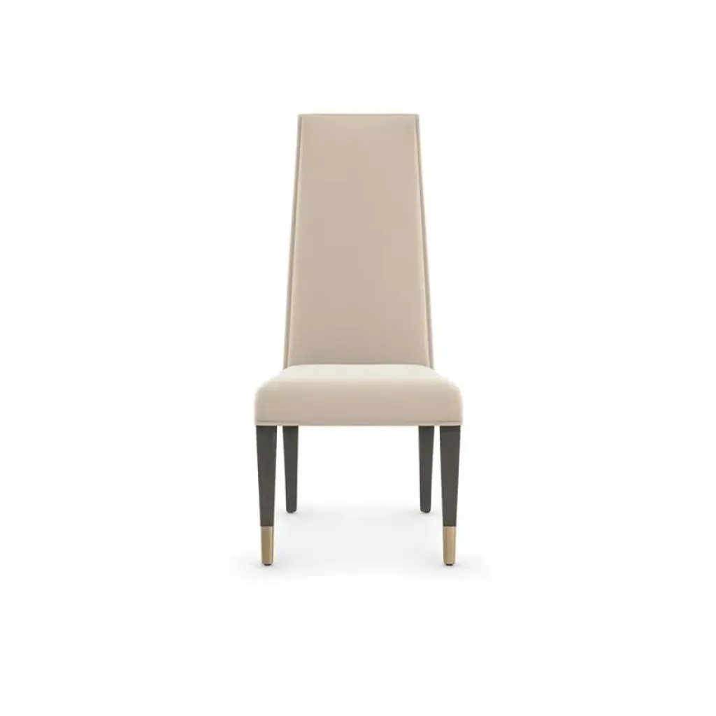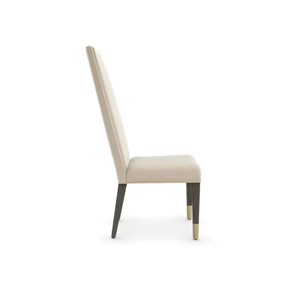 A high-fashion style designed for entertaining, this side dining chair lends a commanding presence. Angular lines and a tall, tapered back are softened by a cream-colored performance velvet that elevates comfort and lets you host worry free. Playing up its exaggerated height: Brushed Gold metal ferrules and lacquered legs in a richly contrasting, Chocolate Truffle finish, for a classic design with cosmopolitan flair.