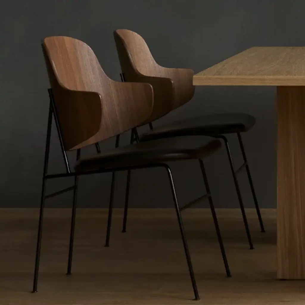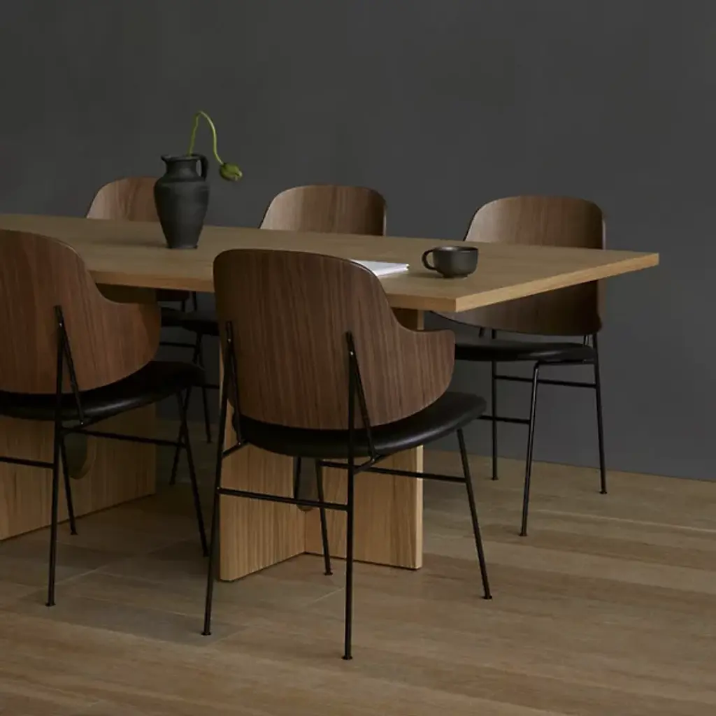 The Penguin Dining Chair from Audo Copenhagen, formerly known as Menu, invites you closer like a plump penguin’s outstretched flippers. One can’t help but smile at the sight of this piece. Danish designer Ib Kofod-Larsen’s work celebrates clean and sculptural lines. These types of lines translate to pure comfort in the chair’s connected arm and backrest. This hugging element says time-tested sophistication with a woodgrain surface. The bent seat underneath it is a simple pleasure when resting for long durations. A graphic powder-coated stainless steel framework connects the sculptural shapes with dynamic lines that are balanced for the dining posture. This Scandinavian-style chair is composed of oak veneer and beech plywood. Foam filler adds comfort and facilitates relaxation.