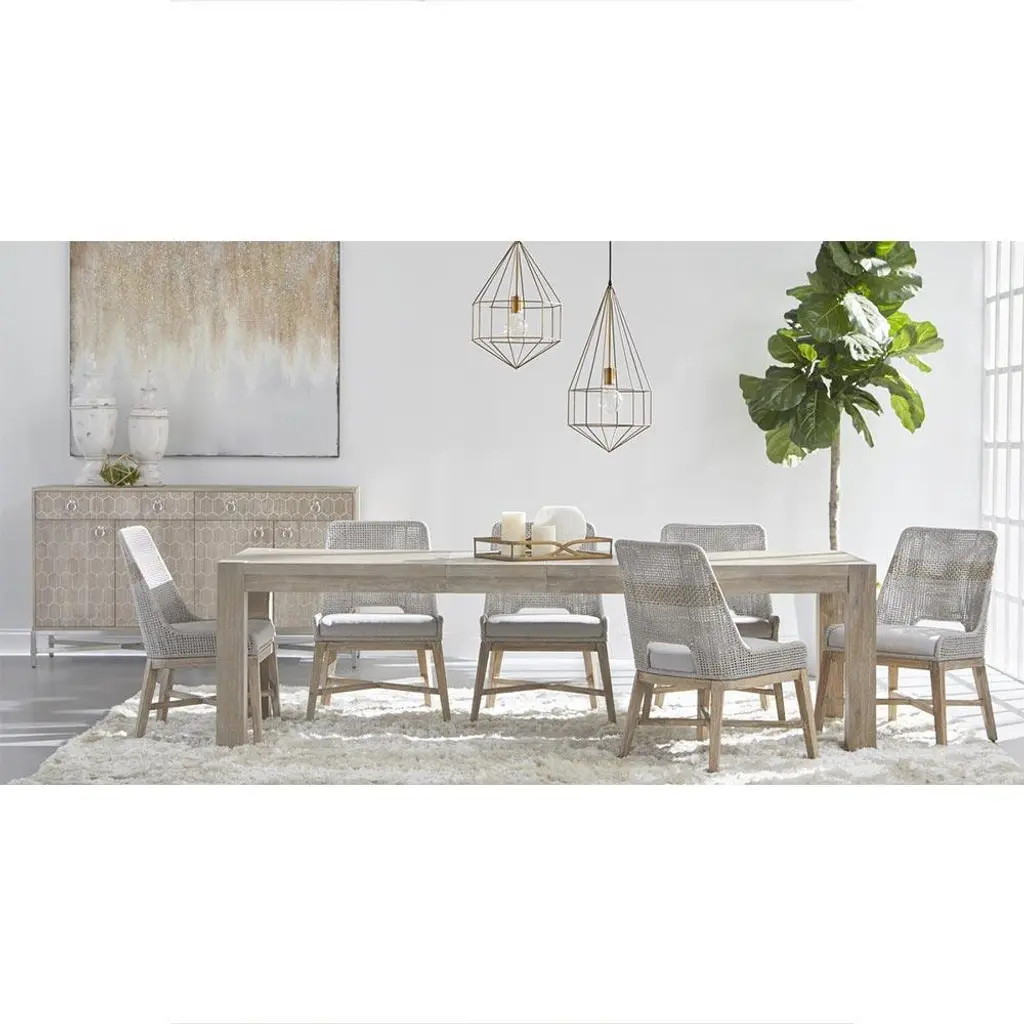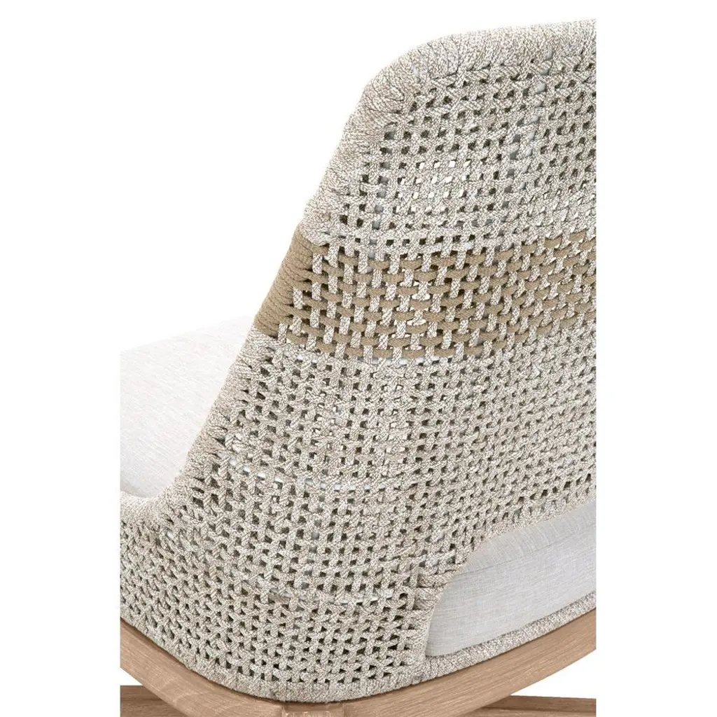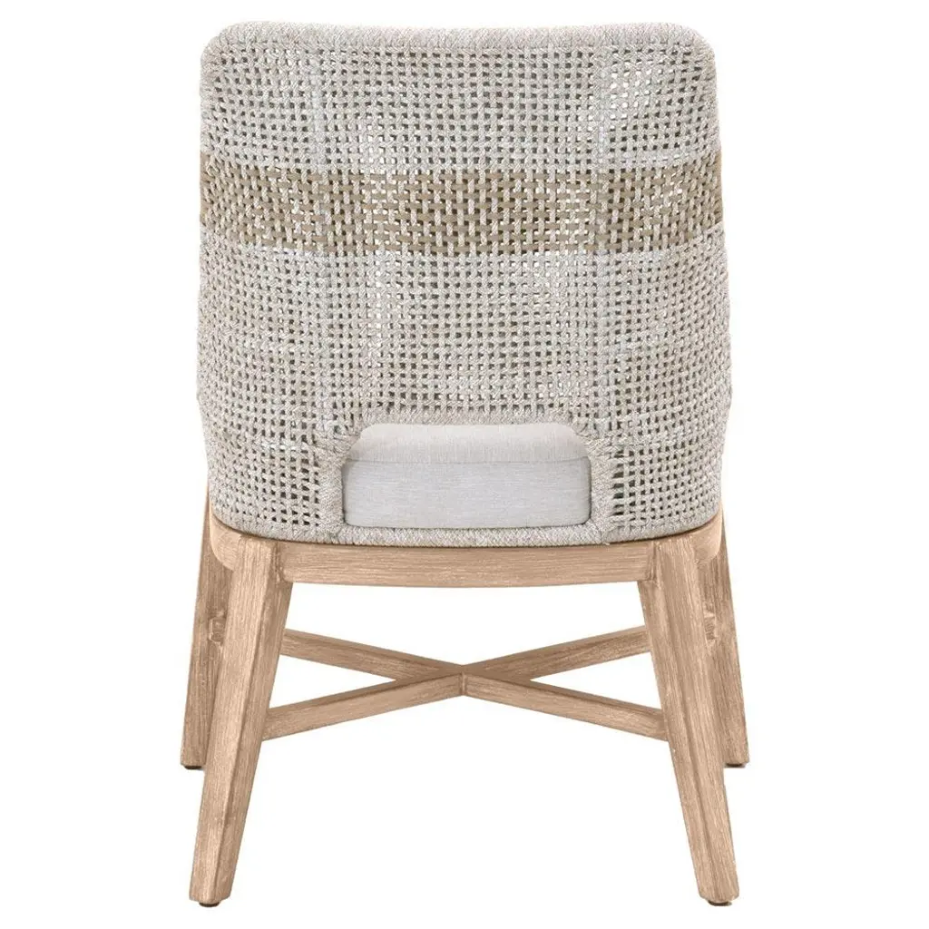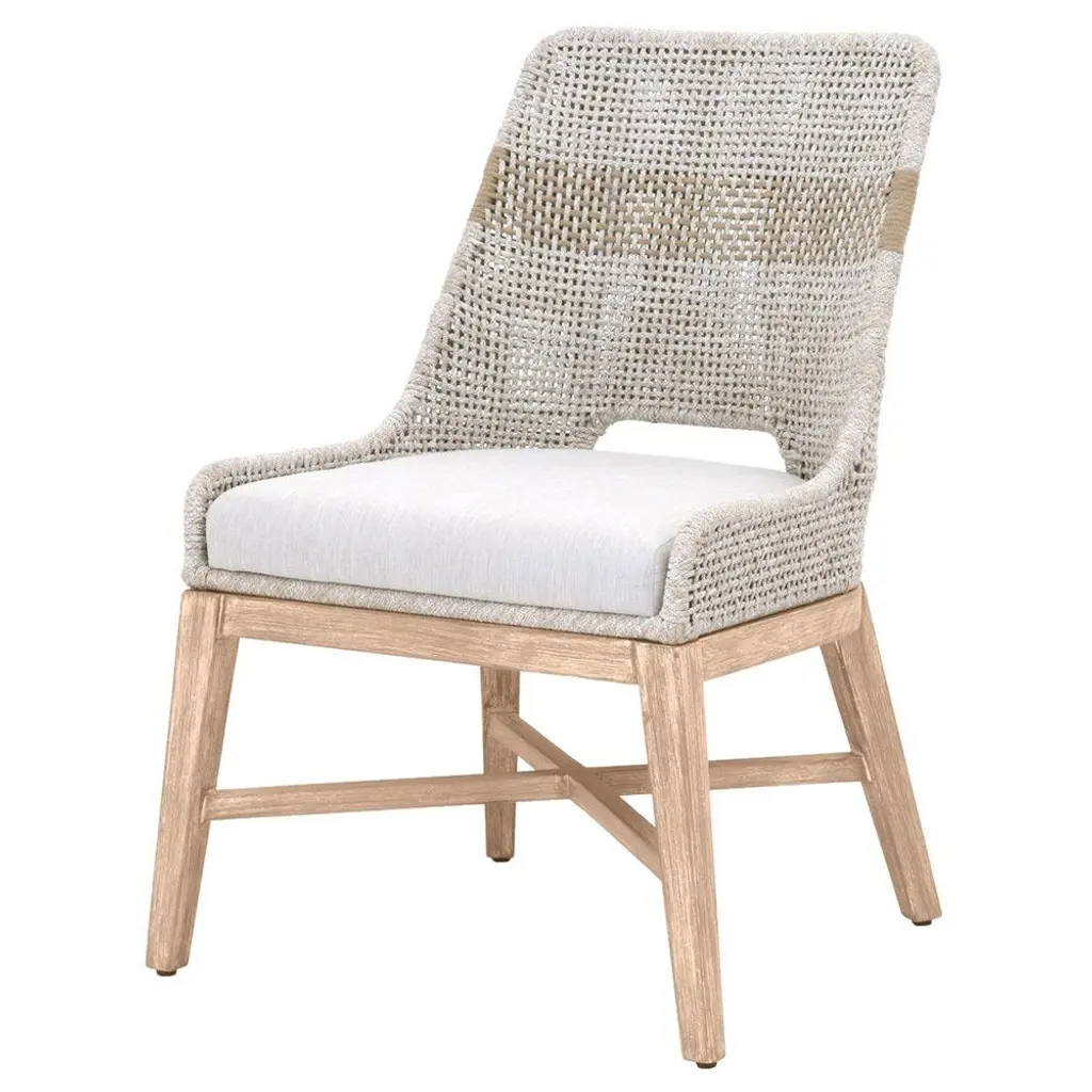 This set of two Theodore dining chairs exudes coastal sophistication. Set atop a natural grey-finished mahogany frame, the backrest features intricately woven polyolefin rope in grey and taupe hues. Its foam seat cushion is upholstered in light grey olefin performance fabric.