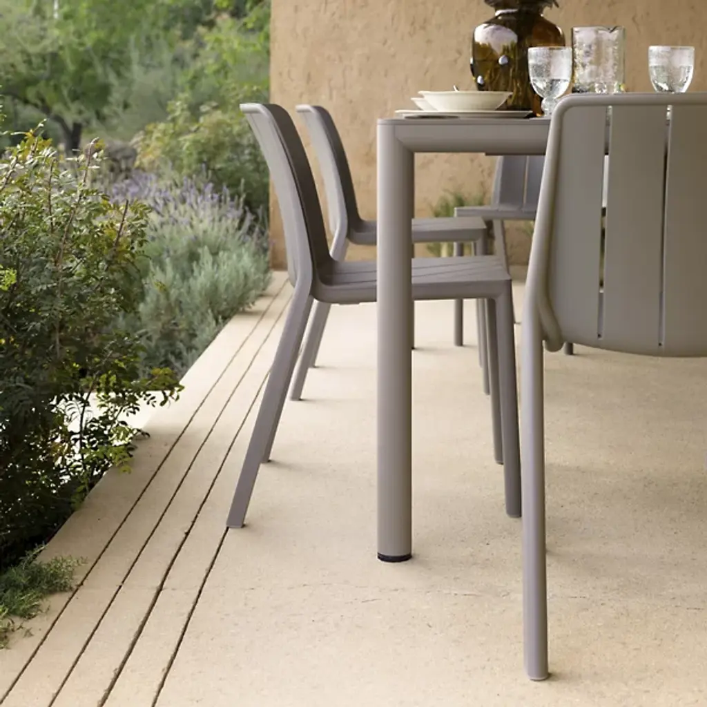 The Tiberina Bistrot Outdoor Side Chair, Set of 4 from Nardi Outdoor offers stylish, eco-conscious seating for patios, balconies, or garden spaces. Designed by Raffaello Galiotto and made in Italy, each chair is molded from recyclable fiberglass-reinforced polypropylene resin. Four slim, strong legs support a slatted seat and back, allowing for airflow and quick drainage, while small, non-slip feet keep the chair steady. The gently curved backrest provides a comfortable rest, while a stackable design simplifies storage.