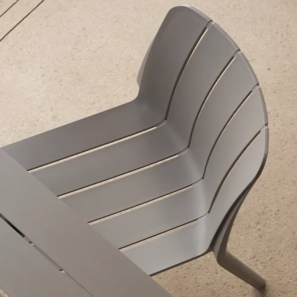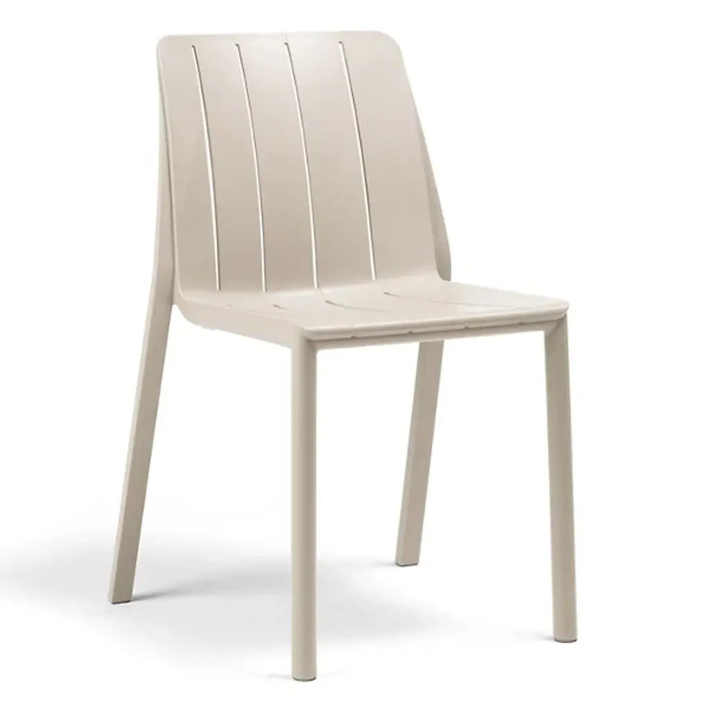 The Tiberina Bistrot Outdoor Side Chair, Set of 4 from Nardi Outdoor offers stylish, eco-conscious seating for patios, balconies, or garden spaces. Designed by Raffaello Galiotto and made in Italy, each chair is molded from recyclable fiberglass-reinforced polypropylene resin. Four slim, strong legs support a slatted seat and back, allowing for airflow and quick drainage, while small, non-slip feet keep the chair steady. The gently curved backrest provides a comfortable rest, while a stackable design simplifies storage.
