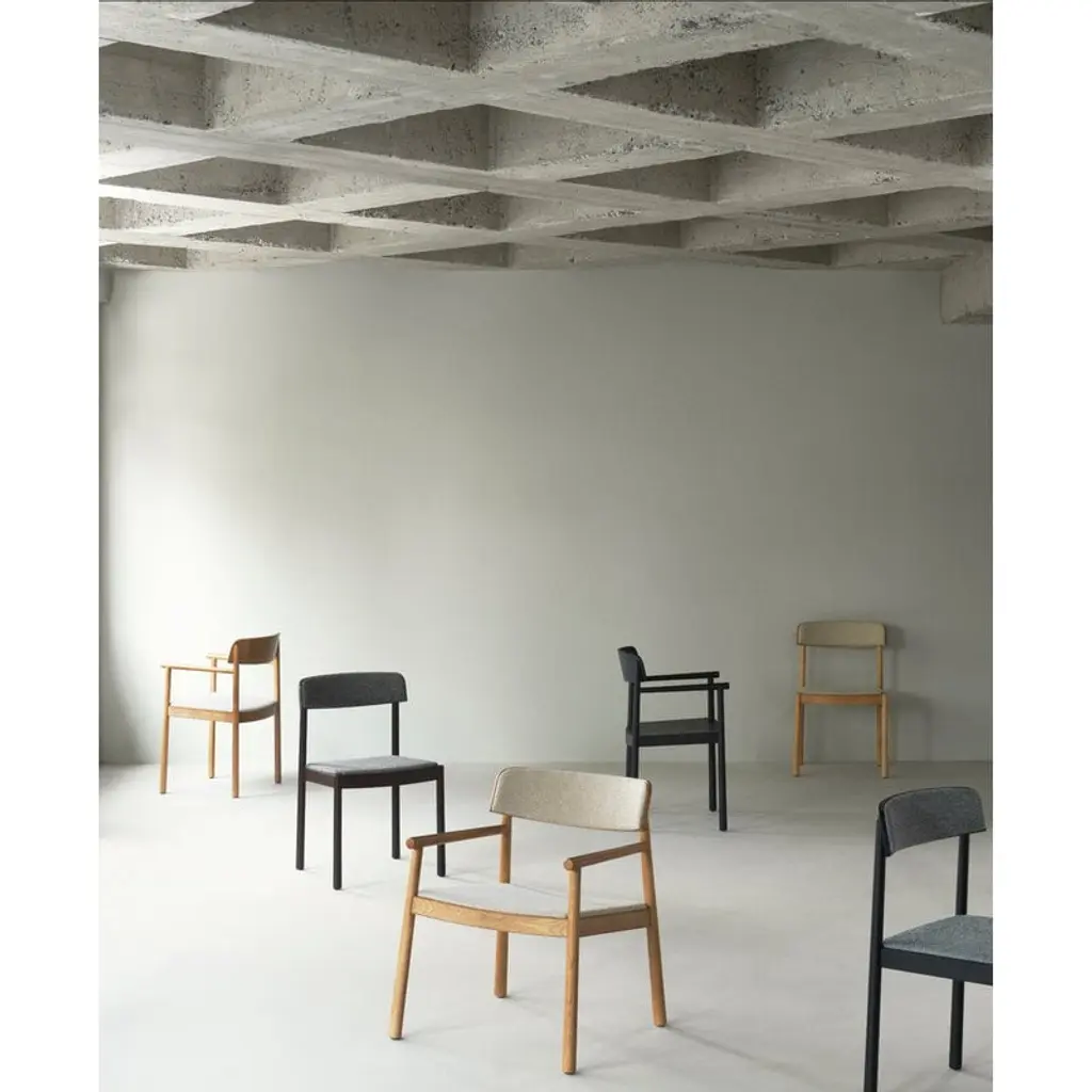 Normann Copenhagen’s Timb chair is a tribute to Nordic design and woodworking traditions. Designed by Simon Legald, the Timb chair is crafted from ash, and due to the skillfully made dowel joints, no metal screws have been used. The solid wood frame and the pleasantly wide veneer seat and back have unique wood grain patterns. The end result is a combination of straight and soft lines, as well as refined modesty and bold elegance. Thanks to their timeless look, the Timb chairs are suited for a large variety of interiors and uses, ranging from domestic dining rooms to conference spaces and from cafés and restaurants to hospitality use. The Timb collection consists of chairs in various designs: with or without armrests and with or without upholstery.