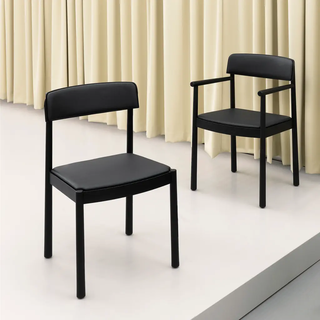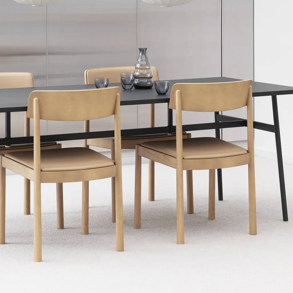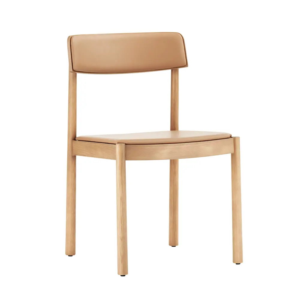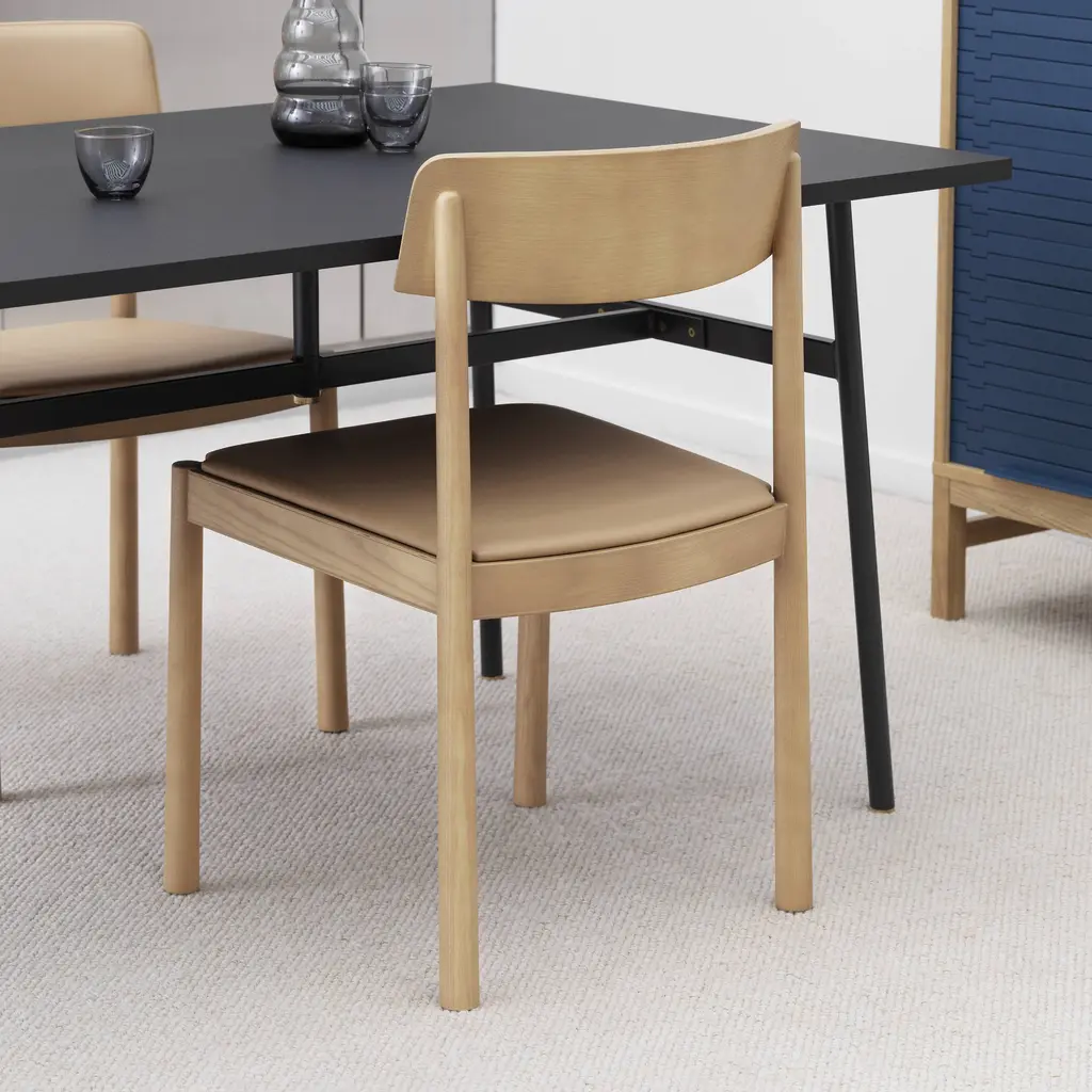 With its padded seat and backrest smartly clad in matte leather to match either the tan or black lacquered finish, Simon Legald's side chair retains its honest simplicity. Timb features a subtle interplay of curves and straight lines and the artisanal dowel joinery makes it possible to produce the sustainably sourced wood chair without the need for screws. Its solid-ash frame and comfortably roomy seat and backrest lend a self-effacing quality that allows the design to blend easily in almost any setting.