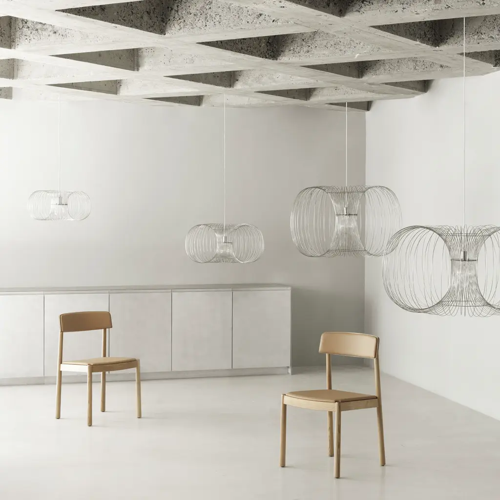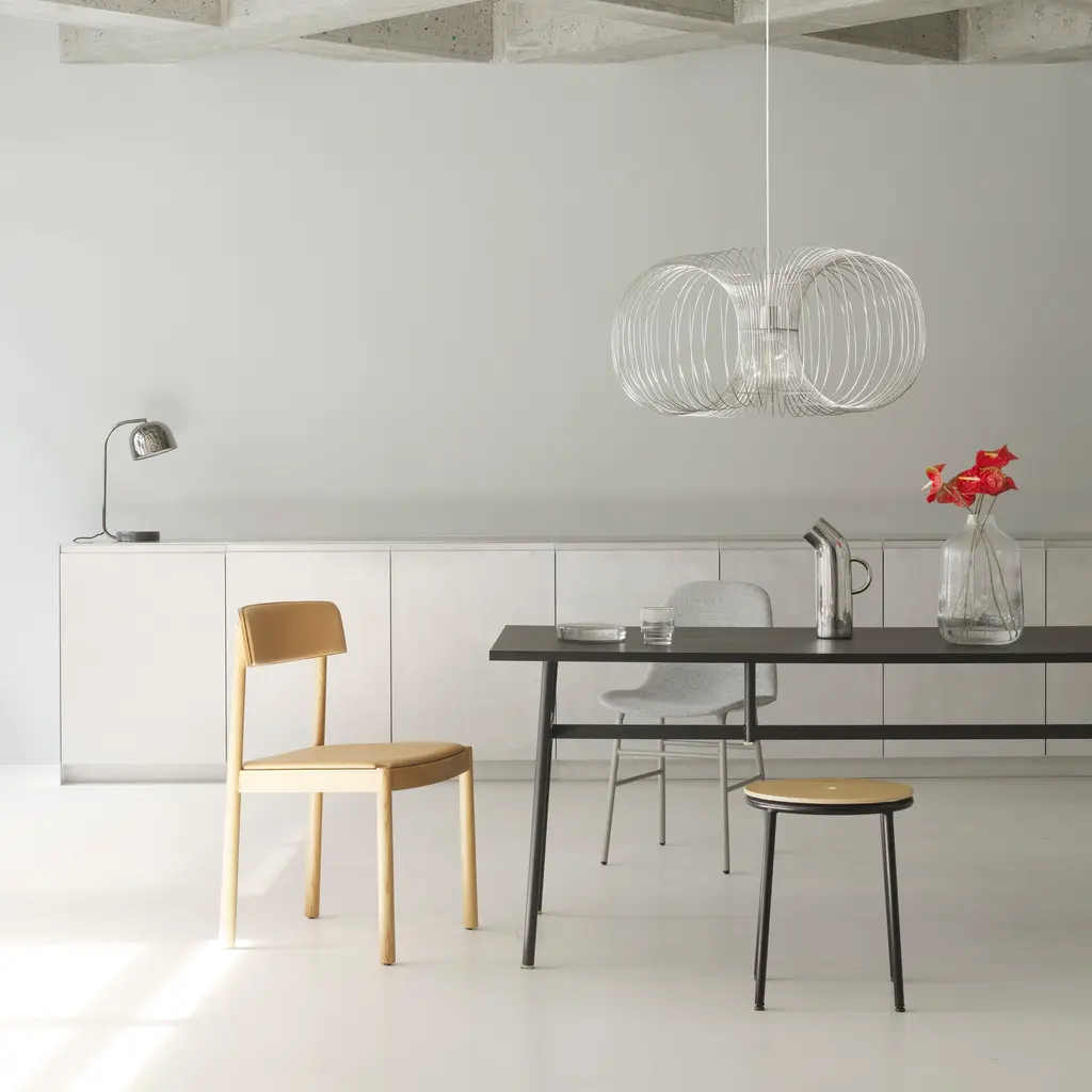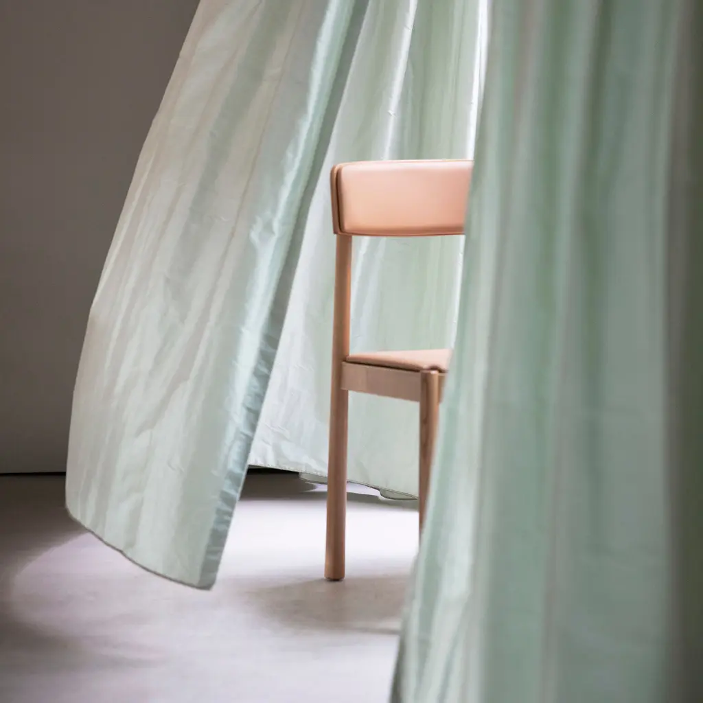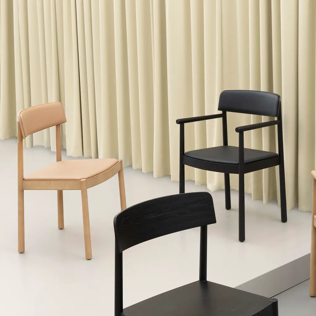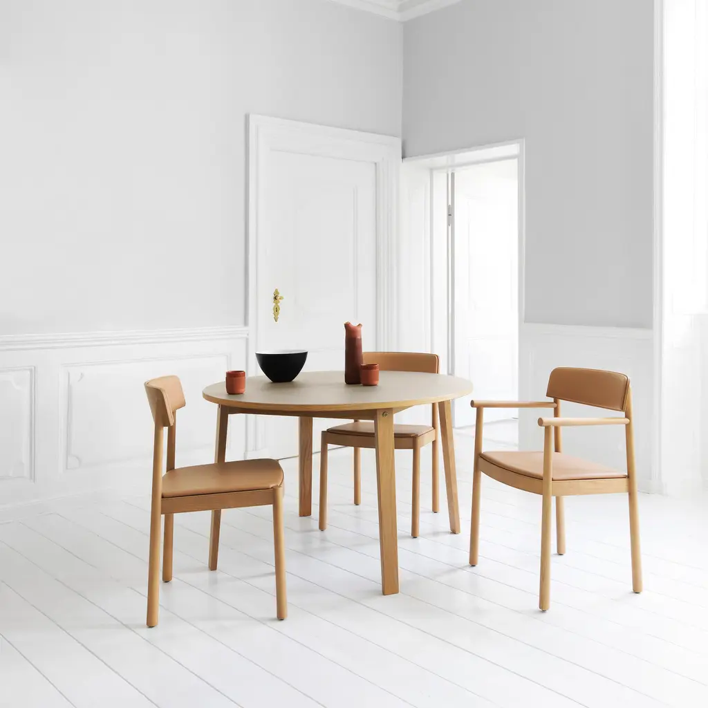 With its padded seat and backrest smartly clad in matte leather to match either the tan or black lacquered finish, Simon Legald's side chair retains its honest simplicity. Timb features a subtle interplay of curves and straight lines and the artisanal dowel joinery makes it possible to produce the sustainably sourced wood chair without the need for screws. Its solid-ash frame and comfortably roomy seat and backrest lend a self-effacing quality that allows the design to blend easily in almost any setting.