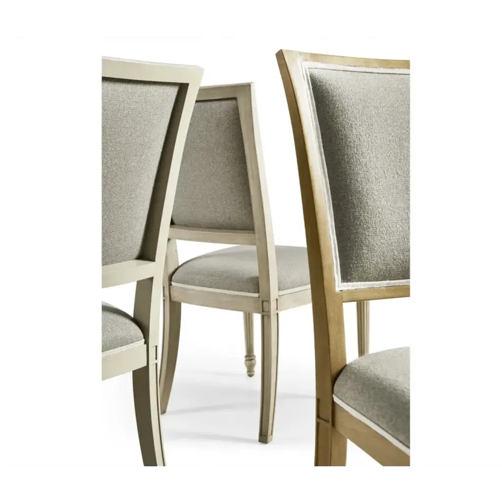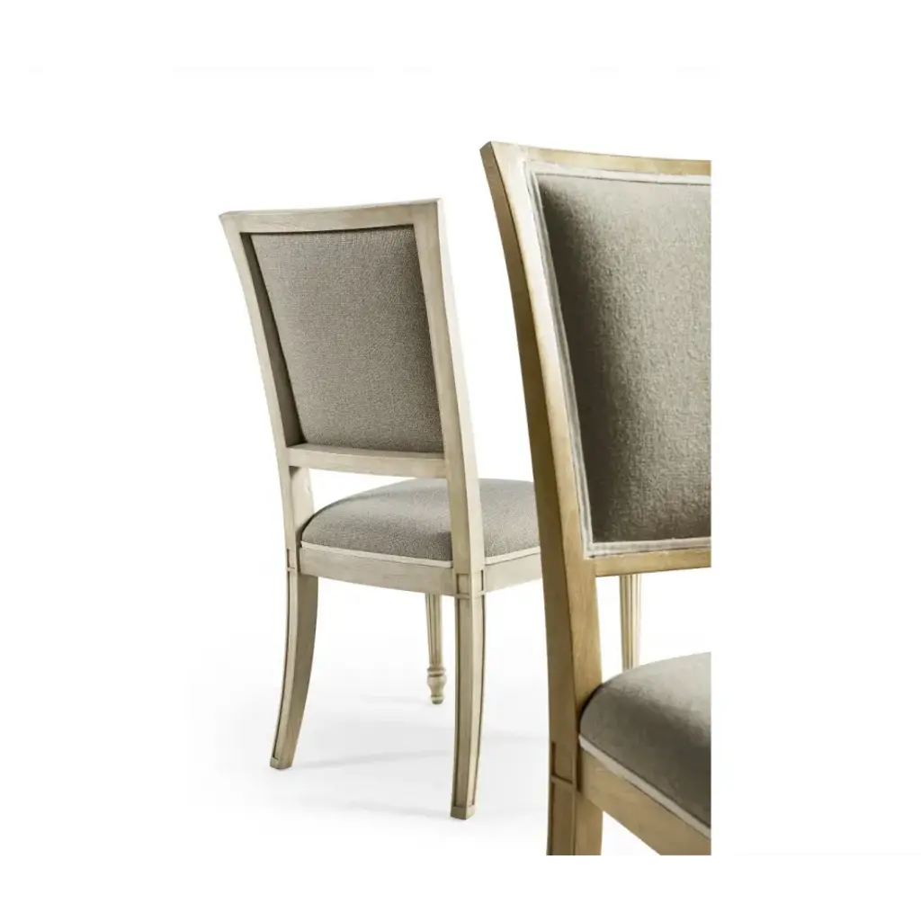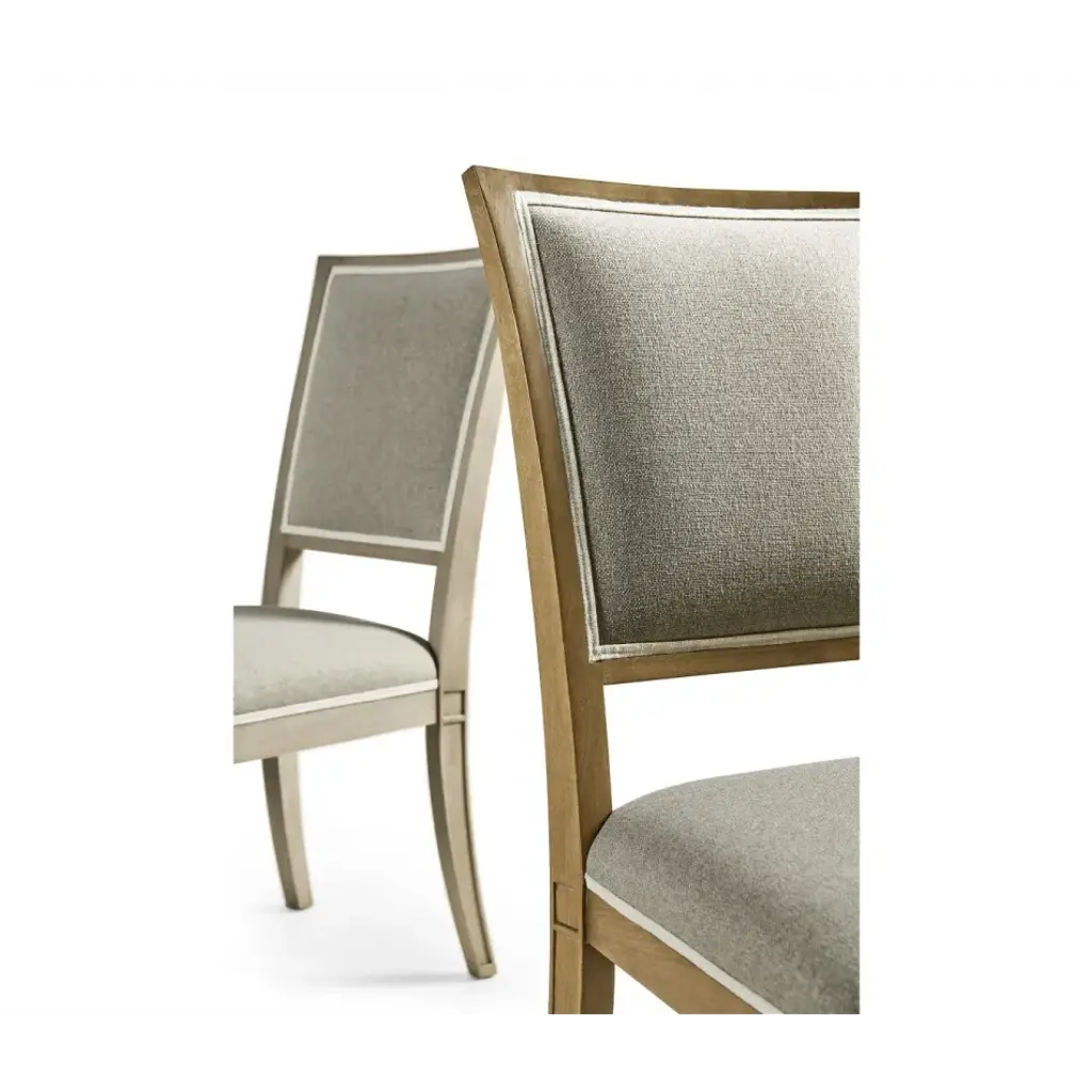 003-2-130-BLW The Jonathan Charles Flare Upholstered Side Chair Flared Top is an exquisite piece of structural art that quietly demands attention. With an uninhibited focus on timeless design, the decadent natural Beech Wood frame enhanced with London Mist finish exemplifies an unrivaled old world sophistication and provides a striking feature for any dining space. Hand upholstered in a rich creamy oatmeal performance fabric, the cushions are simultaneously durable and luxurious to the touch.