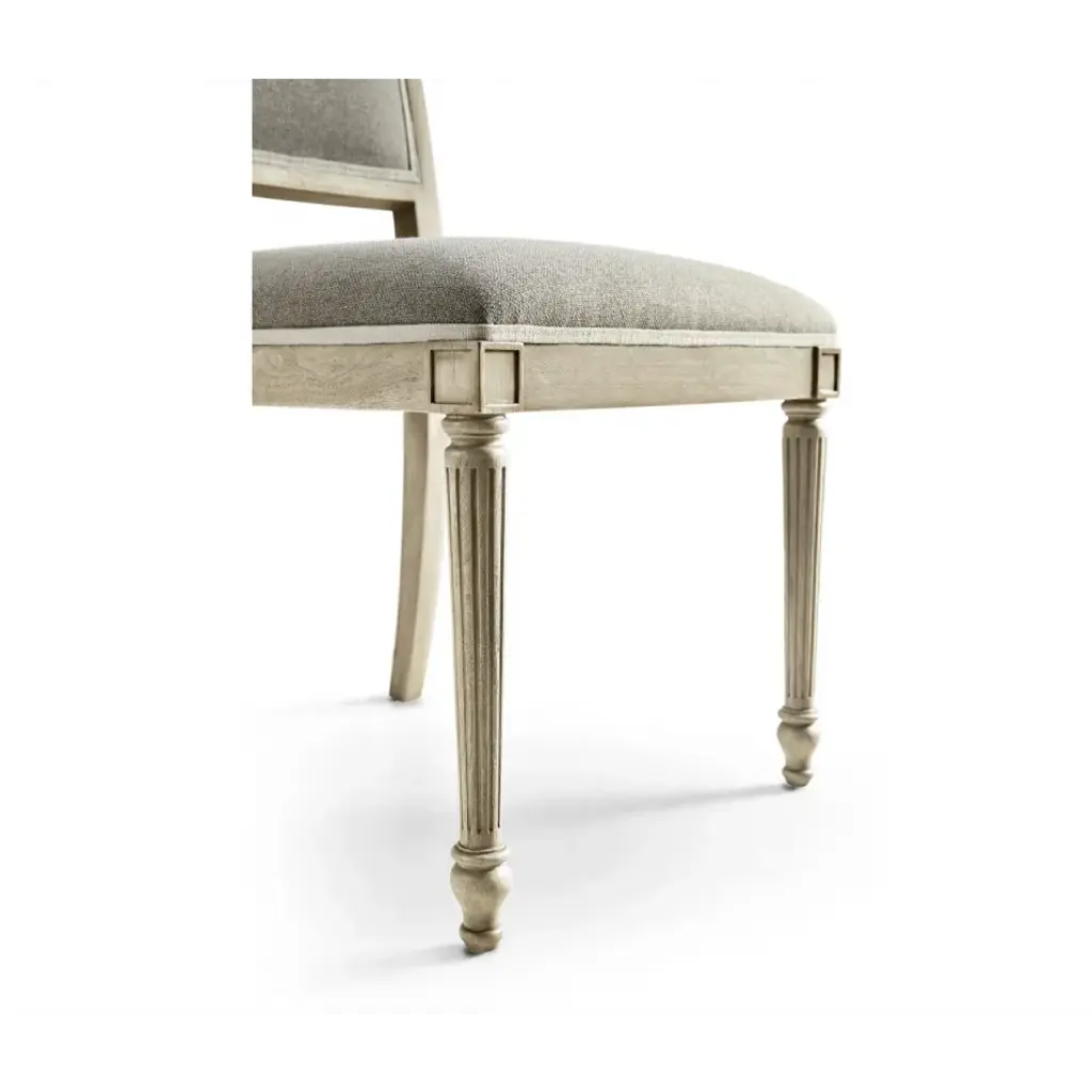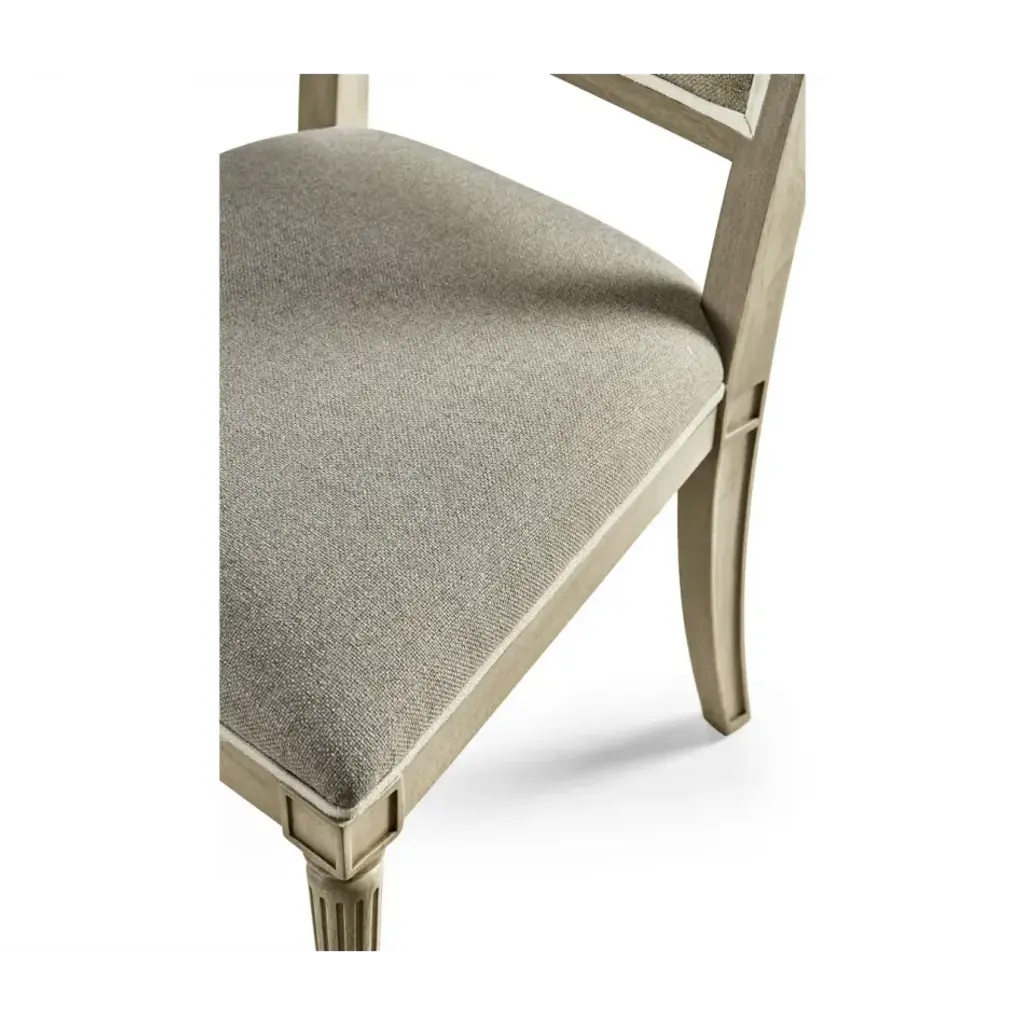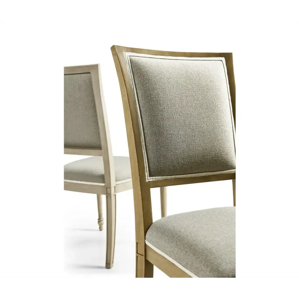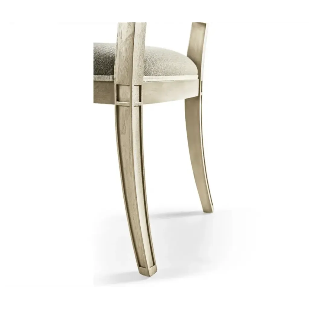003-2-130-BLW The Jonathan Charles Flare Upholstered Side Chair Flared Top is an exquisite piece of structural art that quietly demands attention. With an uninhibited focus on timeless design, the decadent natural Beech Wood frame enhanced with London Mist finish exemplifies an unrivaled old world sophistication and provides a striking feature for any dining space. Hand upholstered in a rich creamy oatmeal performance fabric, the cushions are simultaneously durable and luxurious to the touch.