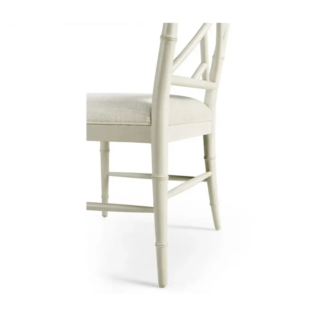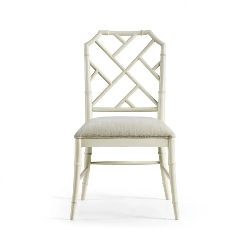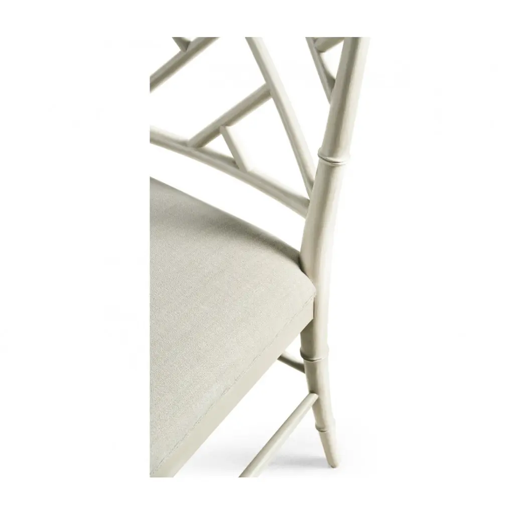 003-2-121-LMS Created by the masterful Jonathan Charles craftsmen and women, the Saros Chippendale Bamboo Side Chair is a fresh and zany take on timeless design. A geometric design lattice back formed out of bamboo is finished in deliciously dry London Mist with light distressing to create a masterful showstopper. Upholstered in earthy oatmeal performance fabric, the Saros chair adds comfort and intrigue to refined dining spaces.