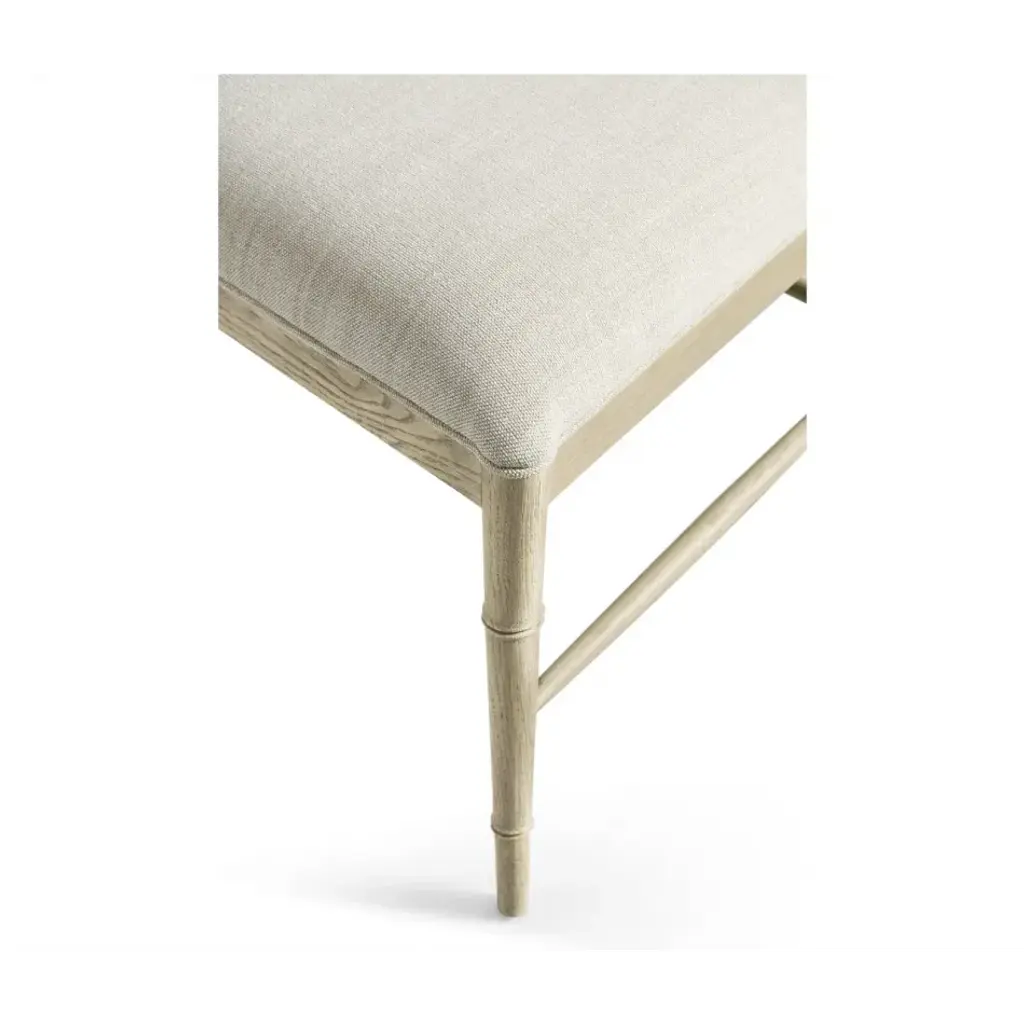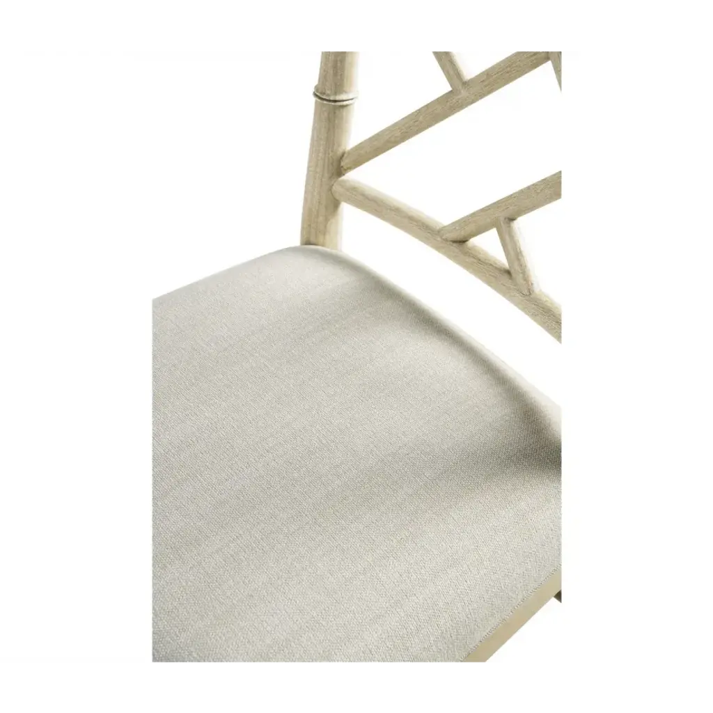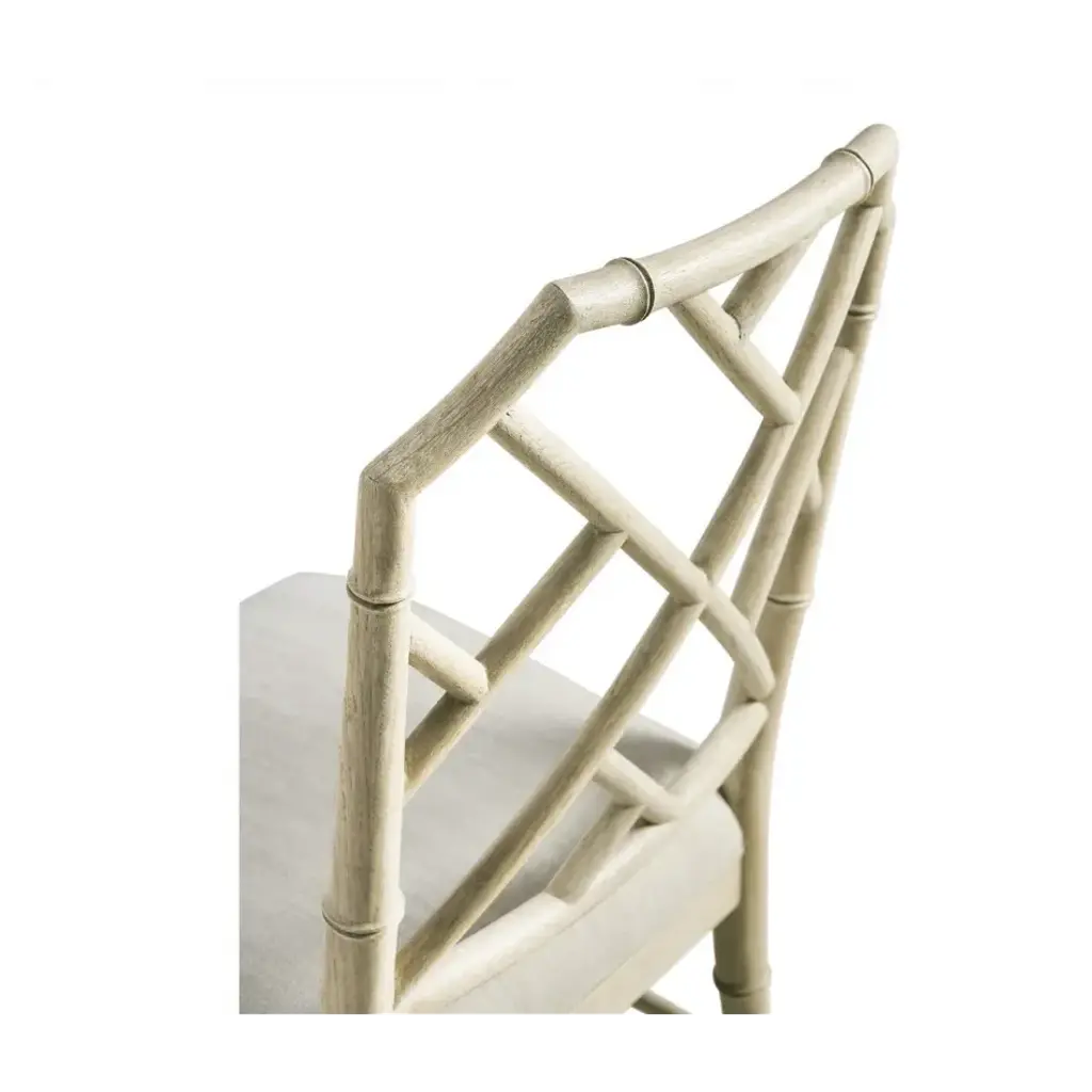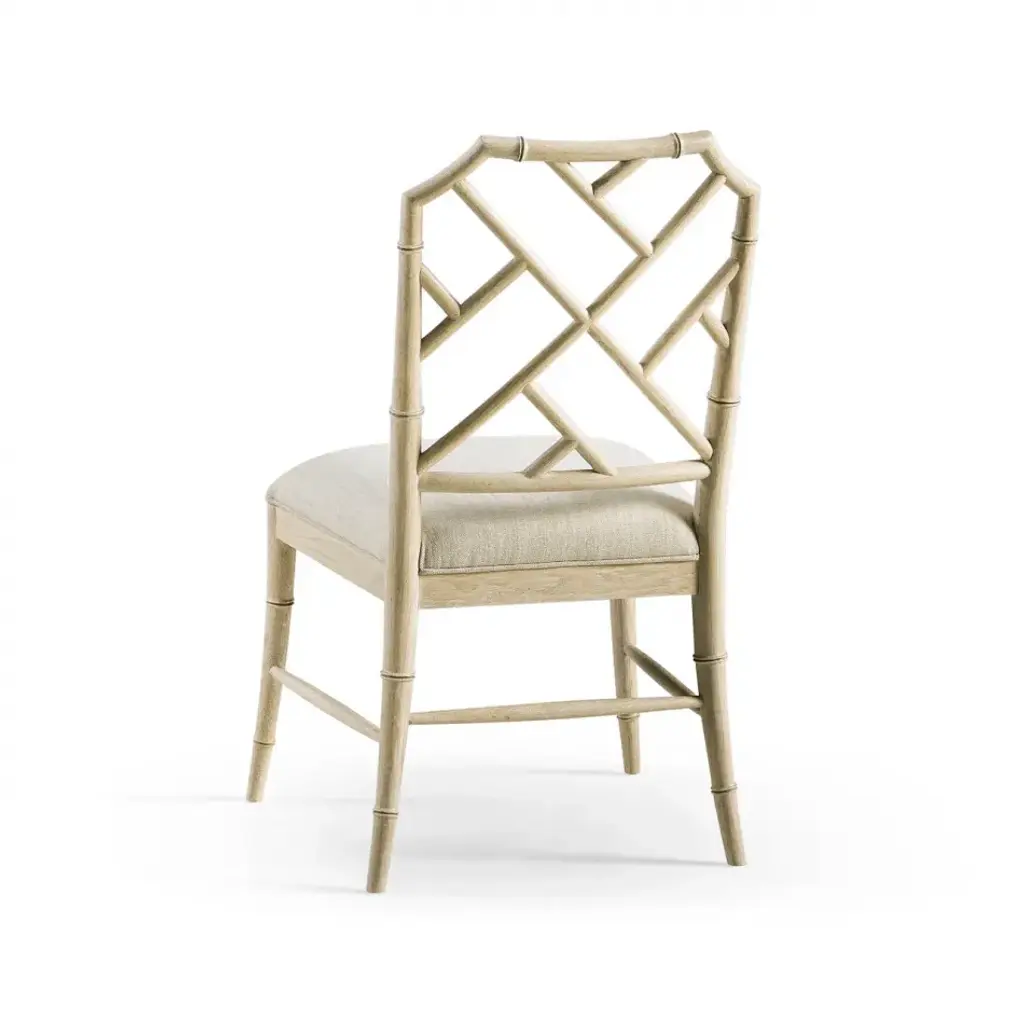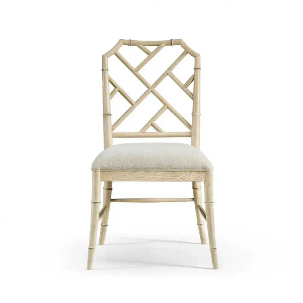 003-2-121-STO Created by the masterful Jonathan Charles craftsmen and women, the Saros Chippendale Bamboo Side Chair is a fresh and zany take on timeless design. A geometric design lattice back formed out of bamboo is finished in deliciously dry Stripped Oak with light distressing to create a masterful showstopper. Upholstered in earthy oatmeal performance fabric, the Saros chair adds comfort and intrigue to refined dining spaces.