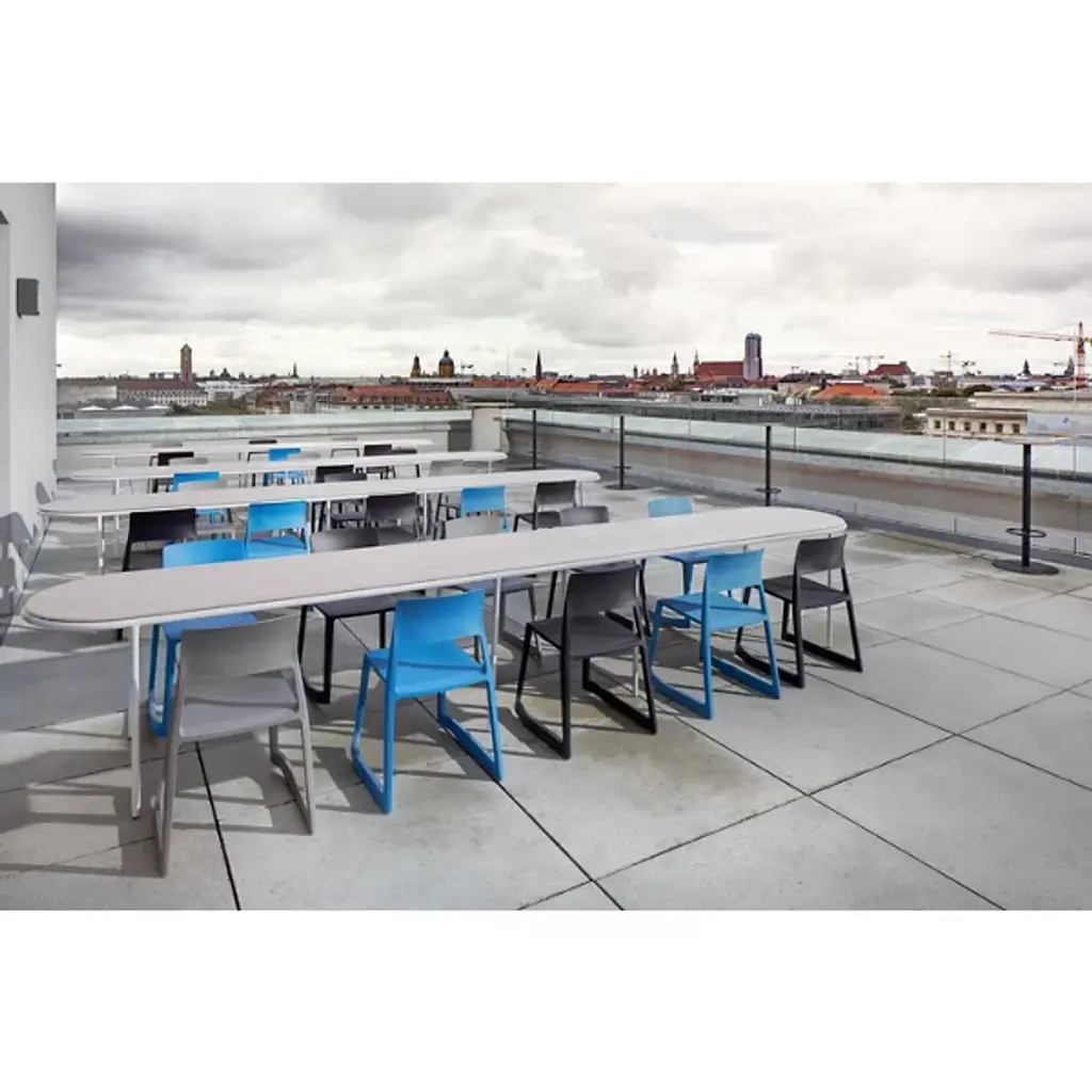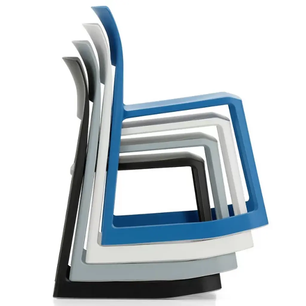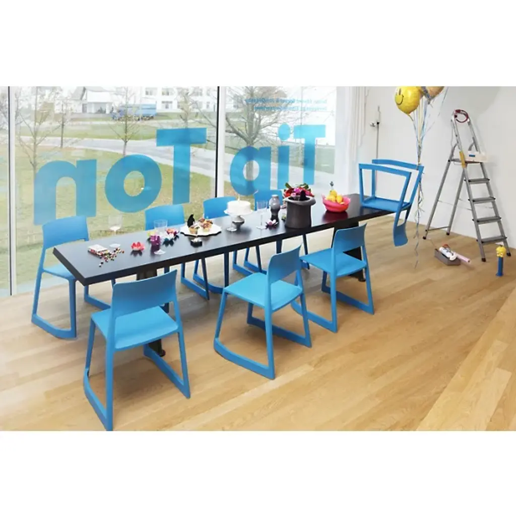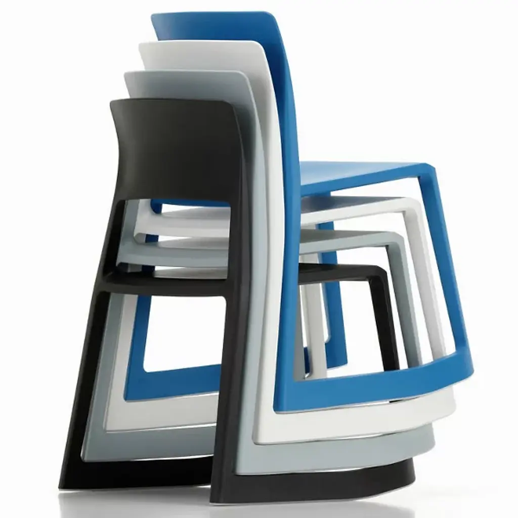 Two seating positions, indoors or out. The Vitra Tip Ton chair has a unique base that lets you sit up straight or tilt forward a few degrees for a particularly comfortable working or dining position. The range of colors available here are UV resistant, so they won't fade or otherwise discolor when used outdoors. Stackable up to 4 high.