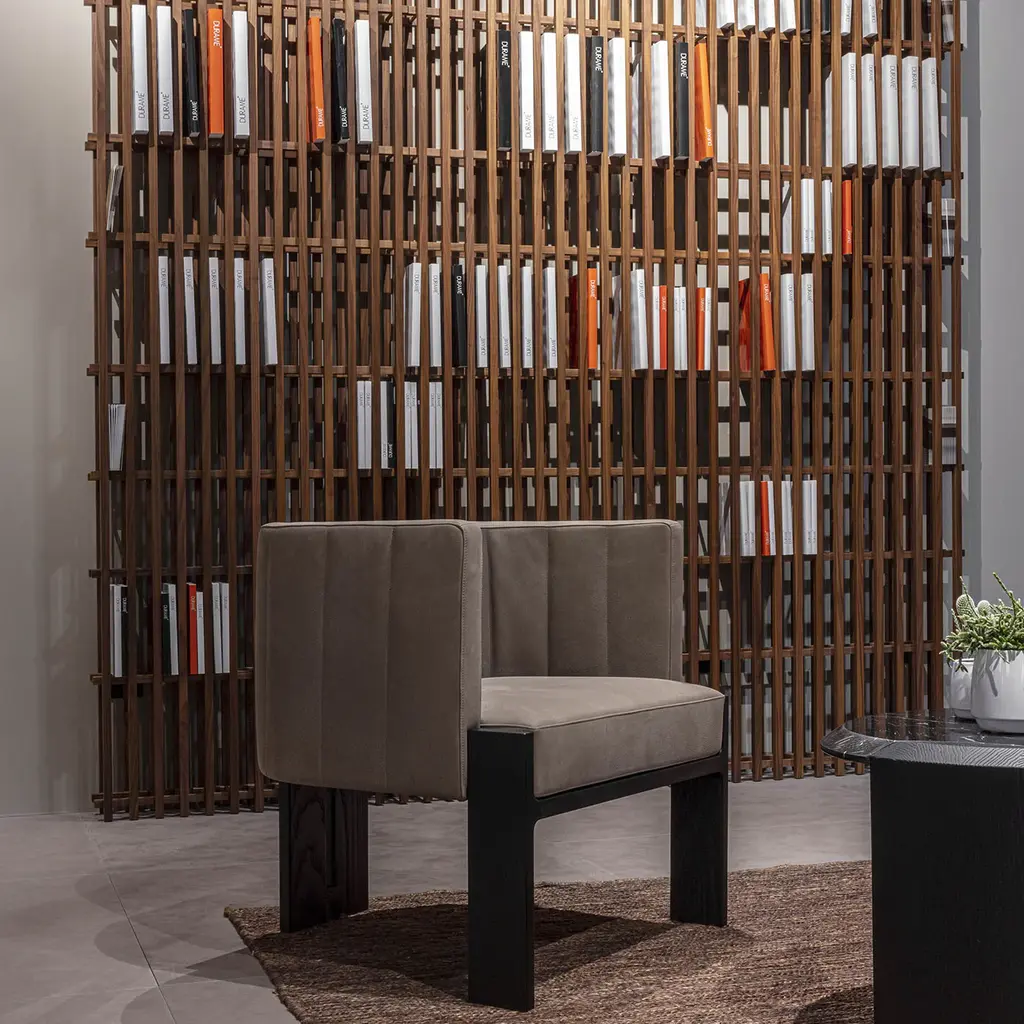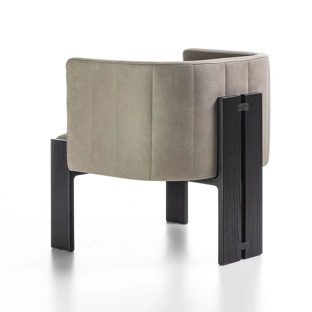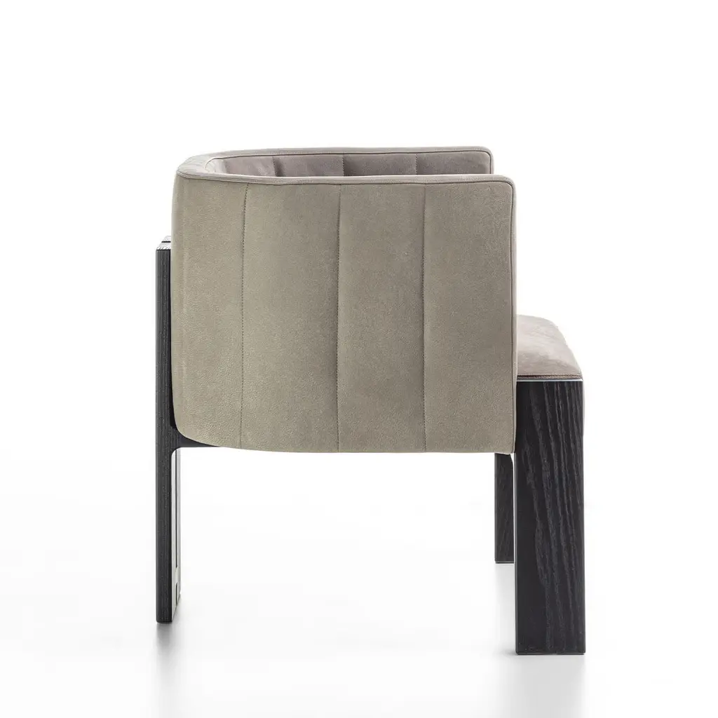 A neat contrast between enveloping curves and rigorously straight lines defines the sculptural look of this armchair, an exquisite solution to be gathered with twins around a dining or conference table, alike. Crafted of black-stained ash, the frame sustains a fully enveloping padded shell sealed by prized taupe leather. Please contact the Concierge for the chair variant.