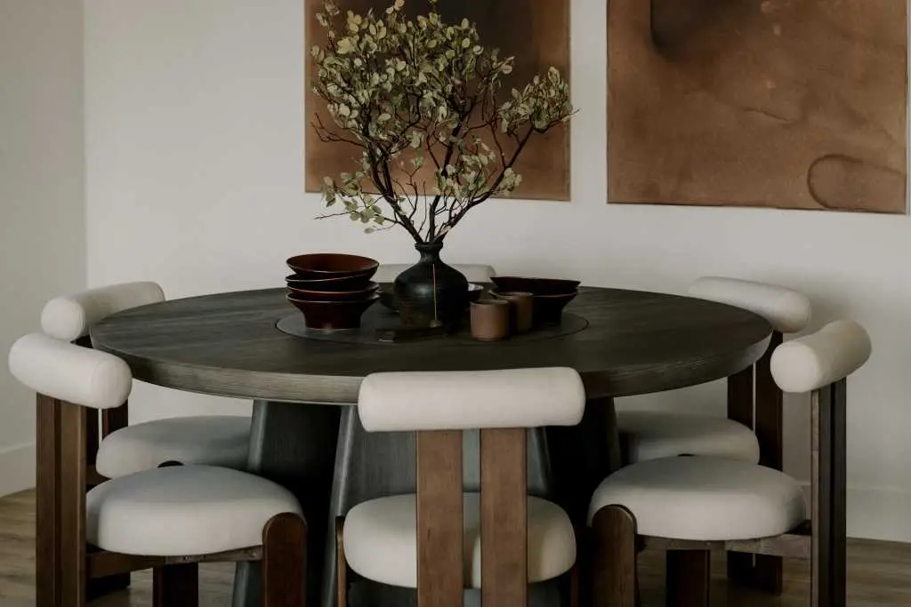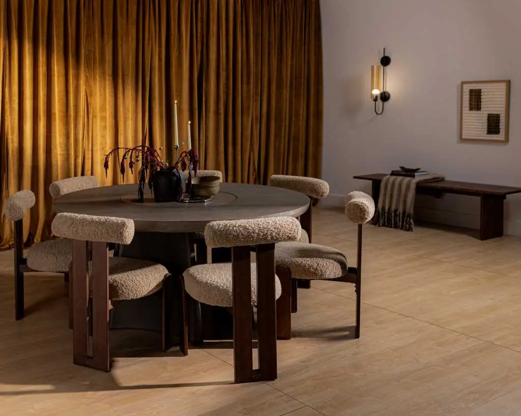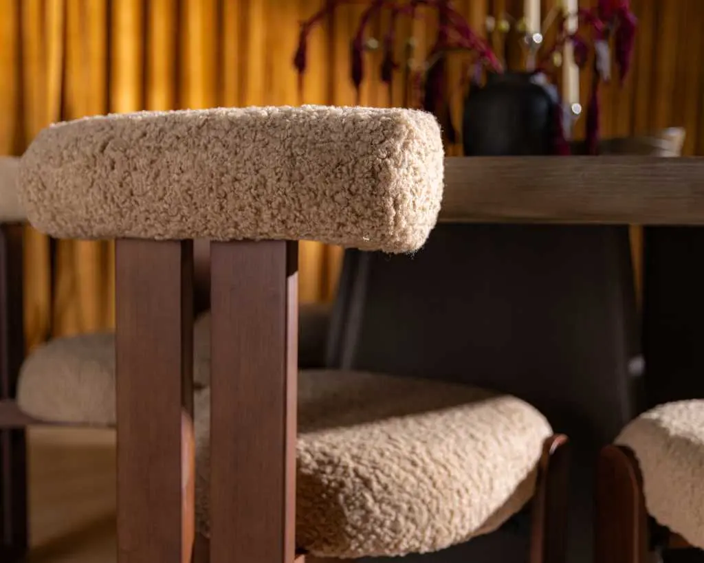 The Tola Dining Chair infuses any home with a sophisticated elegance, radiating a delightful harmony. With its plush, curved silhouette complemented by rich wood tones, the Tola effortlessly stands out in any dining room. Also available in a lounge chair version here.