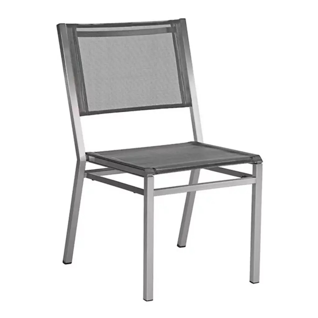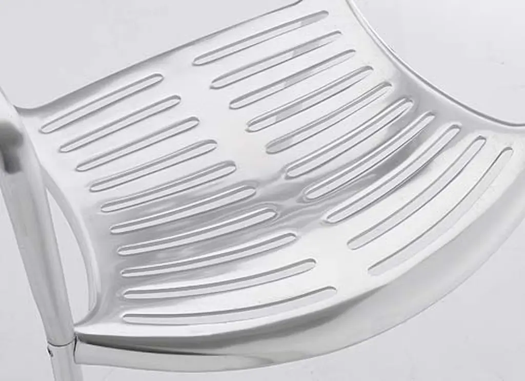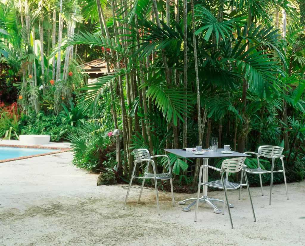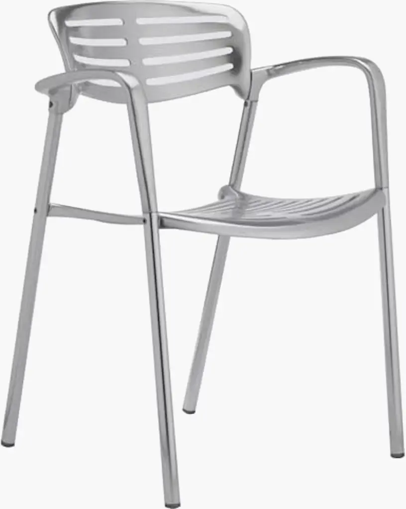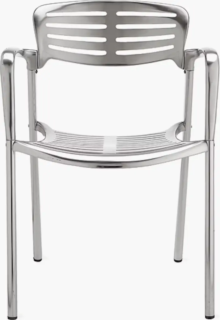 Completely recyclable, the Toldeo Chair (1986) by Jorge Pensi brings rugged strength and streamlined aesthetics to outdoor furnishings. This contract-quality chair is crafted of thermo-treated polished aluminum, a material that stays cool to the touch even in hot climates. The comfortable seat echoes the scale more typically found in dining chairs for indoor use and is made out of durable cast aluminum. Stackable up to four high for compact storage, the Toledo Chair is designed to coordinate with the Pensi Table, also by Jorge Pensi. The underside of the seat is stamped with the names Jorge Pensi and Knoll. Manufactured by Amat-3 for Knoll according to the exacting specifications of the designer. Made in Spain.