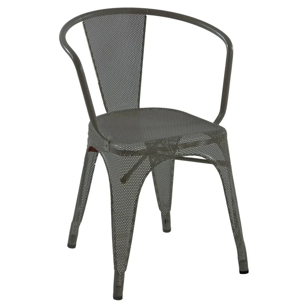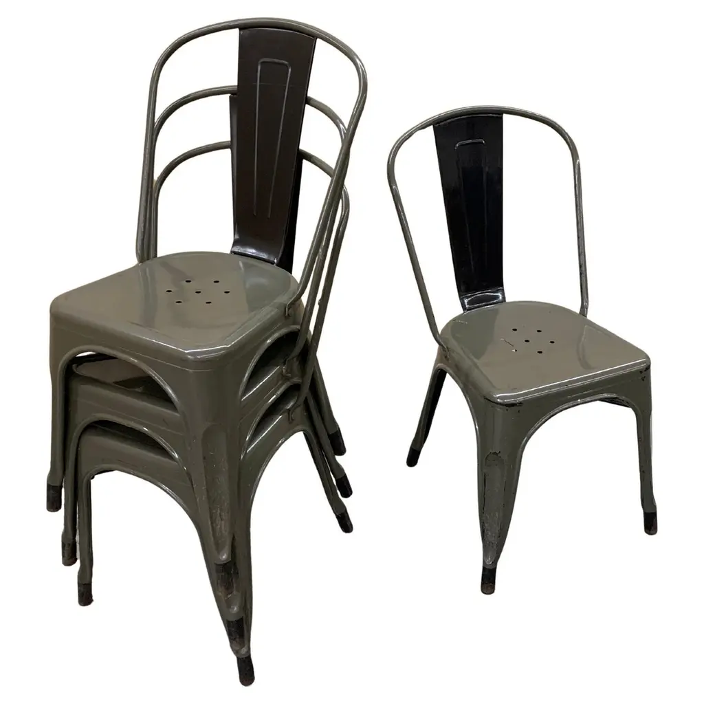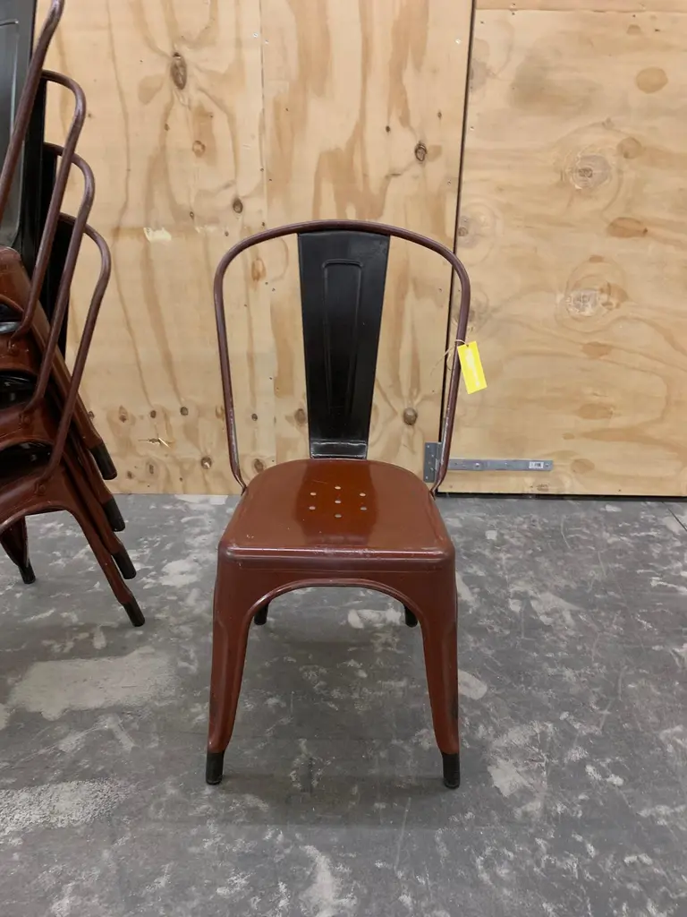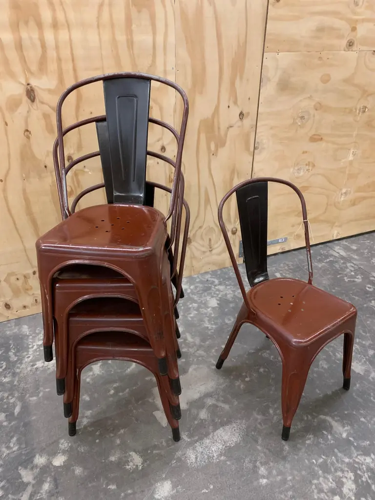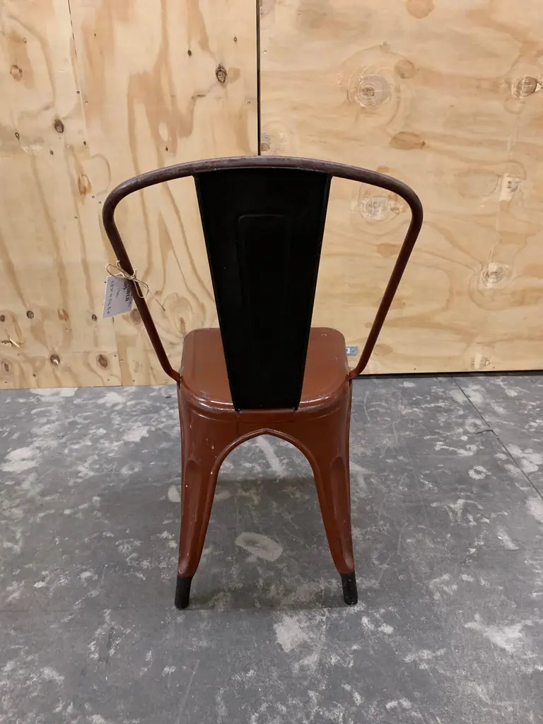Classic French Tolix chair, as designed by Xavier Pauchard in 1935. The metal chair is an icon of French design and this version is in burgundy red/brown and black. Great patina.Price is pr. piece. 12 pieces available.