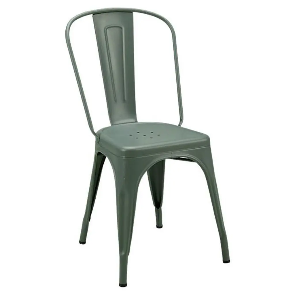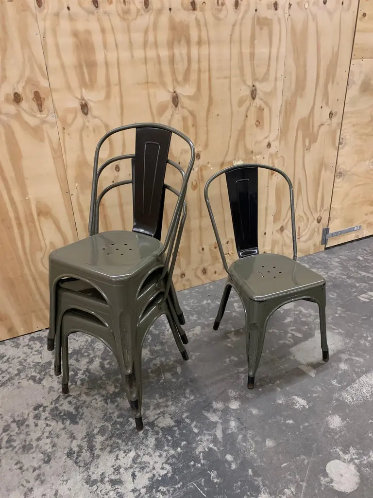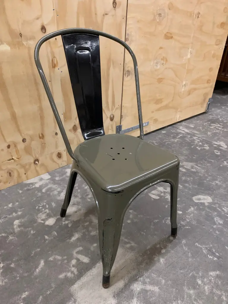 Classic French Tolix chair, as designed by Xavier Pauchard in 1935. The metal chair is an icon of French design and this version is in greenish grey and black. Great patina.Price is pr. piece.