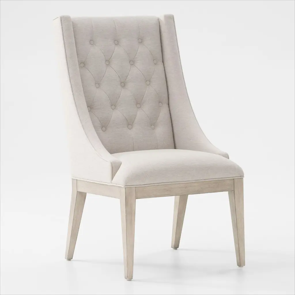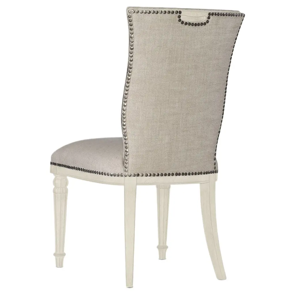 Inspired by European antiques and architecture, the Traditions side chair features classic carved French legs and a calming monochromatic color palette. The upholstered seat and back are adorned with nailhead trim, and a wood handle at the top of the back adds delightful details.