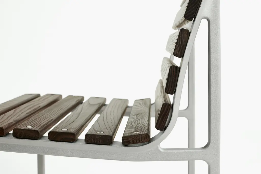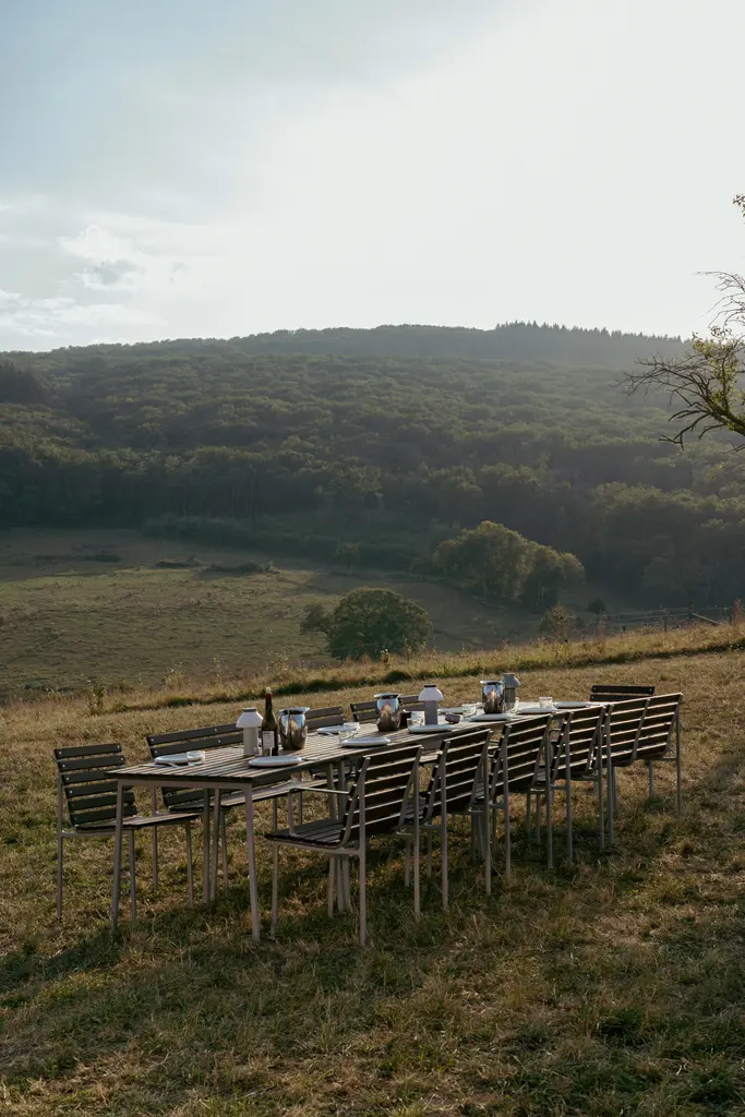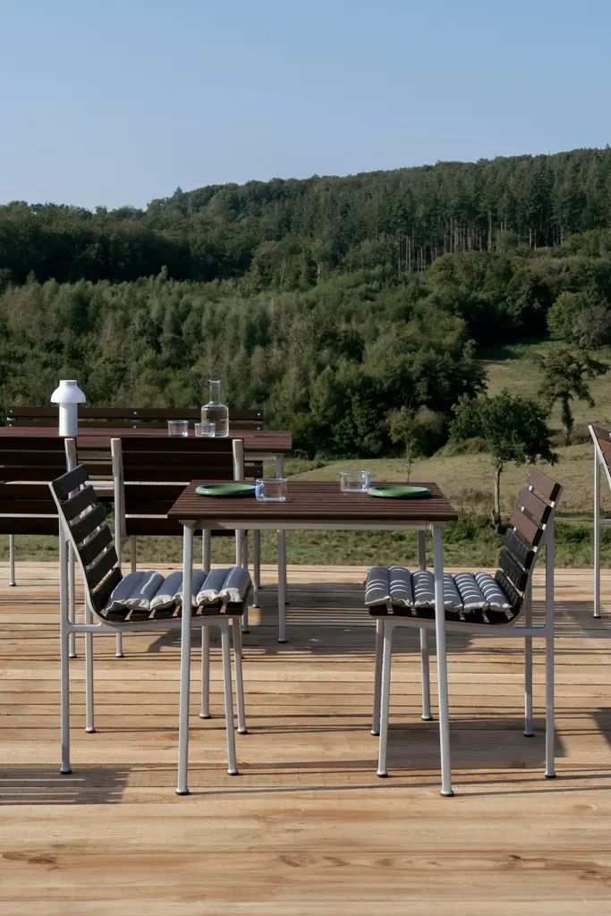 Designed by frequent HAY collaborator Erwan Bouroullec, the Traverse Side Chair (2025) brings a graceful yet robust beauty to outdoor entertaining. Its contoured aluminum frame supports heat-treated ash wood slats designed to beautifully patina over time. Inspired by the public benches of 19th-century Paris, the refined yet utilitarian side chair is ready to entertain in any setting - from urban courtyards to country gardens. Made in China.