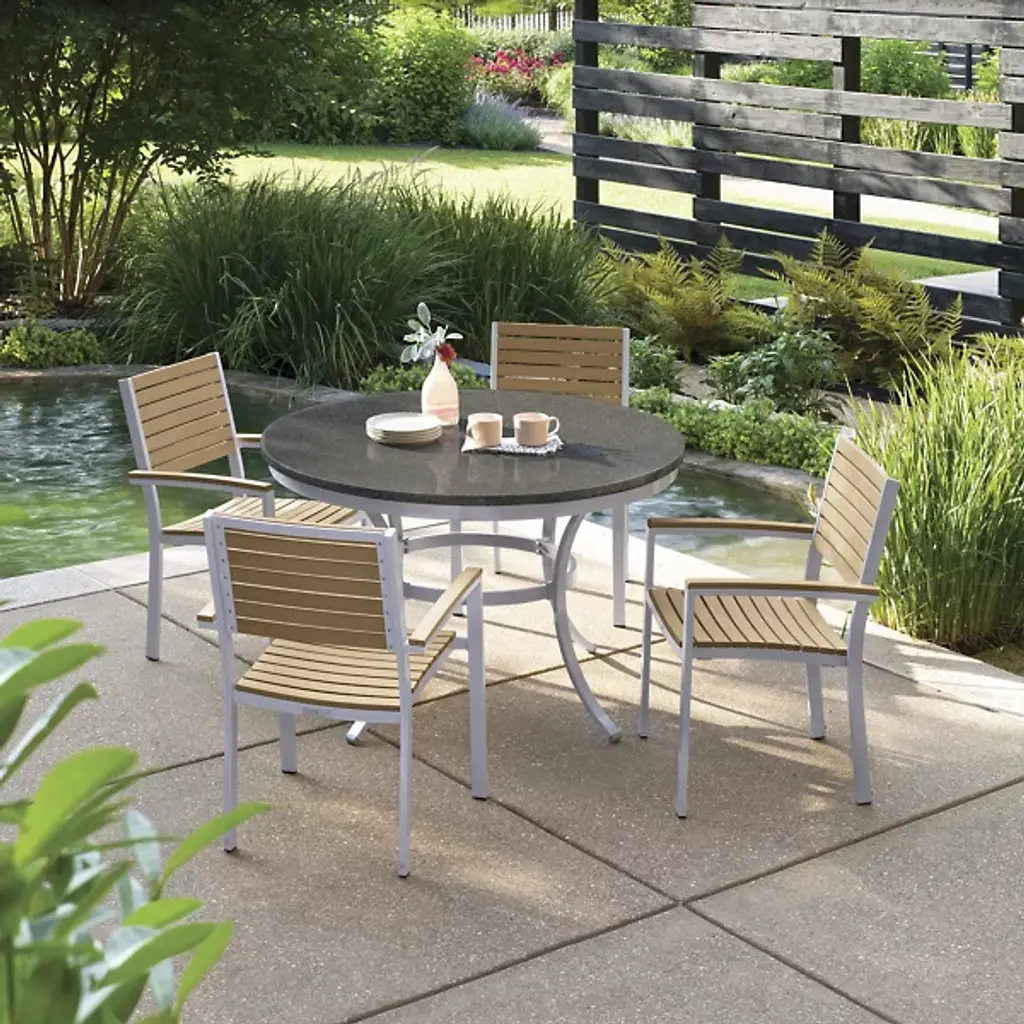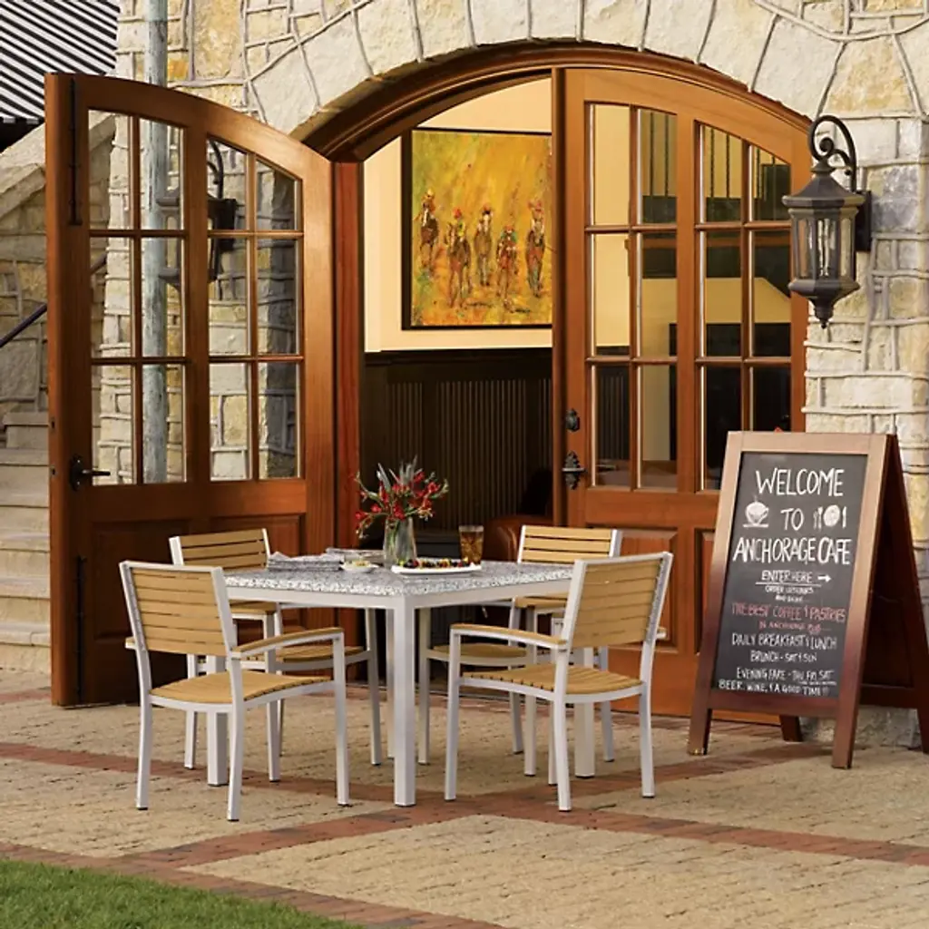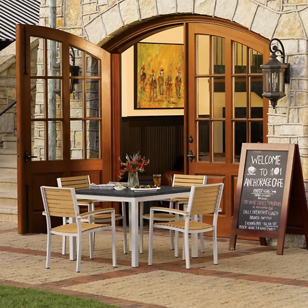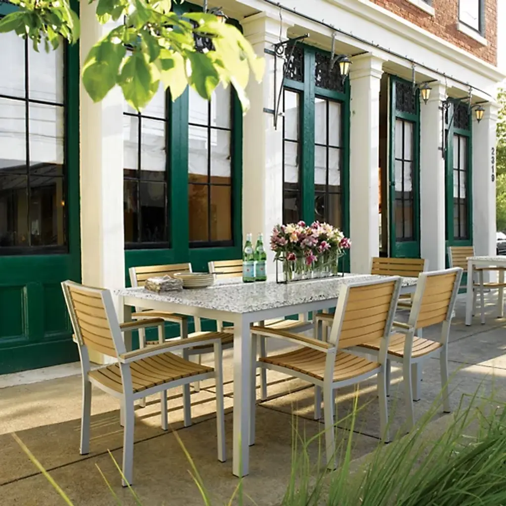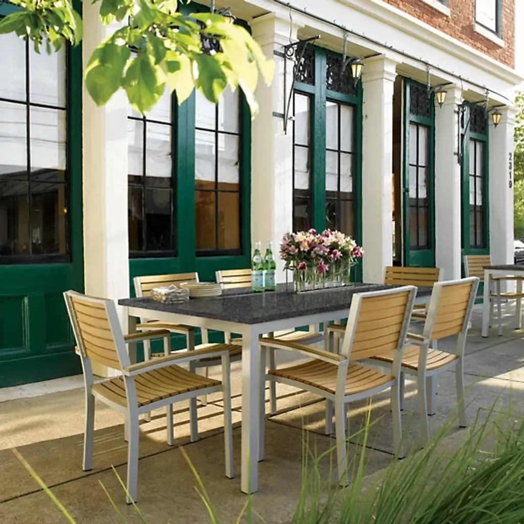 The Travira Tekwood Outdoor Armchair - Set of 4 by Oxford Garden may look like it’s made of wood, but it’s actually a synthetic wood alternative. Tekwood is a poly material with the texture and tone of teak; strips of it comprise the seat and back and adorn the armrests. Gentle curves provide comfort and contrast to the straight lines of the powder coated aluminum frame. Both materials are made to last and to look good in outdoor dining settings.