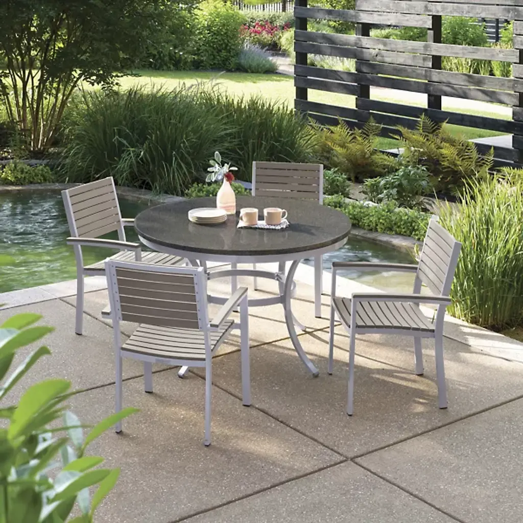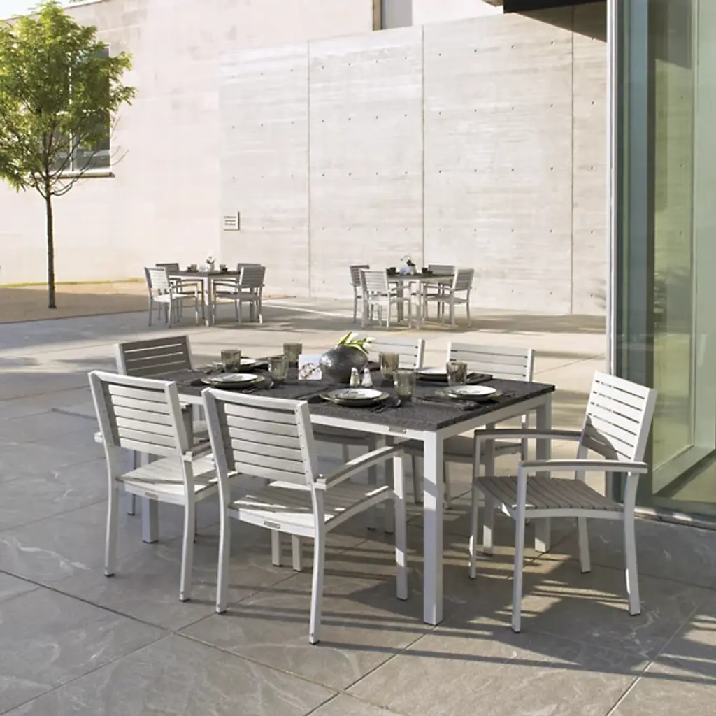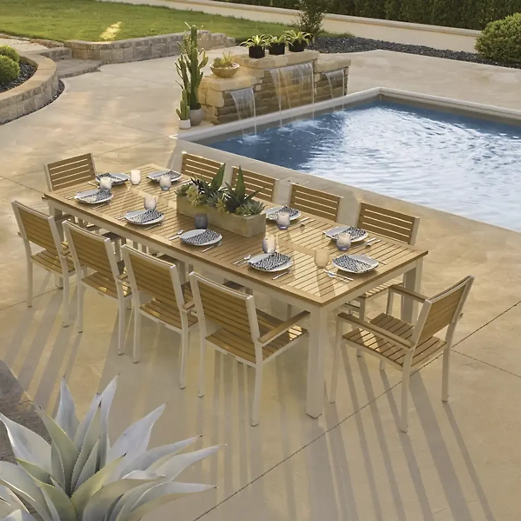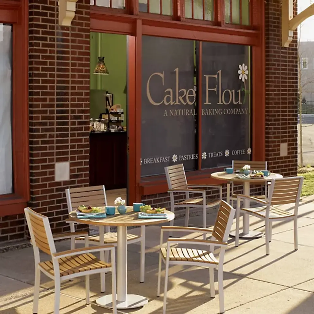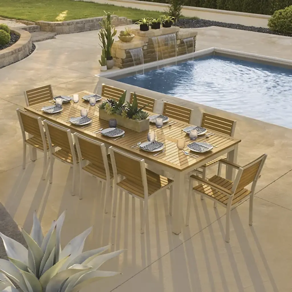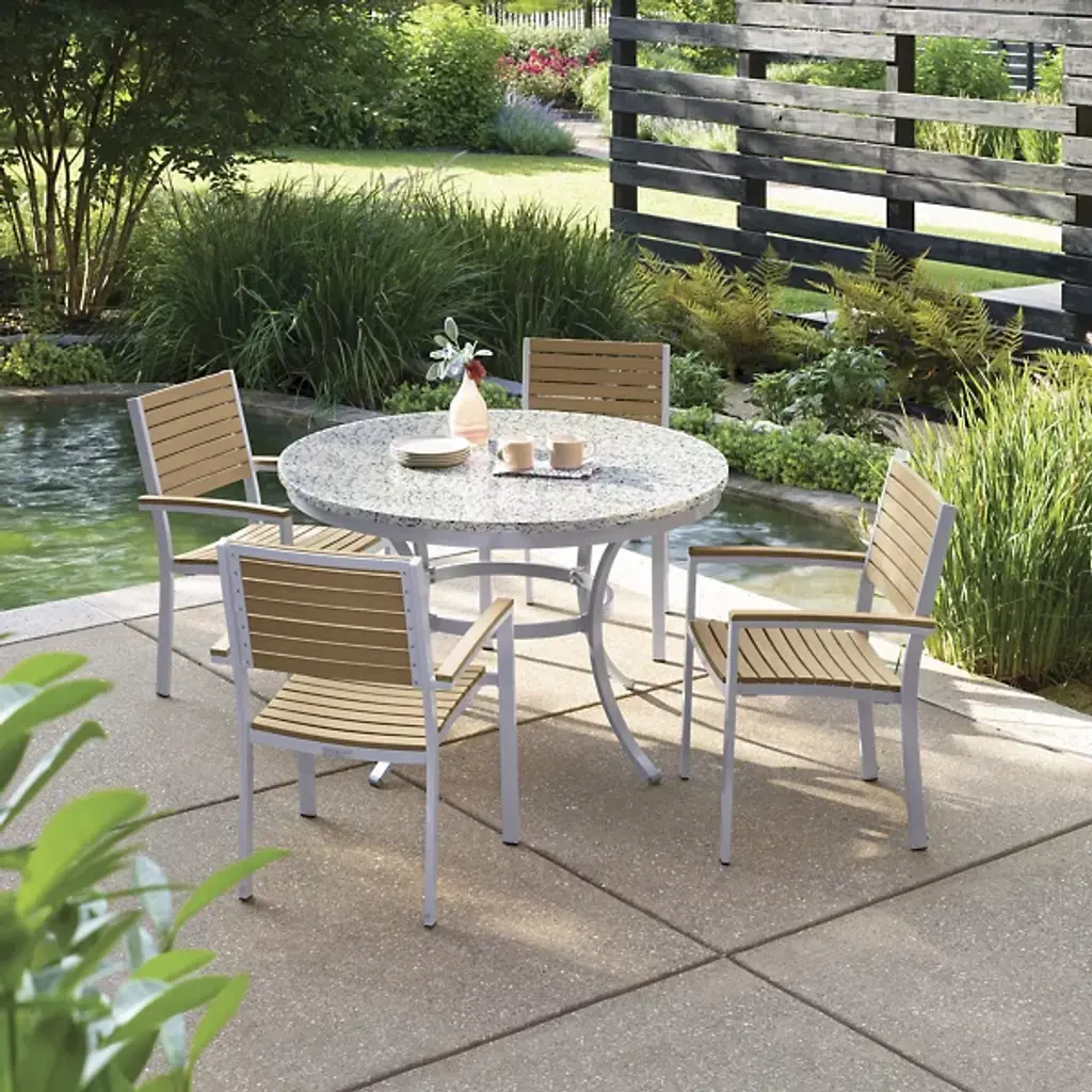 The Travira Tekwood Outdoor Armchair - Set of 4 by Oxford Garden may look like it’s made of wood, but it’s actually a synthetic wood alternative. Tekwood is a poly material with the texture and tone of teak; strips of it comprise the seat and back and adorn the armrests. Gentle curves provide comfort and contrast to the straight lines of the powder coated aluminum frame. Both materials are made to last and to look good in outdoor dining settings.