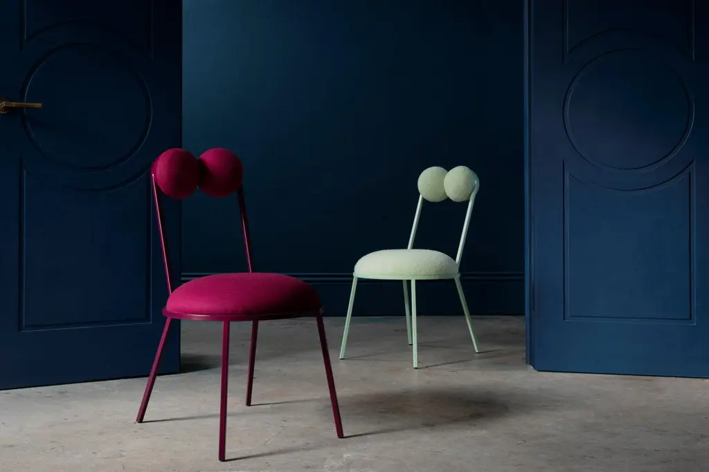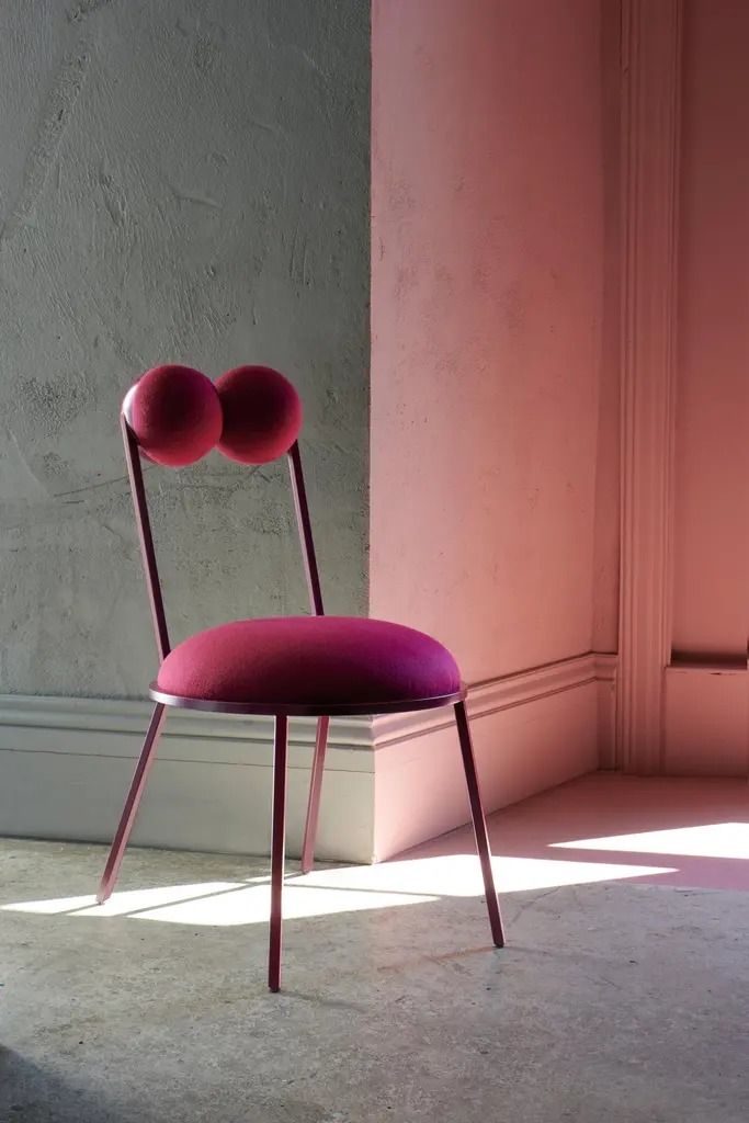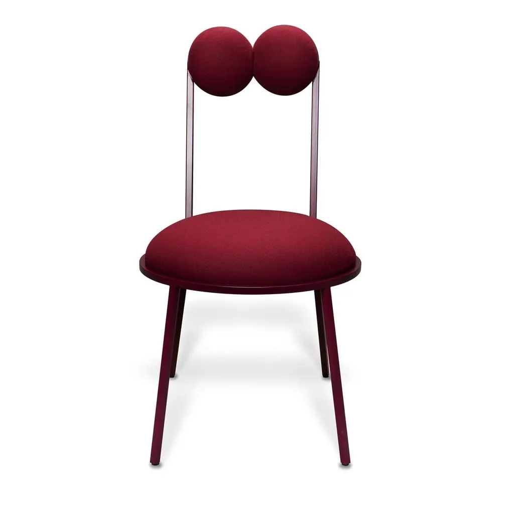 Trevor dining chair makes a perfect accompaniment for the tea room, its round spheres forming backrest and armrests, floating on thin metal rods, just like bonbons speared on cocktail sticks. Almost frog-like in its appearance, the chairs take the form of a friendly creature with a big mouth and bug-eyes. The chairs are made of powder coated steel, with soft upholstered seat and backrest and are available with and without armrests.Each piece of furniture is individually numbered and comes with a signed “Certificate of Authenticity” to prove that it is Bohinc Studio original.Material: Powder-Coated steel frame with wool fabric or viscose Dedar boucle fabricDimensions: 600 x 750 x H 860 mm.